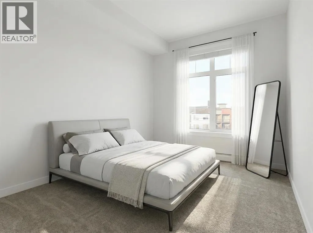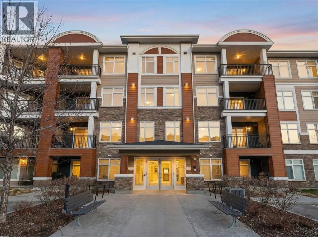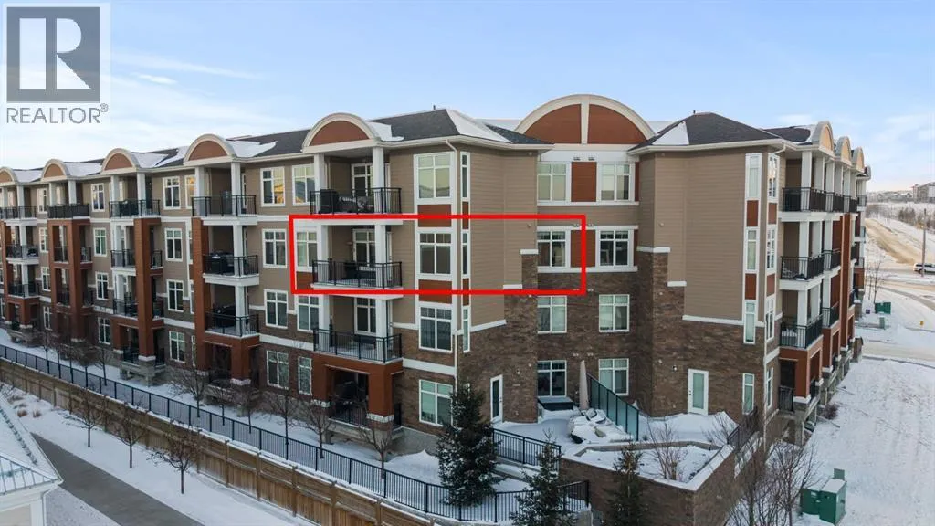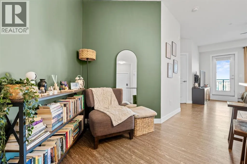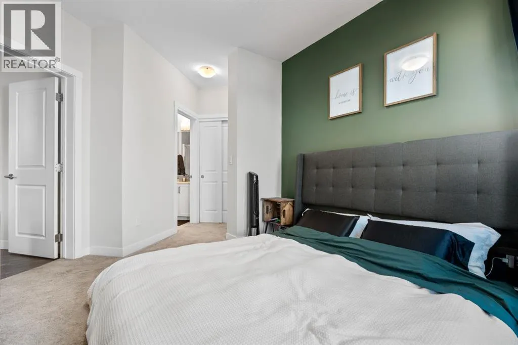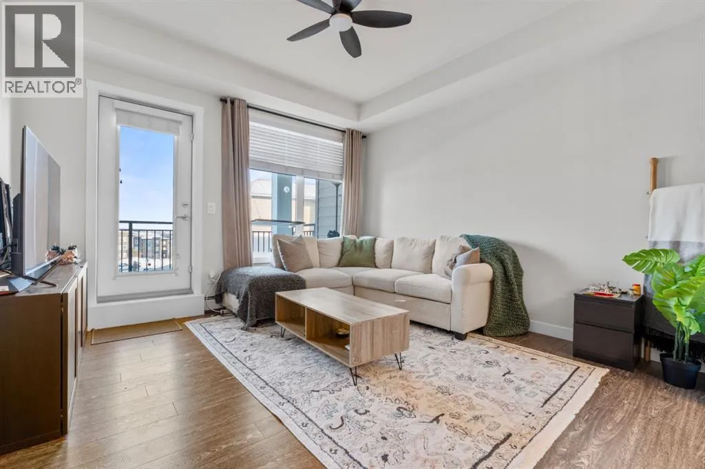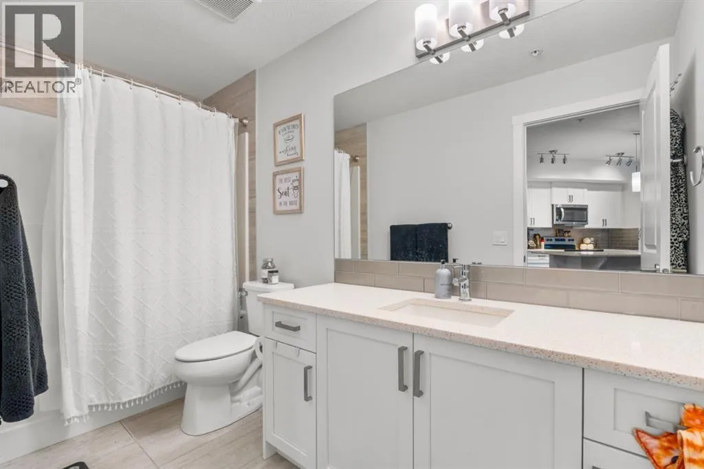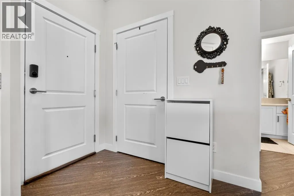 Welcome to this beautifully appointed two-bedroom, two-bathroom modern farmhouseâstyle condominium built in 2018, this is one of the larger units in the complex and features numerous builder upgrades throughout.The bright and spacious main living area showcases high ceilings and an open-concept design, seamlessly connecting the kitchen, dining, and living spaces. The contemporary kitchen is finished with sleek shaker-style cabinetry, upgraded backsplash, quartz countertops, and stainless steel appliances. A large island provides additional seating, while still allowing ample room for a full dining tableâideal for both everyday living and entertaining.Enjoy the east-facing balcony, perfectly positioned for morning coffee and comfortable afternoon shade. Expansive glass sliding doors flood the interior with natural light, enhancing the homeâs warm and inviting atmosphere.The primary bedroom offers generous proportions, complete with a walk-in closet and a private ensuite featuring a walk-in shower and added storage. The second bedroom is well-sized and versatileâideal for guests, a home office, or a childâs roomâwith a full bathroom conveniently located across the hall next to the in-suite laundry.Additional highlights include one oversized parking stall in the secured underground parkade, dedicated bike storage, and an assigned storage locker.This exceptional home combines style, space, and functionality. Contact us today to arrange your private viewing. (id:27476)