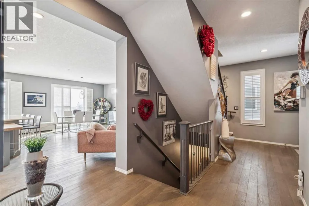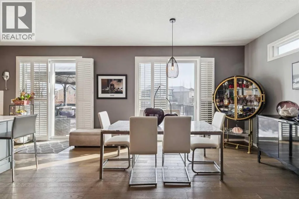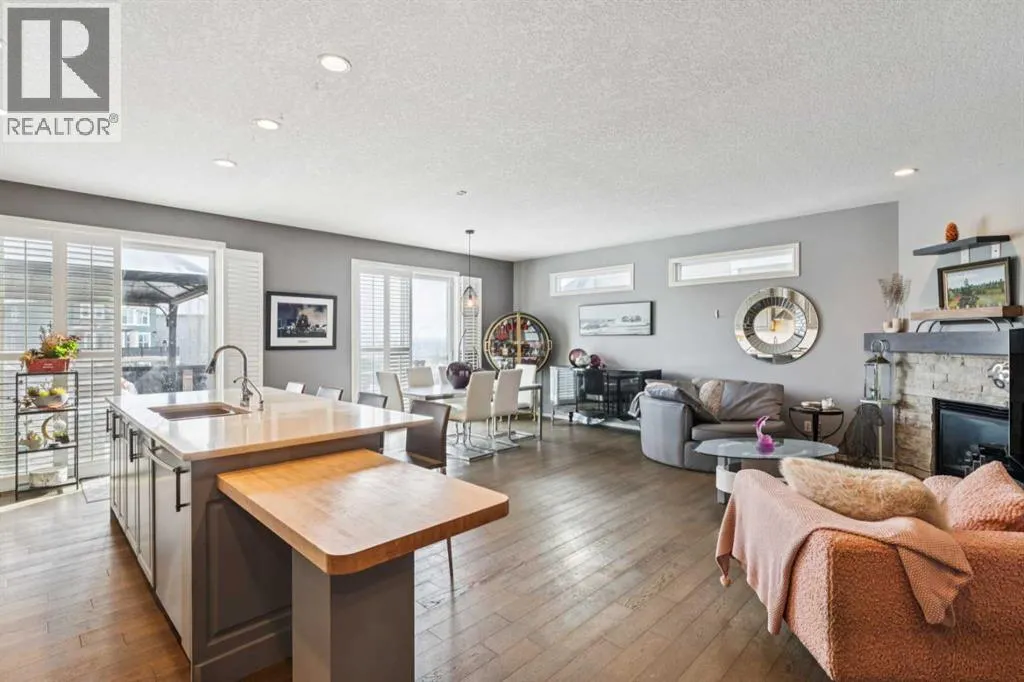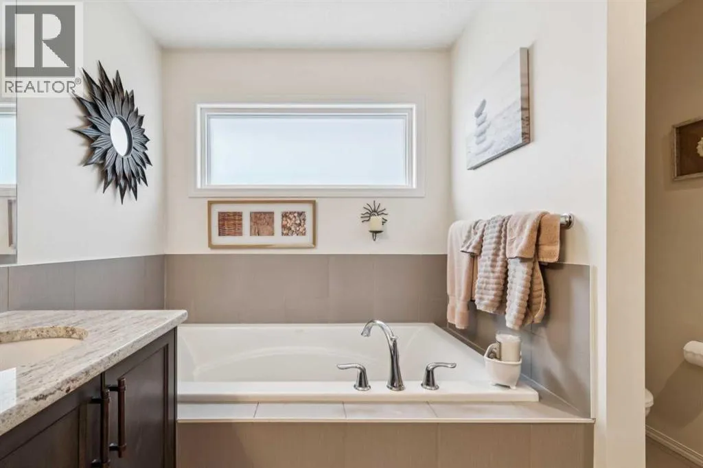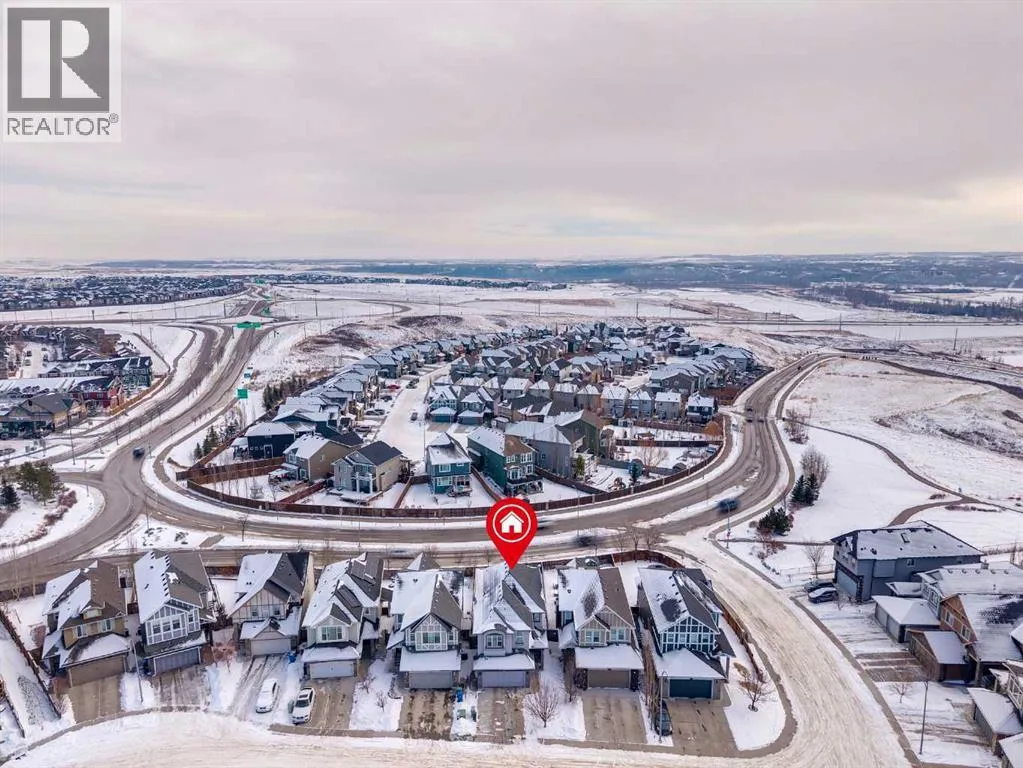 Located in the sought after community of Cranston! First time offered for sale, this 3-bedroom home offers over 2,100 sq ft of finished living space and is perfect for any family. The open floor plan of the main level provides for a perfect main living area. The kitchen, overlooking the dining and living room is complete with stainless steel appliances including gas cooktop, granite counter tops, oversized island with breakfast bar & bakers counter, walk-in pantry, and ceiling height cabinets. The living room overlooks the back yard and has a cozy corner gas fireplace. Also on this level is a 2-pc washroom & mudroom off the garage. The upper level offers 3 nice sized bedrooms, a 4-pc bathroom and laundry room. The large family room has vaulted ceilings and large windows making it nice and bright. The primary suite offers a large walk-in closet and a 5-pc ensuite that includes a soaker tub and walk-in shower. The basement is untouched and provides the perfect opportunity to add additional living spaces. Recessed lighting, hardwood floors, and vinyl window shutters are found throughout this well-maintained home. The landscaping is low maintenance with artificial turf in the backyard and rock in the front. The SE facing backyard is perfect for entertaining with a large dura deck off the kitchen that leads to a lower deck with hot tub and plenty of space for lounging and grilling. Walking distance to the amenities of Cranston Corner & Cranston Market. Perfectly situated steps to the Cranston Escarpment View Point & trails. Close to schools & the Calgary Health South Campus. Commuting is easy with quick access to Stoney Trail, Deerfoot Tr & MacLeod Tr. (id:27476)
