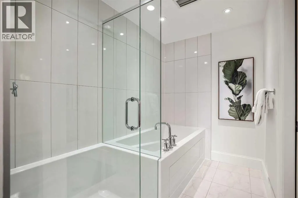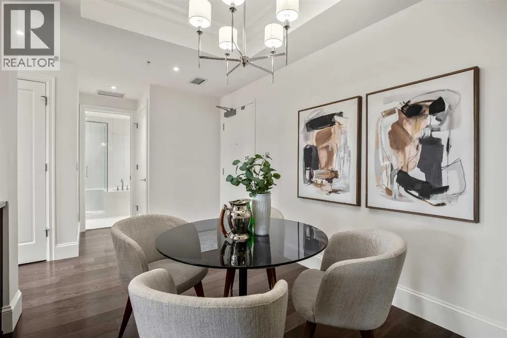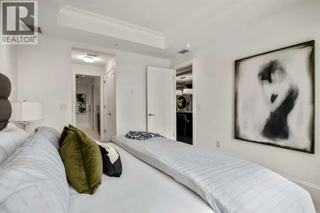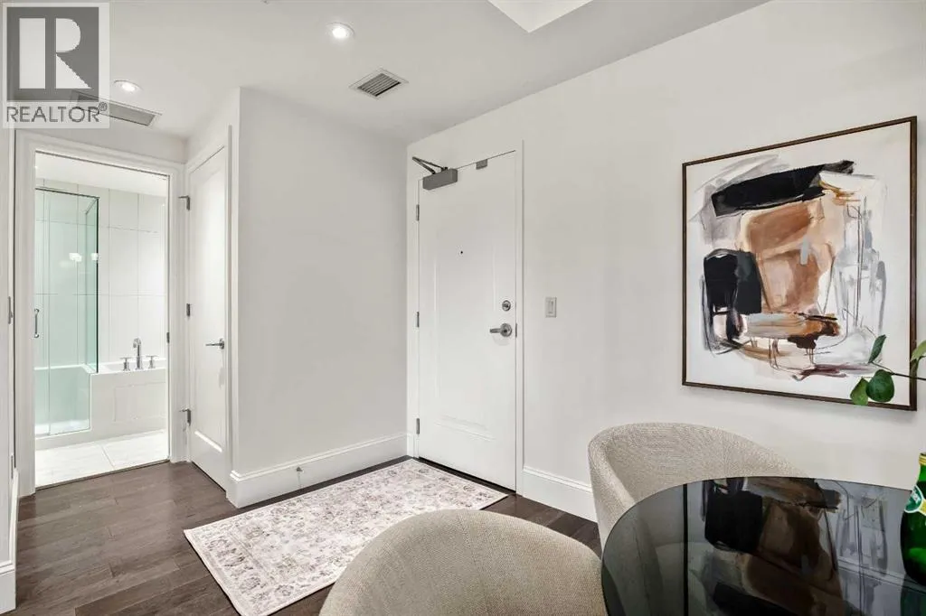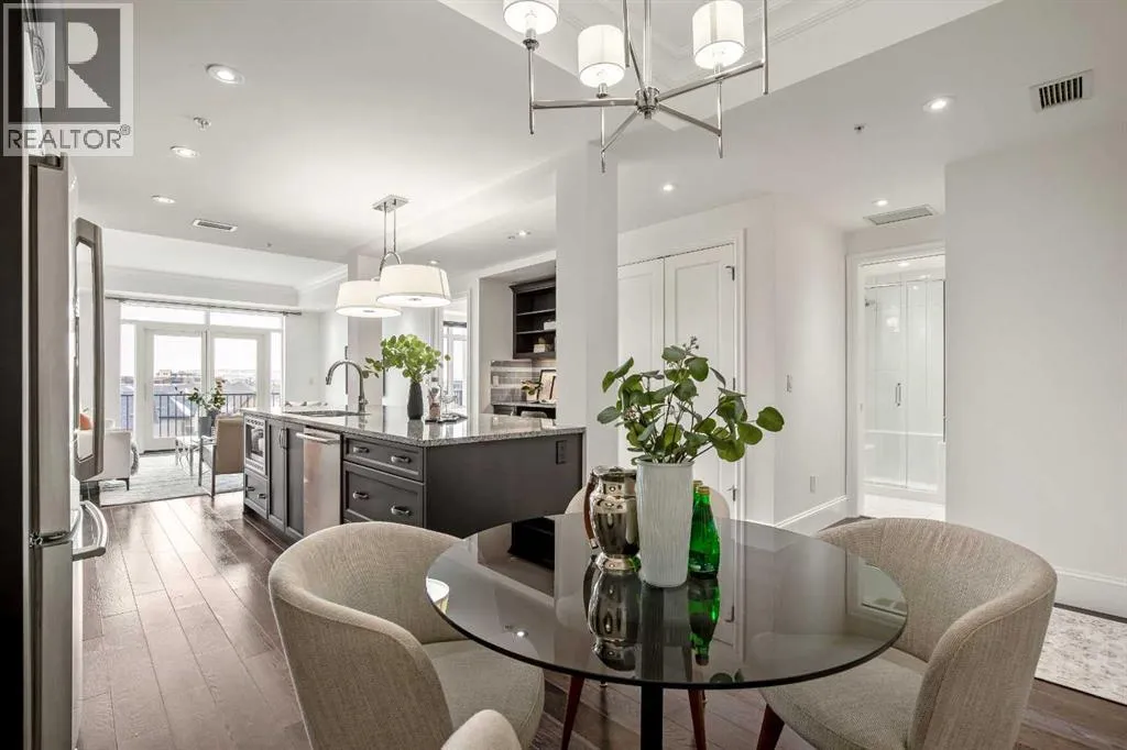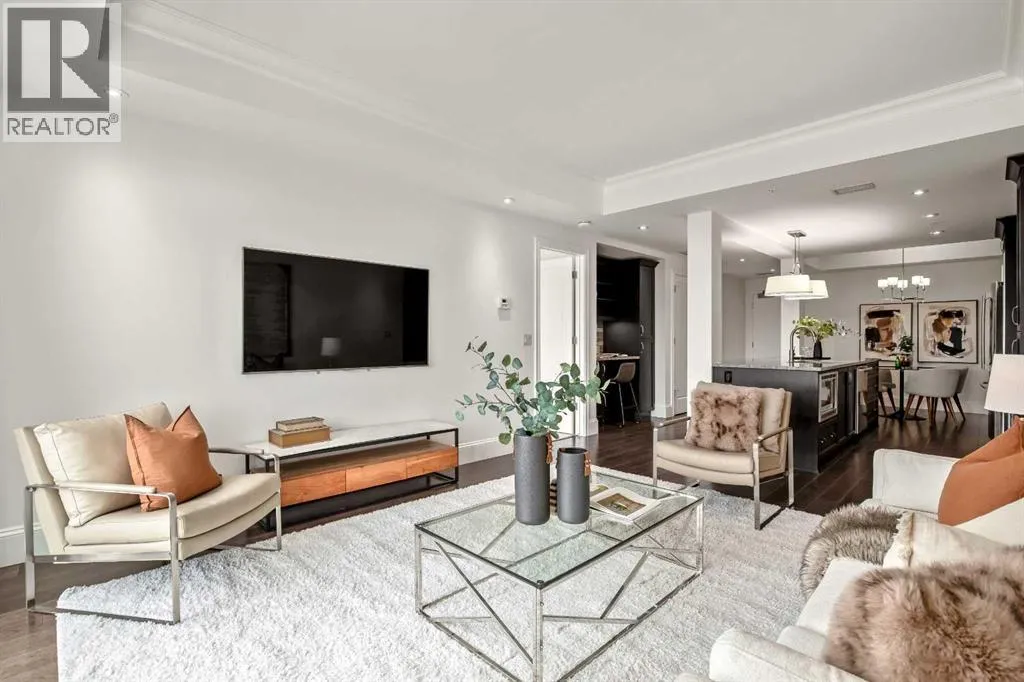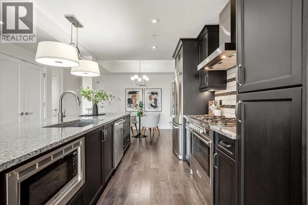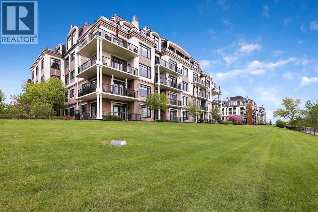 Experience luxury condo living in this beautiful, immaculately maintained 1-bedroom, 1-bathroom residence in this exquisite Champagne development. The unbeatable location has you walking out of your building just steps from the Bow River Pathway system, walking distance to Sue Higgins Off-Leash Dog Park, quick access to Deerfoot Trail, and walking-distance to shopping, restaurants, YMCA and more. This unit is located on the 4th floor of this quiet complex, delivering âpenthouse qualitiesâ with no overhead balcony, allowing natural light to flood the space. The interior is rich with quality and taste, featuring fresh paint, new carpet in the bedroom, a brand new microwave, tray ceilings, engineered hardwood flooring, 9 ft ceilings, marble tile, and top-of-the-line finishings. The chef's kitchen is centrally located within the unit, outfitted with premium stainless-steel appliances, including a gas range, an oversized granite island, soft-close cabinetry, making it perfect for entertaining or everyday casual dining. The bedroom can easily accommodate a king-size bed and more. The spa-like ensuite bathroom invites relaxation, offering a soaker tub as well as a tile shower. Enjoy the convenience of underground parking stall, a titled storage unit, bicycle storage, and a car wash bay. (id:27476)