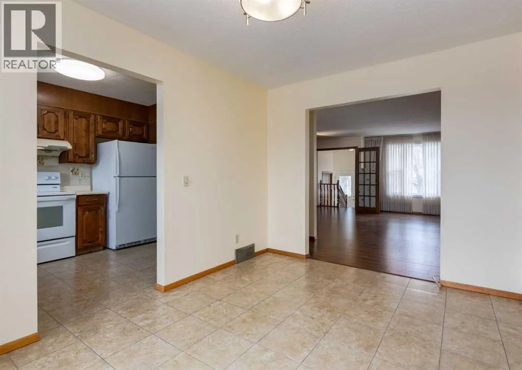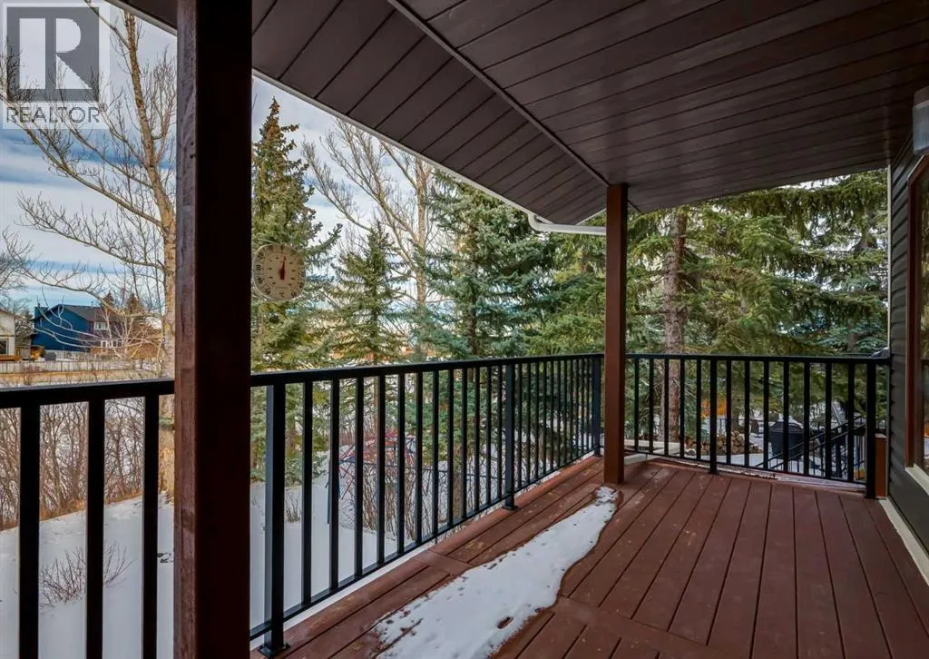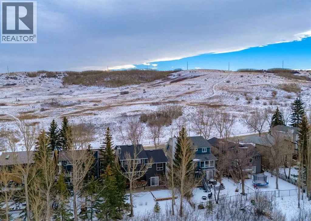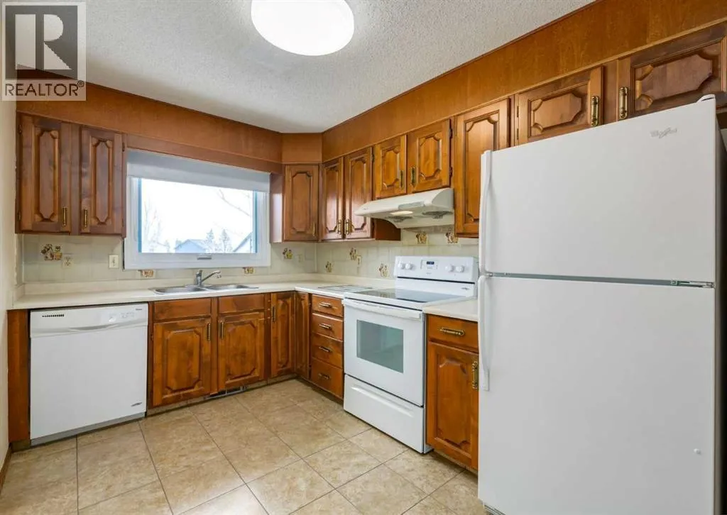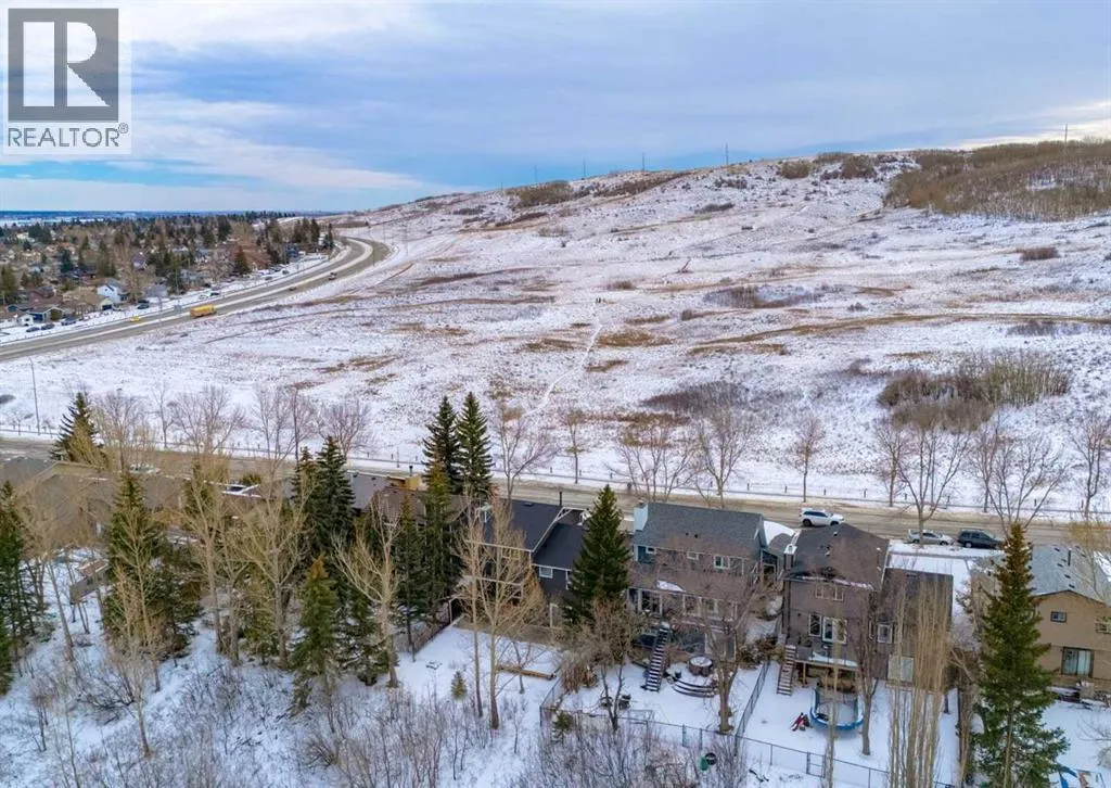 Situated directly across from Nose Hill Park and backing onto a tranquil ravine, this rare four-level split offers an exceptional blend of privacy, character, and unbeatable location. With no neighbours in front or behind, youâll enjoy year-round views and direct access to one of Calgaryâs most iconic natural spaces. Thoughtfully maintained and full of timeless architectural charm, the home welcomes you with a spacious foyer leading to a bright living and dining area featuring laminate flooring, a classic wet bar, custom built-in wood bookshelves, and elegant French doors that create separation while maintaining an open feel. The kitchen retains its original cabinetryârich with characterâcomplemented by tile flooring and a large window overlooking the backyard and green space beyond. Upstairs, youâll find three generous bedrooms including a spacious primary retreat complete with a walk-in closet and private 4-piece ensuite. An additional full bathroom serves the upper level.The third level offers a warm and inviting great room anchored by an original wood-burning fireplace. Sliding patio doors lead to the renovated covered deckâan ideal setting for morning coffee or evening gatherings overlooking the ravine. This level also features a convenient 2-piece bath, laundry area, side entrance access, and entry to the attached garage. The fully developed walkout basement impresses with soaring 10â ceilings, a fourth bedroom, den/home office, 3-piece bathroom, and ample storage. Patio doors open directly to the lower-level patio and private backyard, seamlessly connecting indoor and outdoor living. Recent updates include asphalt shingles (2025), siding and eavestroughs (2025), vinyl windows, driveway, and a renovated deck and patio. Located just minutes from Creekside Shopping Centre, Superstore, Costco, schools, the Calgary Winter Club, and offering quick access to Stoney Trail and Deerfoot Trail, this home combines natural beauty with everyday convenience in one of Calga ryâs most family-friendly communities. Opportunities like thisâacross from Nose Hill and backing onto a ravineâare exceptionally rare. Click the media link for the full video tour and book your private showing today. (id:27476)