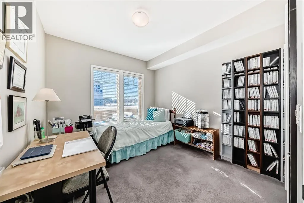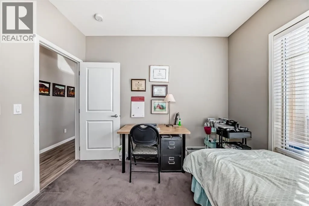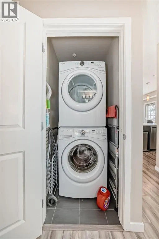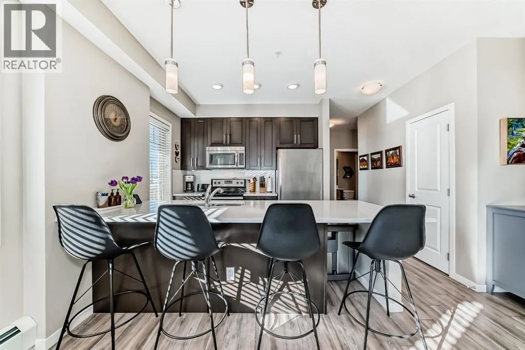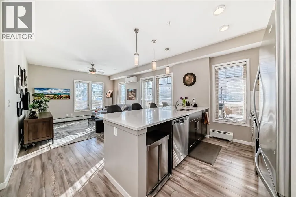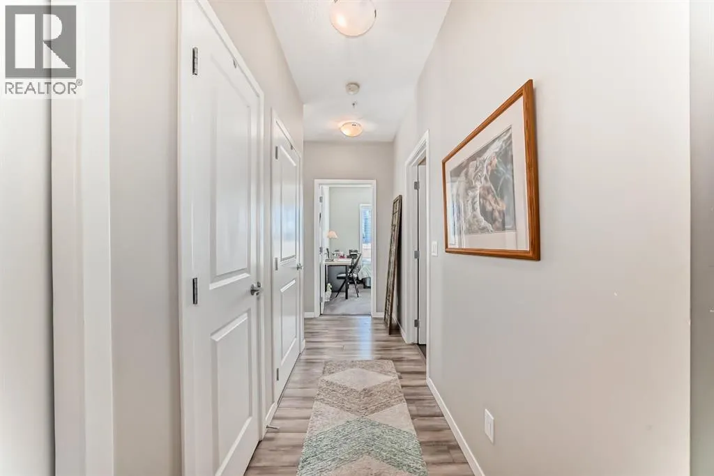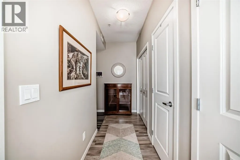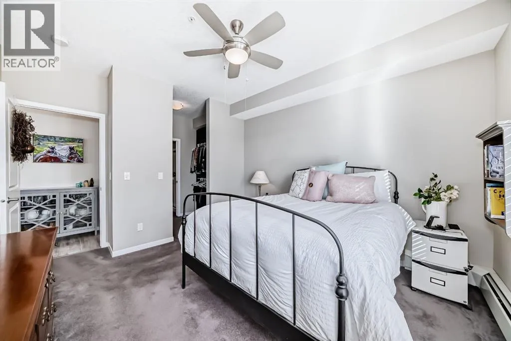 *** OPEN HOUSE SATURDAY APRIL 4TH 12:00-2:00PM ***Welcome to this beautifully maintained 2 bedroom, 2 bathroom corner unit in an unbeatable location. With desirable south facing exposure, this home is filled with natural light throughout the day, creating a warm and inviting atmosphere. The thoughtfully designed layout offers a rare hallway entrance that opens into a bright, open concept living space, creating both privacy and flow. A front entry closet and two additional pantry closets provide exceptional storage, while in unit laundry adds everyday convenience. The primary bedroom features built in shelving within the walk in closet and a private 3 piece ensuite bathroom. Stainless steel appliances were updated in 2019, and air conditioning keeps the space comfortable during the summer months, making this home truly move in ready. Step outside onto the impressive 36 foot south facing balcony with mountain views, an ideal extension of your living space to enjoy a quiet morning coffee or relax in the evening sun. Additional highlights include heated underground parking with a storage locker conveniently located directly in front of the stall, stairwell access just outside the unit, and a private gym within the building. Situated in a vibrant, amenity rich community with shops, dining, schools, and everyday essentials within walking distance, this is condo living at its best. Don't forget that you will have lake access all year round for swimming and skating! A wonderful opportunity to own in a highly sought after neighbourhood. (id:27476)