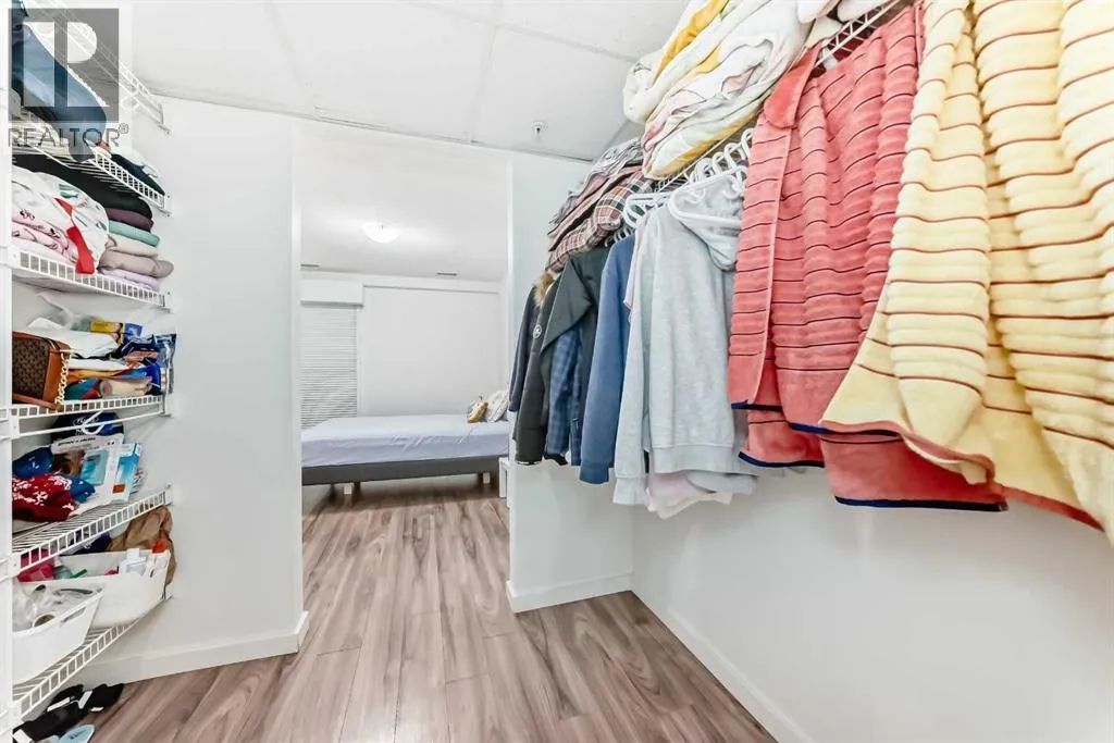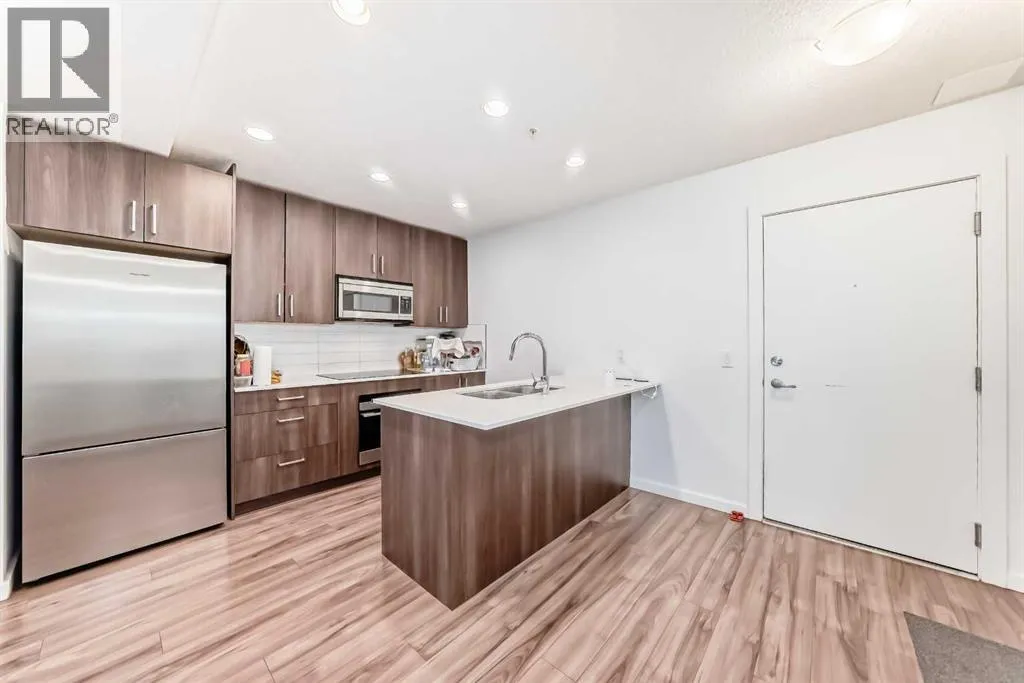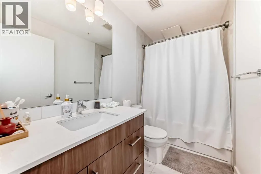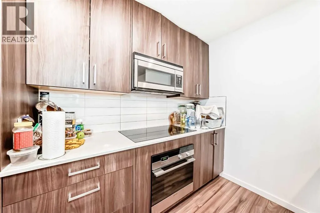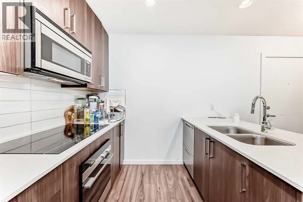 CONCRETE AND STEEL FRAME CONSTRUCTION offering superior noise reduction, reduced insurance costs, and exceptional durability. The building features high-efficiency boilers and HRV systems, with geothermal heating and cooling throughout. Equipped with Cat 5(e) wiring for advanced data and phone connectivity. This spacious 2-bedroom, 2-bathroom unit includes a den, in-suite laundry, and a titled underground parking stall. Designed with modern finishes, the interior boasts wide plank laminate flooring, bright polished white quartz countertops, and premium European-designed Fisher & Paykel appliances, including a dishwasher, induction cooktop, and convection microwave/hood fan combo. Stackable Whirlpool laundry machines are included, and the refrigerator is equipped with a microprocessor that monitors usage to extend food freshness. The primary suite features a walk-in closet and a full ensuite. Ideally located just steps from the C-Train station, shopping, and minutes from Westhills and downtown. Currently tenant occupied on a month-to-month basisâ24 hours' notice required for showings. (id:27476)