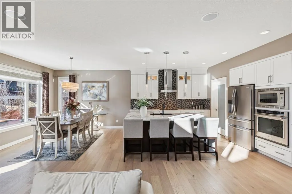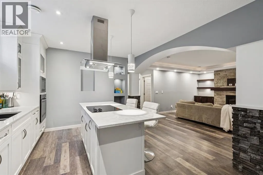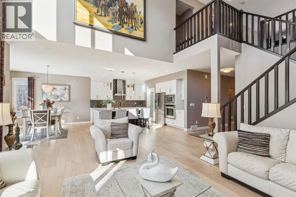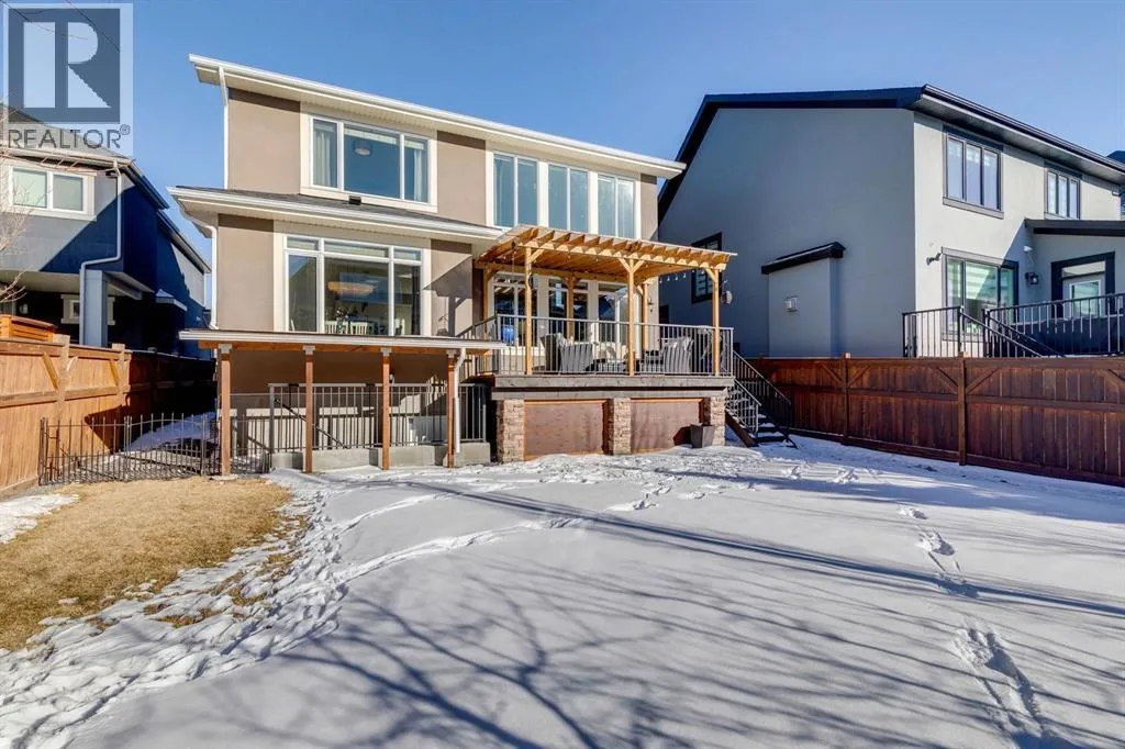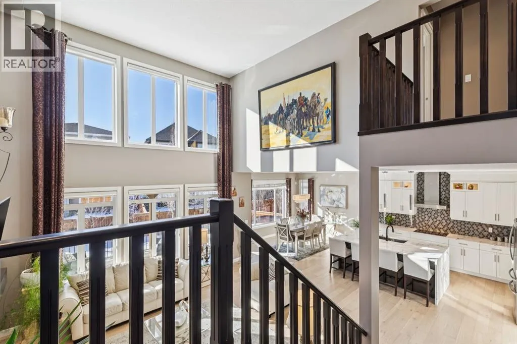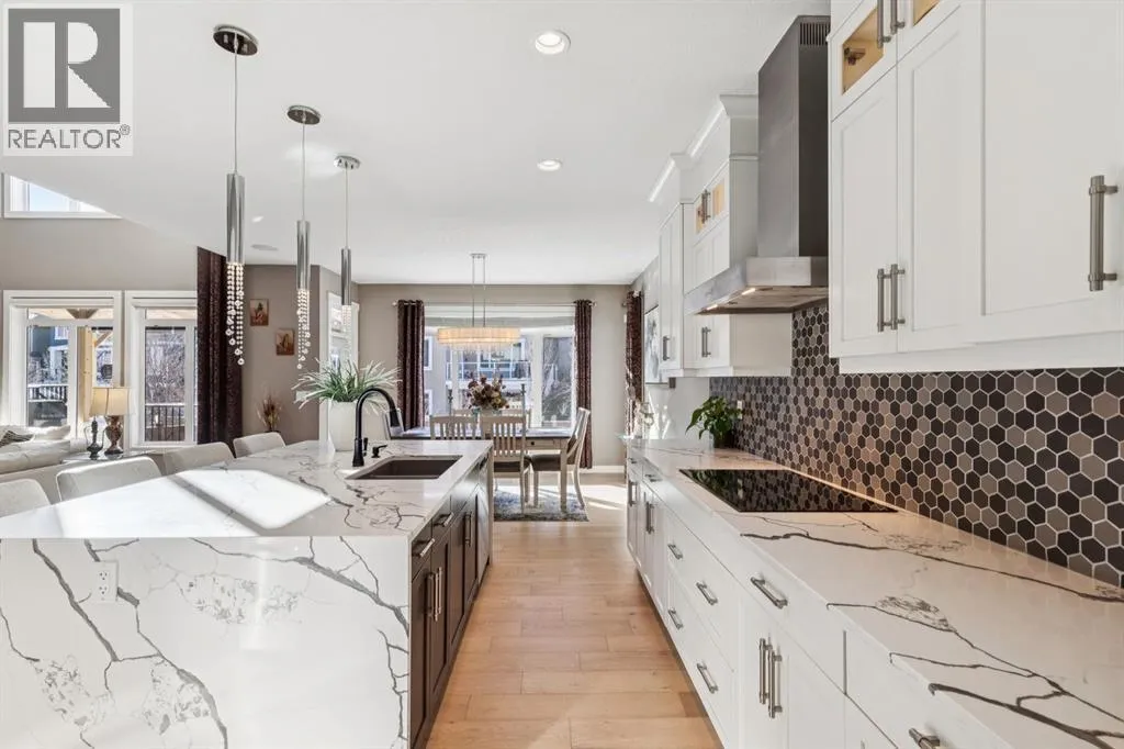 Located in the highly sought after community of Aspen Woods, this stunning family home sits on a quiet street just steps from scenic walking paths, playgrounds, and parks, offering the perfect blend of nature and convenience with quick access to top rated schools, Aspen Landing Shopping Centre, and an easy downtown commute. Showcasing beautiful curb appeal and a west exposed backyard for warm afternoon and evening light, this thoughtfully designed home boasts over 4,000 sq ft of developed living space and features a full walk-out legal basement suite; ideal for extended family or additional income. The main floor welcomes you with a spacious entry and elegant wide plank white hardwood flooring, creating a bright and airy atmosphere throughout. A formal dining room or den offers flexibility for growing families, while the open concept living space is anchored by a dramatic 2-storey window wall and Crestal gas fireplace. The modern kitchen is both stylish and functional with white shaker cabinetry, a striking quartz waterfall eat-up island, induction cooktop, built-in oven and microwave, and a walk-through pantry leading to the mudroom and triple car garage, with a convenient main floor laundry room. A sunny breakfast nook opens onto a pergola-covered raised balcony, perfect for year round enjoyment. Upstairs, hardwood flooring continues throughout, and a spacious bonus room overlooks the living area below, enhancing the homeâs open design. The primary retreat features vaulted ceilings, a custom walk-in closet, and a luxurious 5pc ensuite complete with a deep soaker tub, glass enclosed shower, his/her sinks, and separate make-up vanity, while two additional bedrooms with walk-in closets and a full bath complete the upper level. The fully finished legal basement suite offers vinyl plank flooring, two bedrooms (one with stacked washer and dryer), a 3pc bathroom, built-in appliances including an electric cooktop, large windows for abundant natural light, its own furnace, and a cozy gas fireplace flanked by built-in shelving and storage. Additional highlights of the home include a water softener system and radon gas vacuum system, along with recent upgrades such as three new windows, new shingles and gutters, fresh interior paint, new kitchen sink, new bathroom sinks, and new countertops in the kitchen and two bathrooms. The beautifully landscaped west backyard features apple and cherry trees creating an exceptional outdoor setting for family living in one of Calgaryâs most desirable communities. (id:27476)