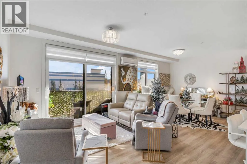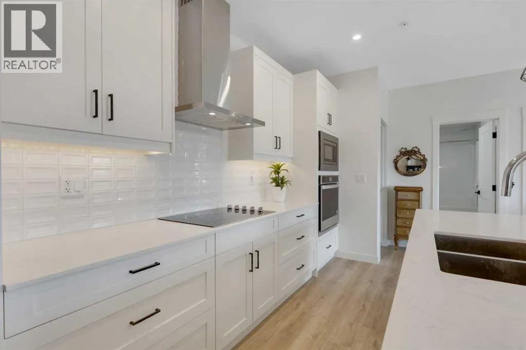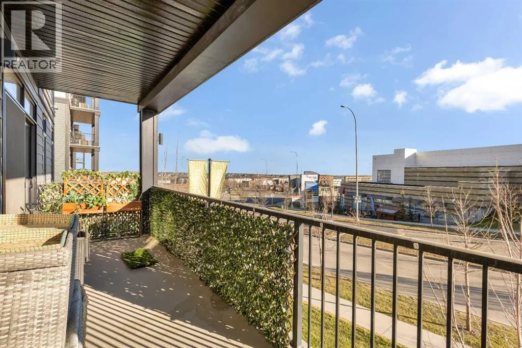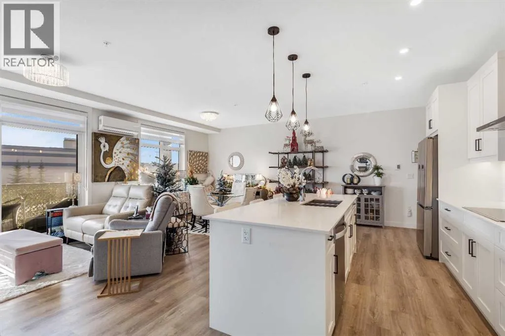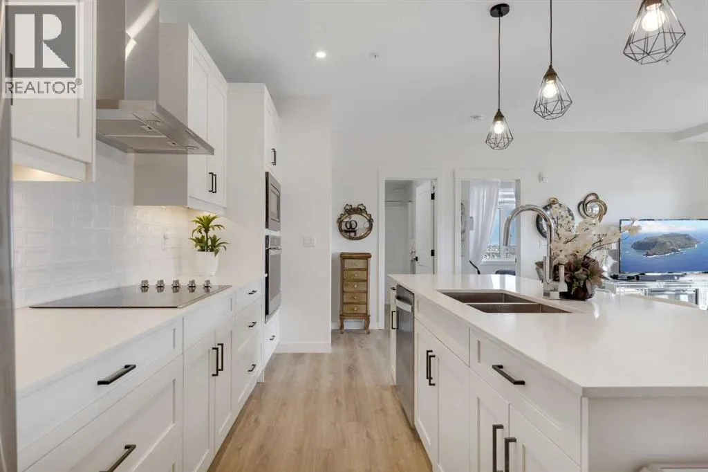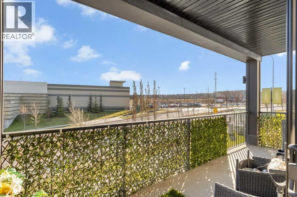 Welcome to this well maintained 2021 built 2 bedroom, 2 bathroom luxury ground level, corner unit condo in the amazing community of Sage Hill. From the front door, you are welcomed with a spacious private foyer with a closet, this condo features everything you will need with 1061 square feet of living space, luxury vinyl plank flooring throughout, a full eat in kitchen with gorgeous white contemporary quartz counter tops, a huge upgraded island, built-in microwave, built-in oven, a counter top stove, all stainless steel appliances with upgraded fridge, as well all the cupboards. It also features a large living area to comfortably fit a dining table, a full living room. The large Primary bedroom has a full walk-in closet, en-suite with double vanity, and a fully tiled shower with an 8mm glass sliding door. The spacious second bedroom offers direct access to the second full bathroom with large vanity, tile and a tub/shower combo. The laundry room offers extra storage space, full size front load stacked washer and dryer. Enjoy the morning sun on the large wrap around patio which has a natural gas line. This unit has full air conditioning to keep you cool during the hot summer months, and upgraded blinds on all the windows. Stay warm in the winter months with secure heated underground parking and a storage unit at your parking stall. This professionally managed building is well taken care. Just walking distance from your patio to the Township shopping complex in Sage Hill across the street for all your necessities. (id:27476)