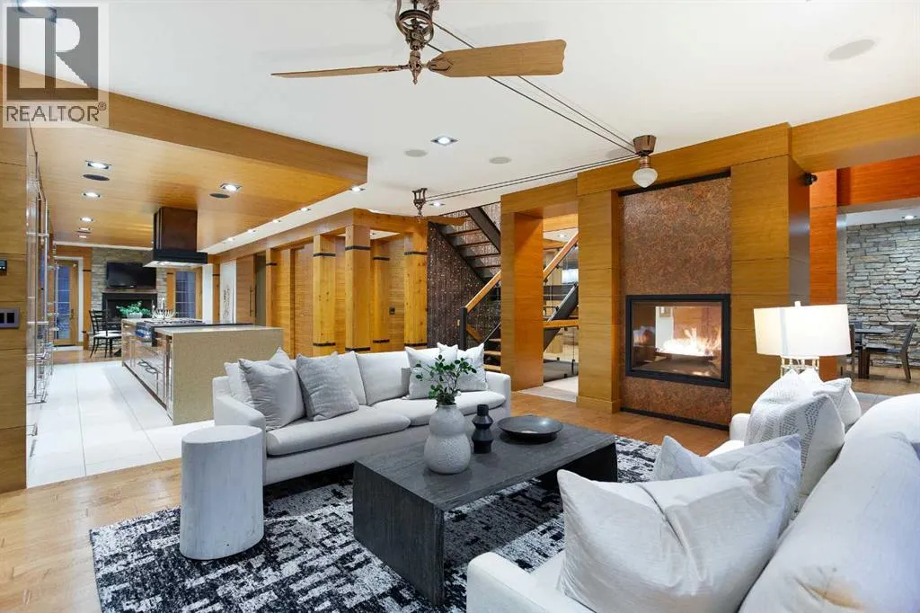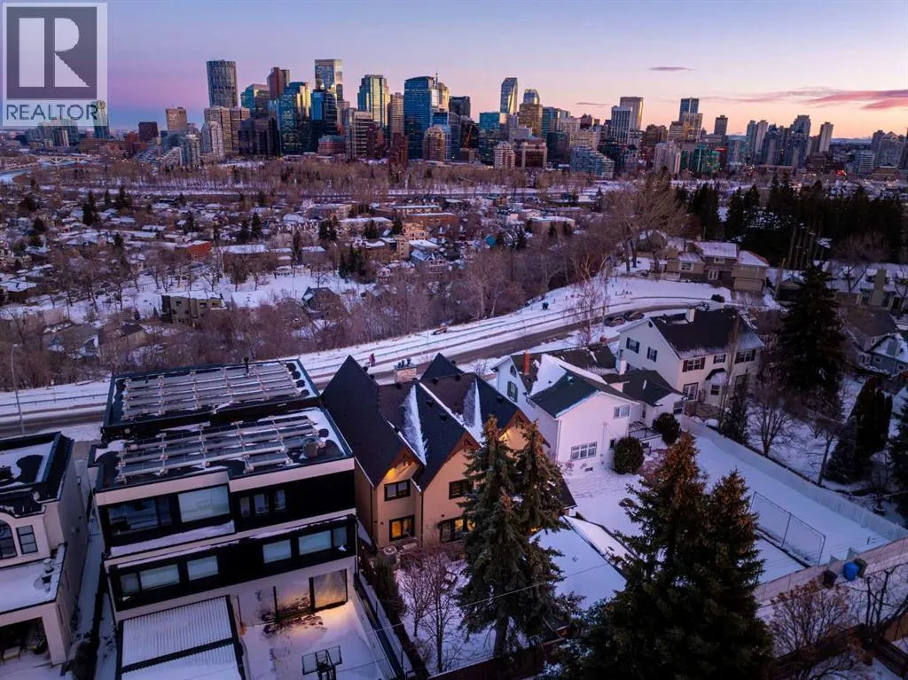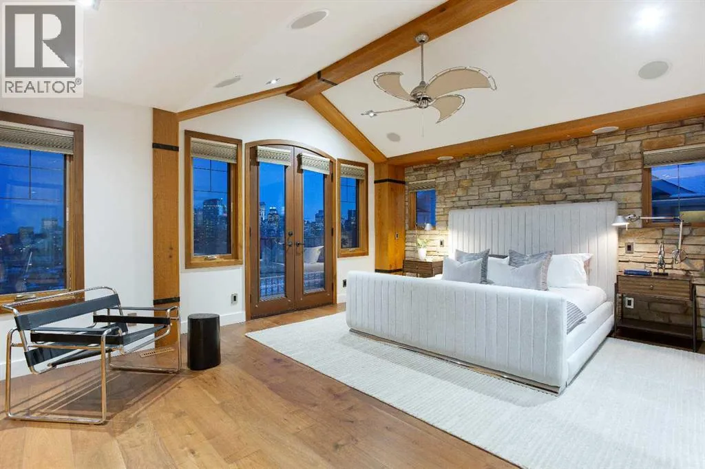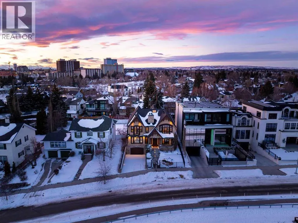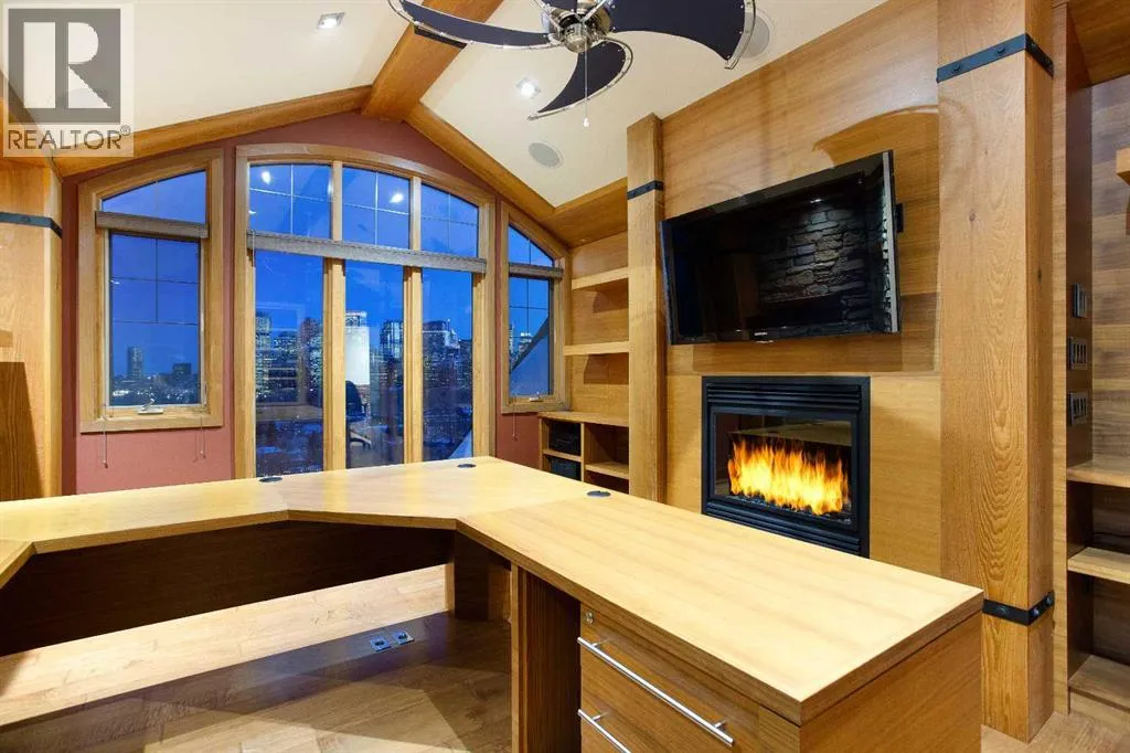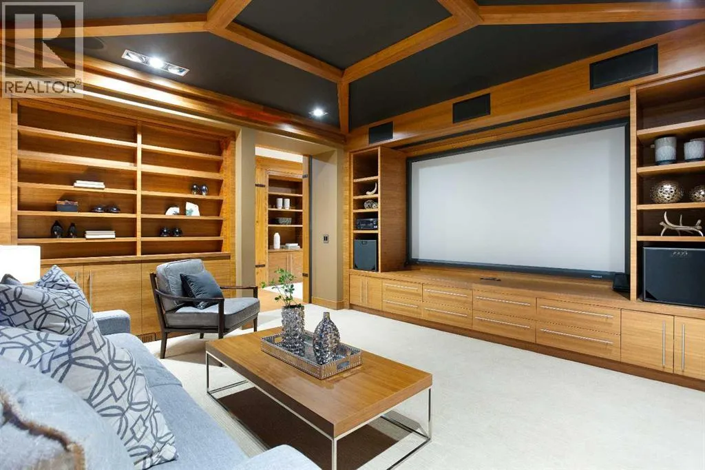 Positioned on prestigious Crescent Road, this exceptional custom residence offers a rare combination of timeless design, refined craftsmanship, and breathtaking views of Calgaryâs downtown skyline and the Bow River valley. Created to showcase its remarkable setting, the home features expansive windows, premium finishes, and thoughtfully designed spaces that elevate everyday living and entertaining.The main level is bright and inviting with an open concept layout anchored by a chefâs kitchen appointed with premium appliances, including a gas cooktop, double wall ovens, warming drawers, generous counter space, and a built in coffee station. The kitchen flows seamlessly into the living room and is steps from the formal dining room, both capturing stunning skyline views. A private media room, along with a spacious office and library, completes the main floor with excellent flexibility for family life and hosting.Upstairs, the primary retreat is a true sanctuary featuring vaulted ceilings, a fireplace, and commanding views of downtown and the river valley. A large walk through closet leads to a spa inspired ensuite with double vanities, a soaker tub, and a steam shower. Two additional bedrooms, each with their own walk in closets, share a well finished bathroom with double vanity and steam shower. A generous upper level den with built in desk and shelving, gas fireplace, and sun filled south facing windows provides an ideal office or lounge and may also be suitable for conversion to a fourth upstairs bedroom.Designed with both entertaining and automotive enthusiasts in mind, the lower level features a striking showroom style garage that may also be ideal as a home gym or flex space. This level is completed by a recreation room, games area, wet bar, full bathroom, and a dedicated wine room.The exterior showcases classic stone and wood accents, an inviting front porch, and a private, treed backyard oasis with a fire pit, perfect for gatherings. A rare opportunity t o own a truly distinguished residence in one of Calgaryâs most sought after locations, offering exceptional views, craftsmanship, and enduring appeal. (id:27476)