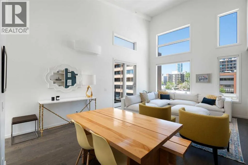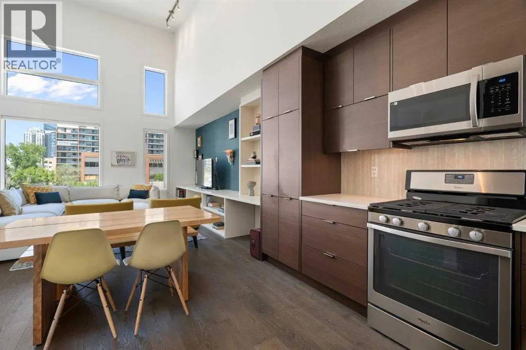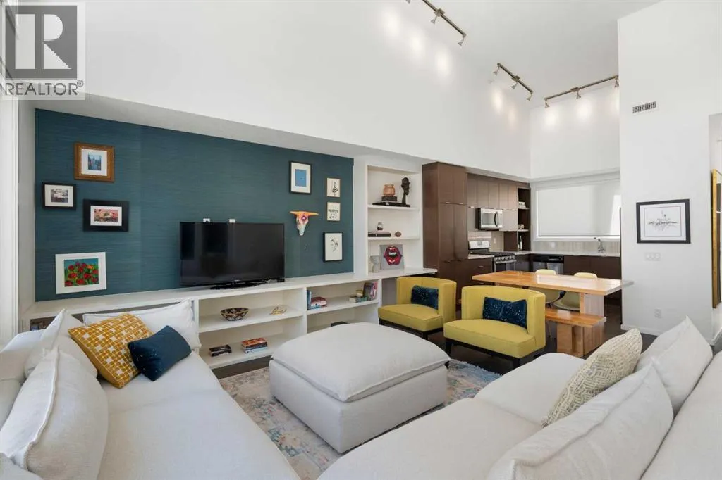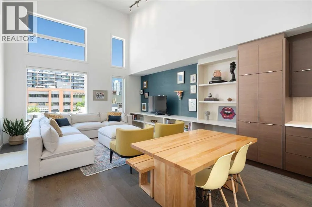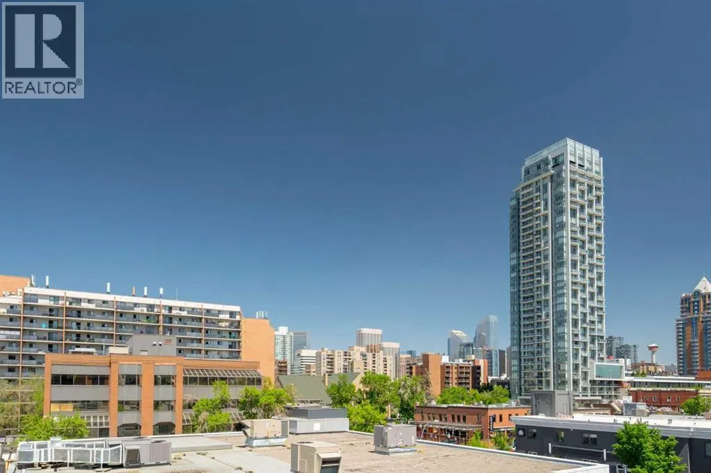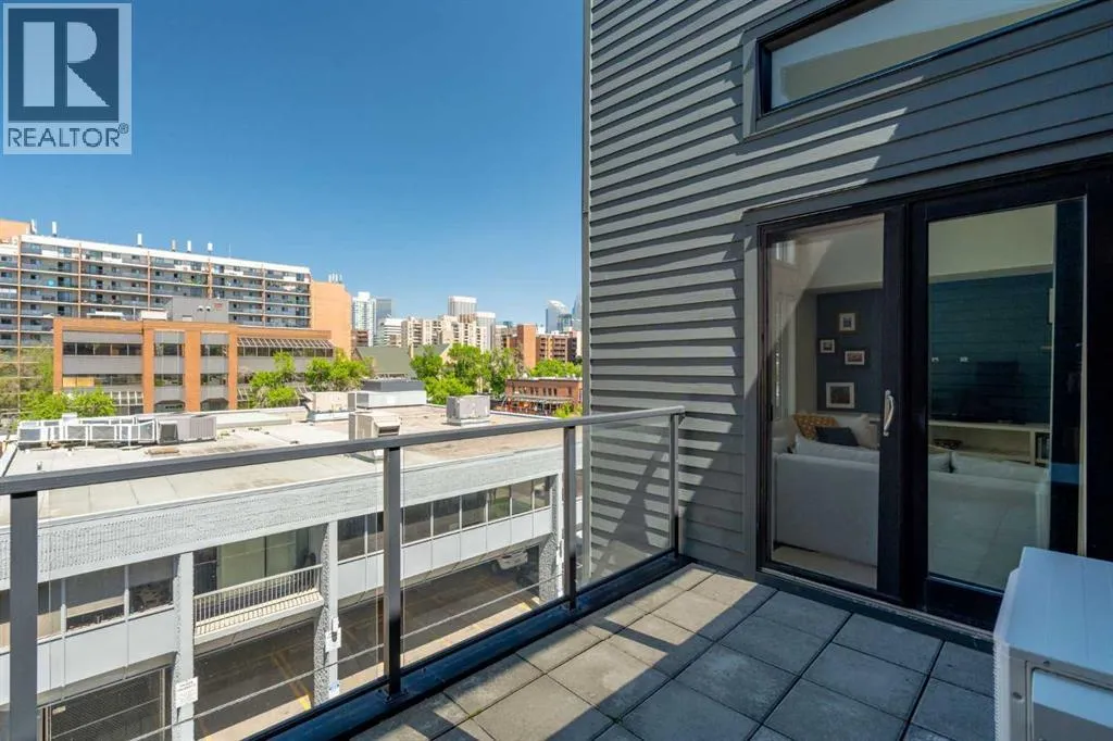 Welcome to The Block, one of Calgaryâs most architecturally distinctive communities just off vibrant 17th Avenue. Designed by Sturgess Architecture and built by Avi Urban, this boutique development is known for its rare private courtyard concept â each residence opens directly to the outdoors, creating a sense of community, privacy, and independence thatâs truly unmatched in the downtown core.This top-floor penthouse loft is one of the most desirable suites in the complex. Soaring 14â vaulted ceilings and hardwood floors throughout create an airy, dramatic living space, while massive windows flood the home with natural light. A custom wall of built-ins anchors the living room with both style and functionality. The sleek kitchen features stainless steel appliances, lacquered cabinetry, and generous storage â perfect for both everyday living and entertaining. Step out onto your private deck with city views, complete with gas access for easy BBQ evenings. The spacious primary bedroom offers large windows and convenient access to a beautifully appointed bathroom with walk-in glass shower and modern vanity. The second bedroom is thoughtfully designed with a full wall of built-in storage, making it ideal for guests, a home office, or both. Complete with titled parking, additional storage, built-in laundry, and air conditioning, this is effortless urban living at its finest. Now offered at a significantly improved price, this penthouse represents outstanding value in one of Calgaryâs most dynamic inner-city locations. Donât miss your opportunity to experience The Block at its very best. (id:27476)