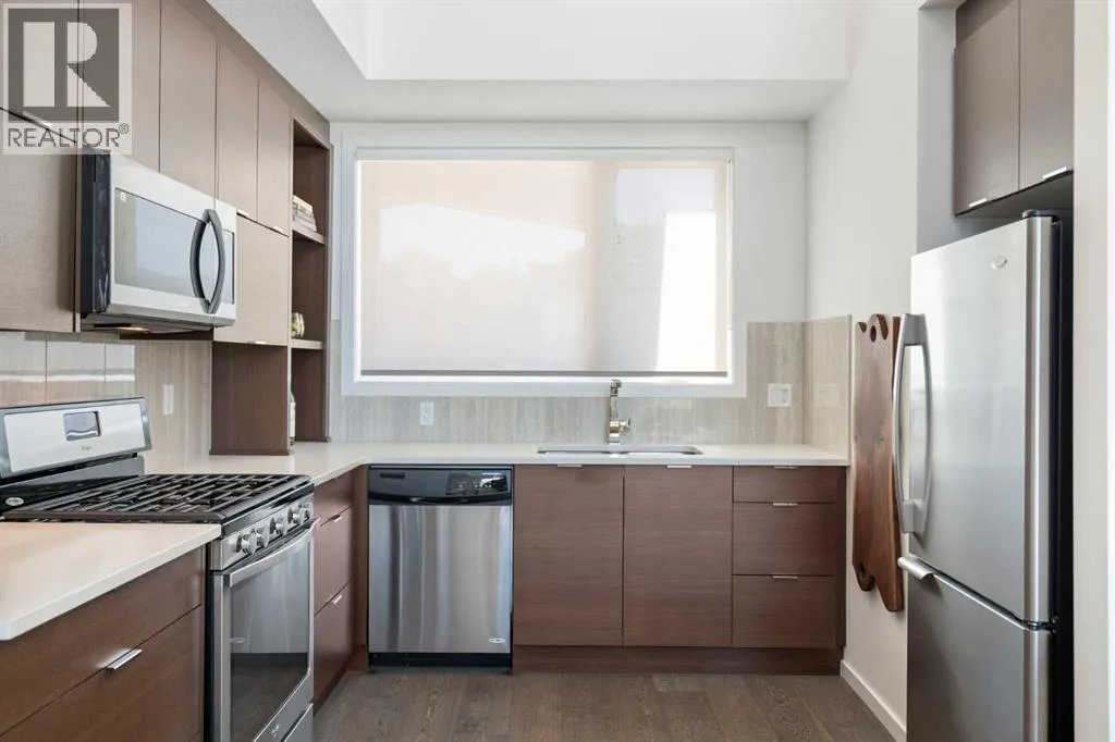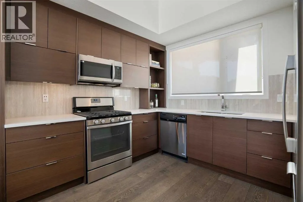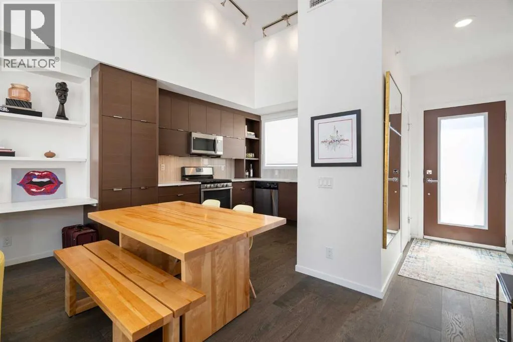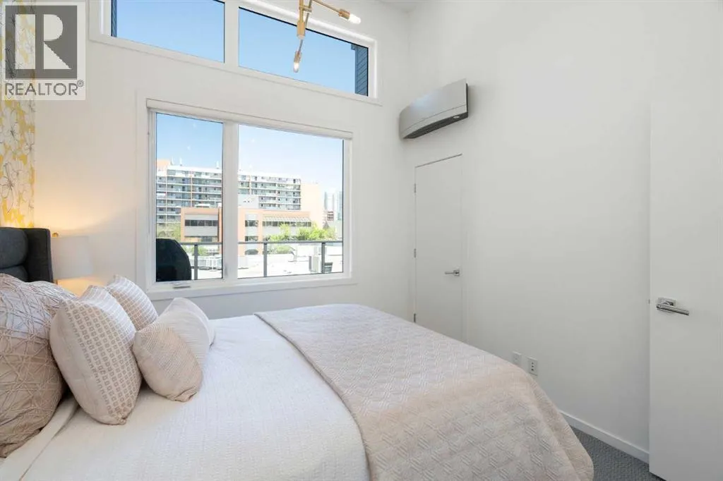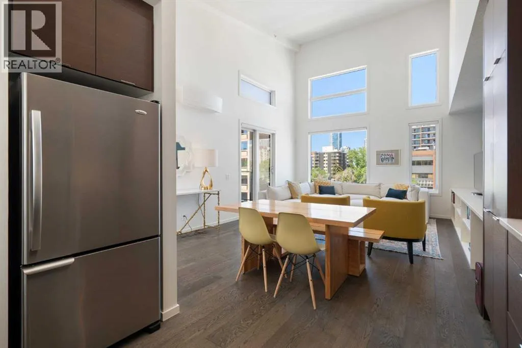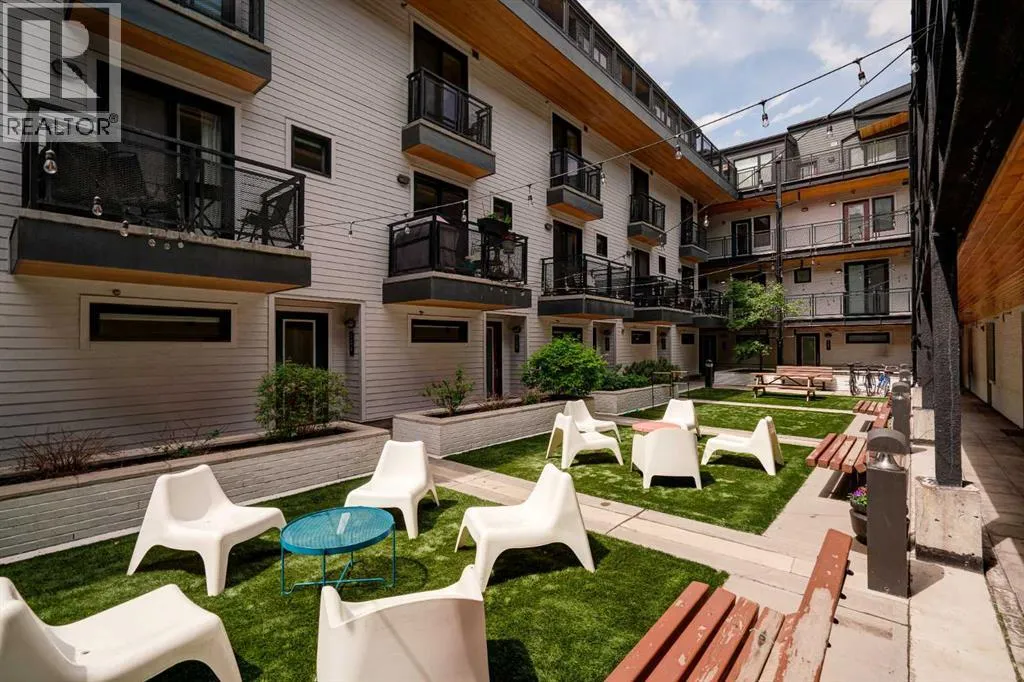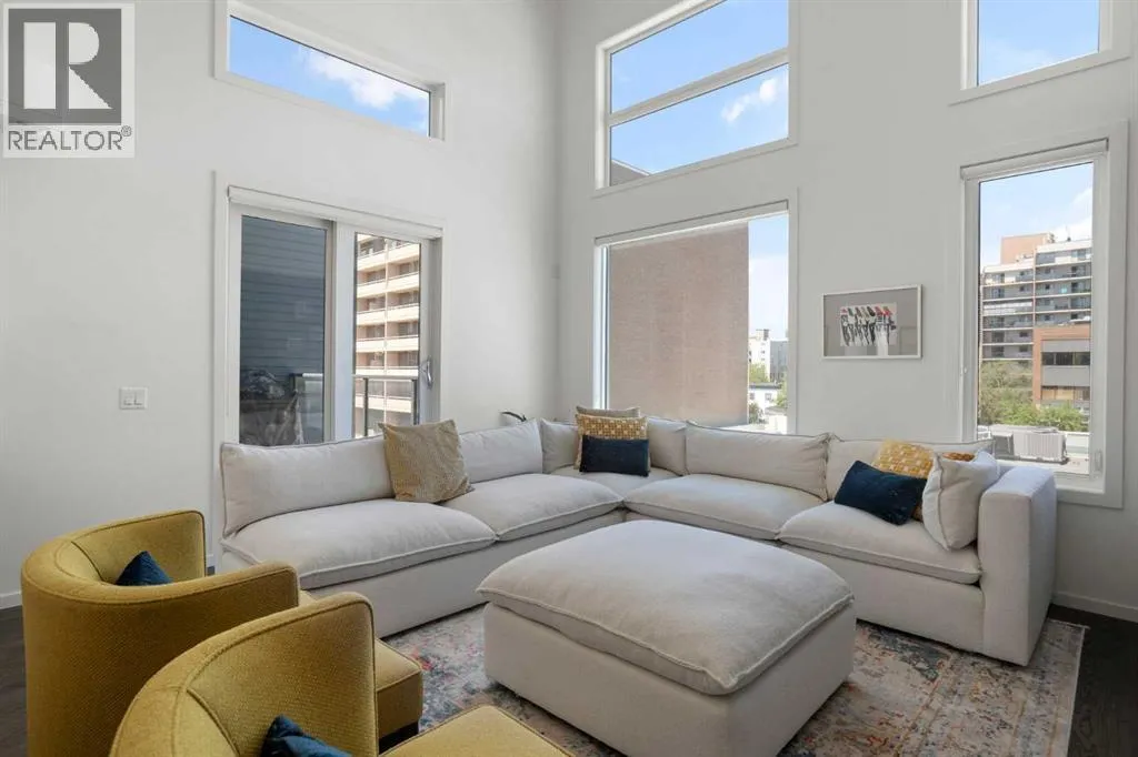 Welcome to The Block, one of Calgaryâs most architecturally distinctive communities just off vibrant 17th Avenue. Designed by Sturgess Architecture and built by Avi Urban, this boutique development is known for its rare private courtyard concept â each residence opens directly to the outdoors, creating a sense of community, privacy, and independence thatâs truly unmatched in the downtown core.This top-floor penthouse loft is one of the most desirable suites in the complex. Soaring 14â vaulted ceilings and hardwood floors throughout create an airy, dramatic living space, while massive windows flood the home with natural light. A custom wall of built-ins anchors the living room with both style and functionality. The sleek kitchen features stainless steel appliances, lacquered cabinetry, and generous storage â perfect for both everyday living and entertaining. Step out onto your private deck with city views, complete with gas access for easy BBQ evenings. The spacious primary bedroom offers large windows and convenient access to a beautifully appointed bathroom with walk-in glass shower and modern vanity. The second bedroom is thoughtfully designed with a full wall of built-in storage, making it ideal for guests, a home office, or both. Complete with titled parking, additional storage, built-in laundry, and air conditioning, this is effortless urban living at its finest. Now offered at a significantly improved price, this penthouse represents outstanding value in one of Calgaryâs most dynamic inner-city locations. Donât miss your opportunity to experience The Block at its very best. (id:27476)