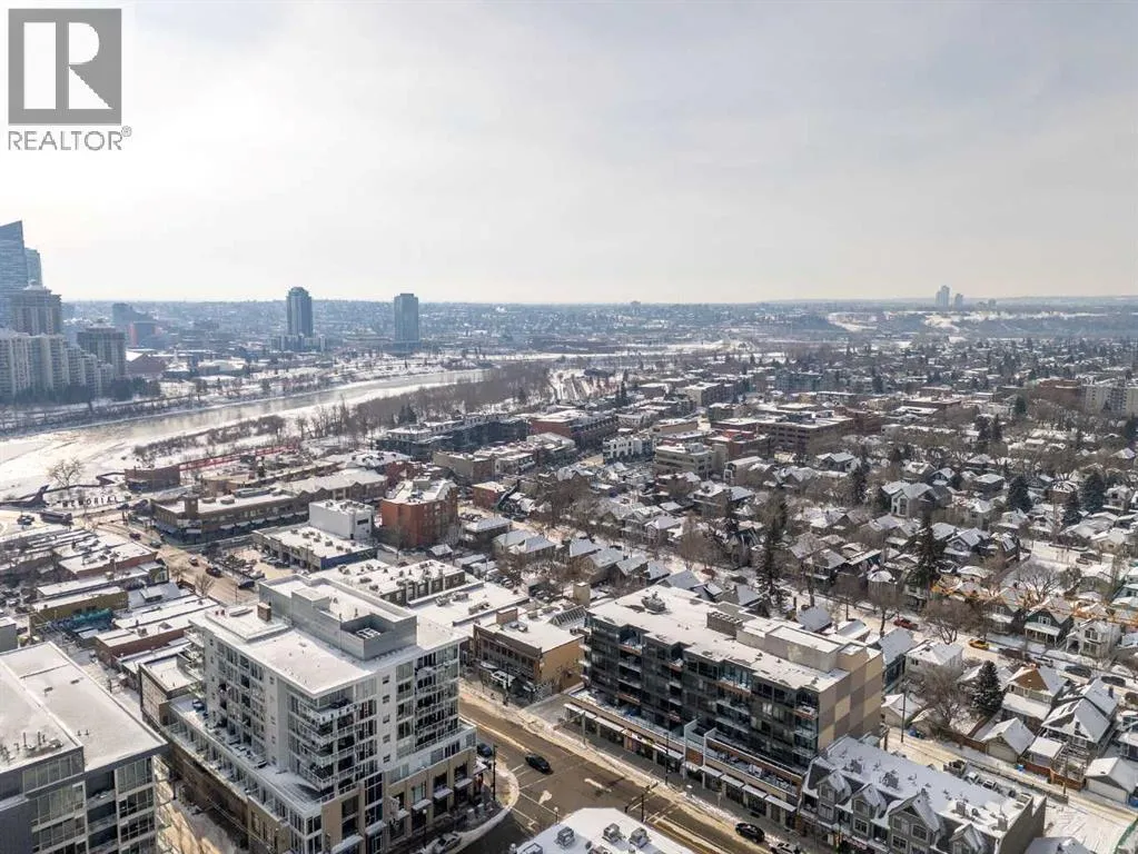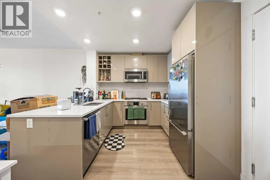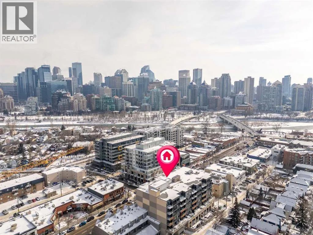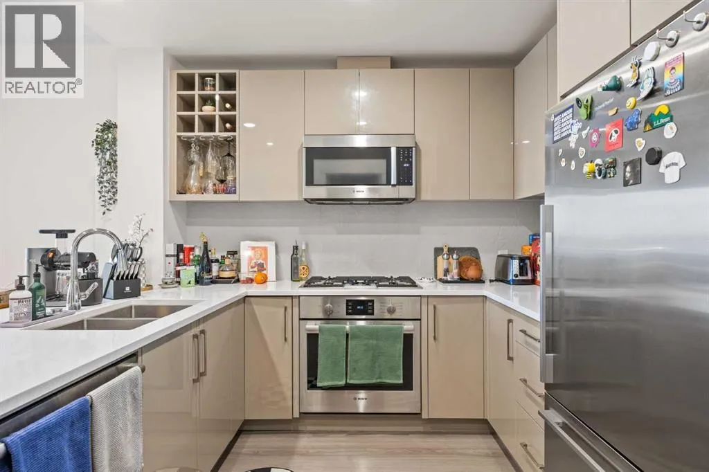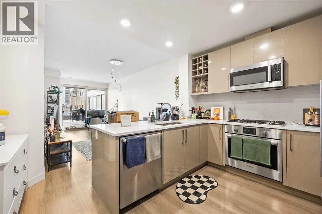 Welcome to urban living at its finest in The Kensington, ideally located in the vibrant community of Hillhurst. This beautifully appointed 1-bedroom, 1-bathroom unit showcases modern finishes and an open-concept layout designed for both comfort and functionality. The stunning U-shaped kitchen features high-gloss cabinetry, excellent counter space, a built-in wine rack, and premium stainless steel Bosch appliances, including a gas stove, perfect for those who love to cook and entertain. The kitchen seamlessly opens to the bright living/dining area, offering flexibility for adding a home office setup or a sunny reading nook. Step outside to your spacious private south facing balcony, complete with a convenient BBQ gas line, ideal for entertaining or relaxing evenings at home. The generous primary bedroom offers a large walk-through closet with thoughtfully designed shelving for maximum organization and direct access to the elegant 4-piece bathroom. Enjoy luxury touches including a deep soaker tub, glass surround stand up shower, large vanity with ample storage, built-in shelving, and a cheater door providing convenient access from the main living space. Additional highlights include a dedicated laundry room near the entrance with side by side washer and dryer with extra storage space and an additional front closet area. Central air conditioning ensures year round comfort and this unit also comes with one TITLED underground parking stall and an assigned storage locker, an added bonus that is priceless with condo living. Additionally the building also offers a residents car wash and bike storage! Residents will love the unbeatable location with retail amenities right on the main floor, including Orange Theory Fitness and a café, plus just a 5-minute walk to Sunnyside LRT station. Enjoy quick access to the Bow River pathways, downtown core, and the countless shops and restaurants that make Kensington one of Calgaryâs most sought-after neighbourhoods. This is a rare oppor tunity to own a sophisticated home that perfectly blends luxury, convenience, and that unbeatable inner city lifestyle. (id:27476)