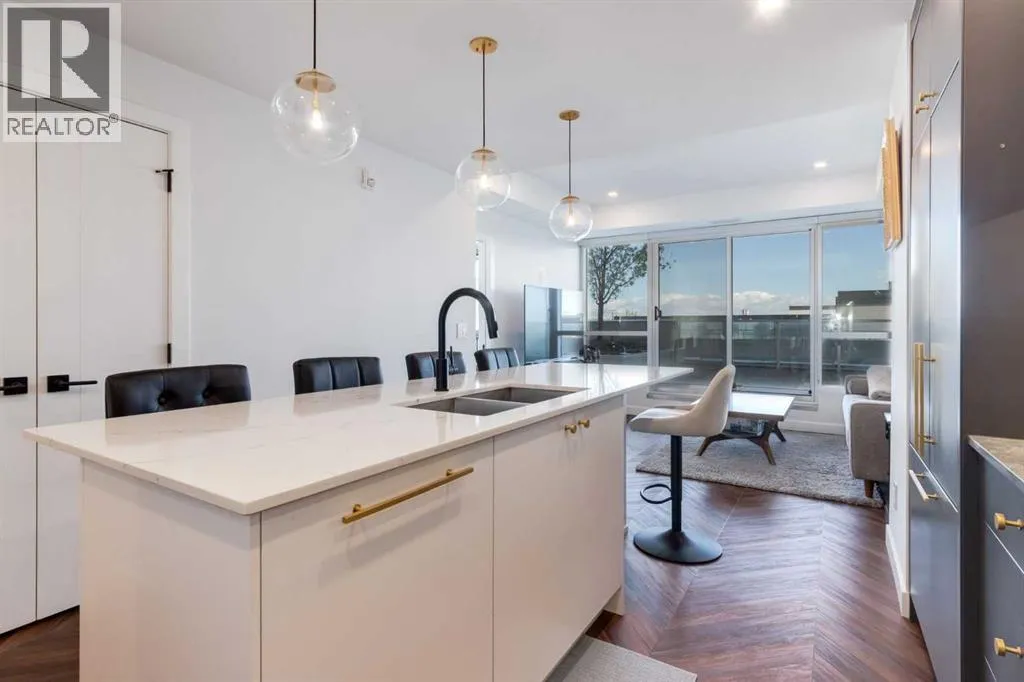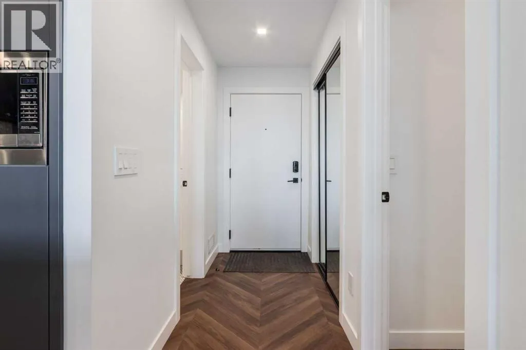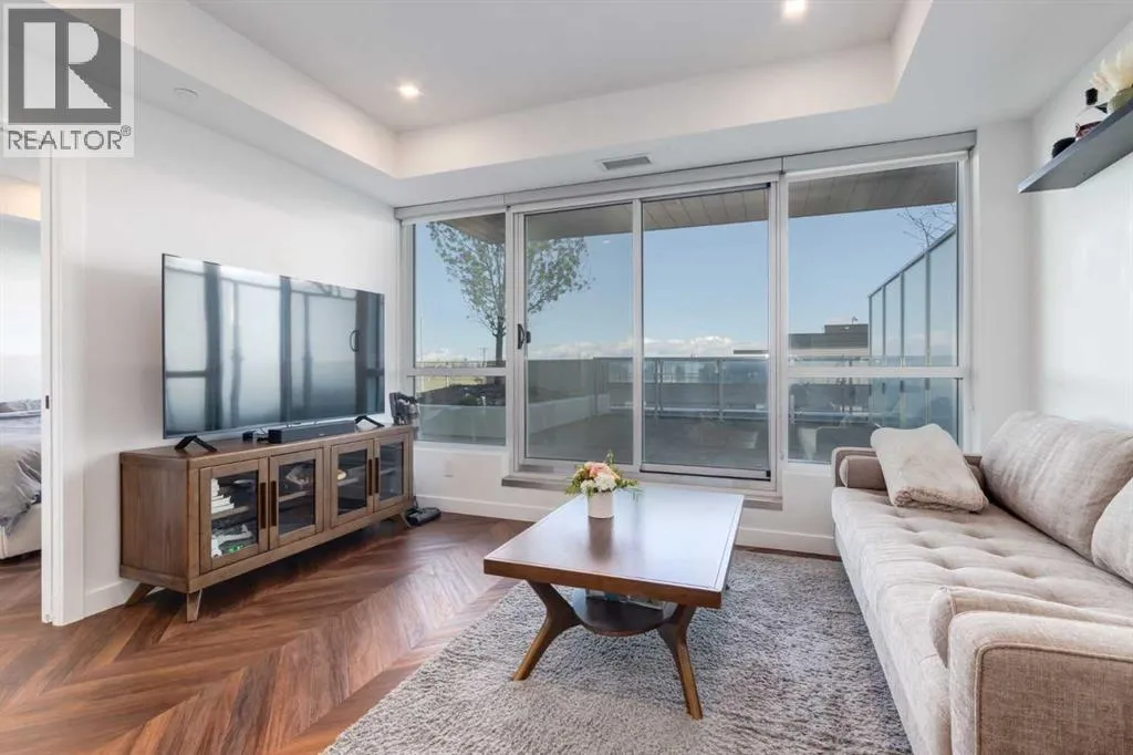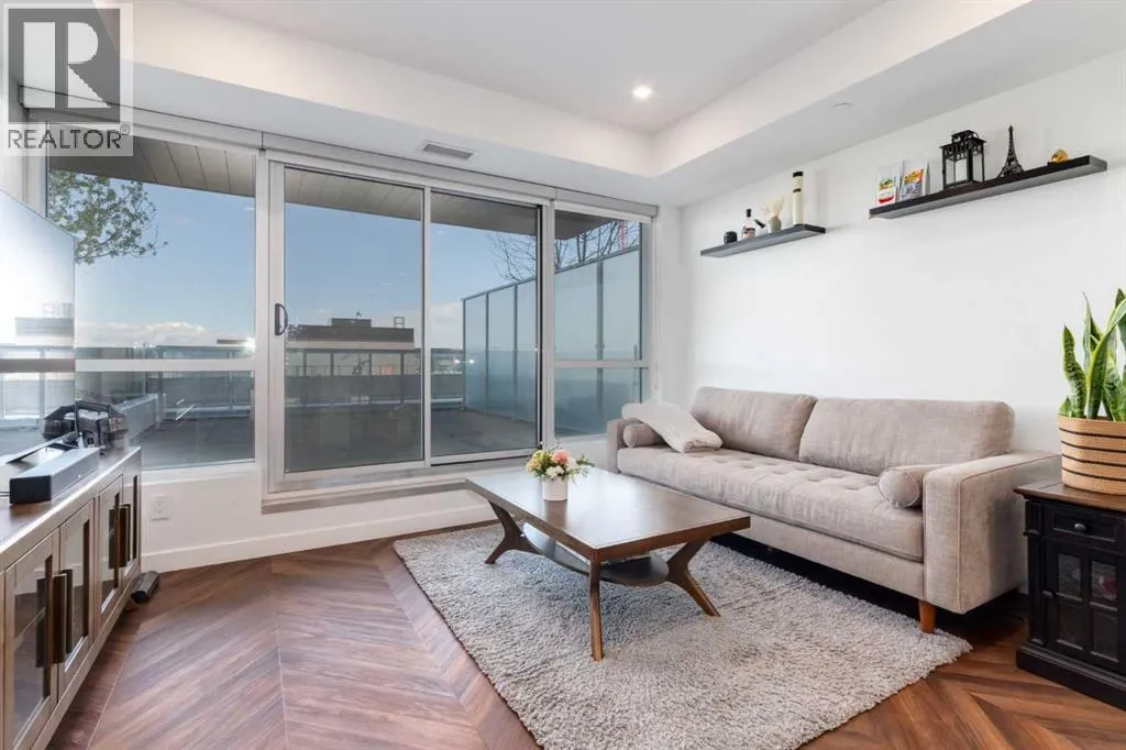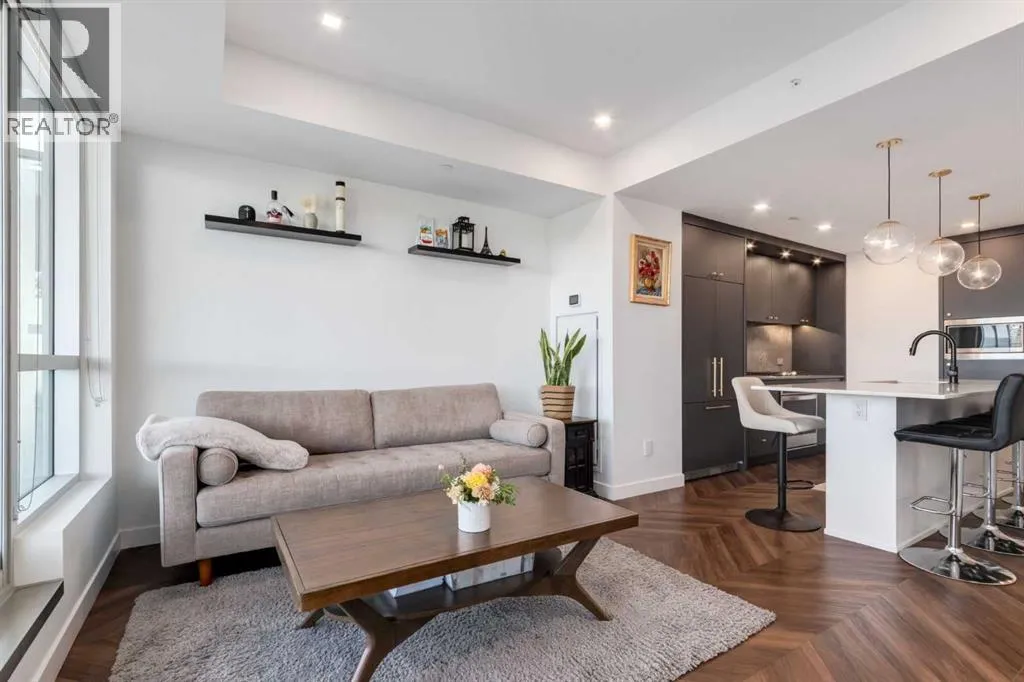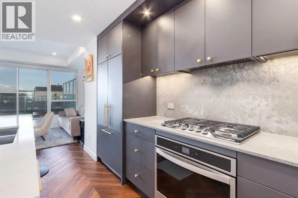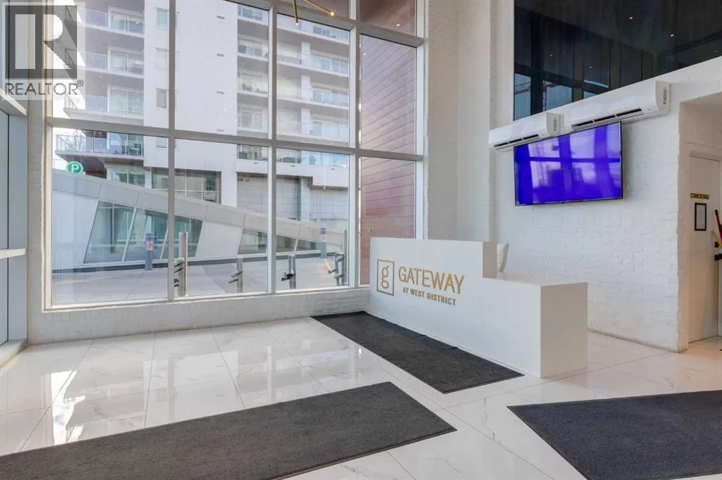 Priced to Sell! Welcome to Gateway by TRUMAN, nestled in the heart of the Master Planned community of West District. This concrete-constructed 2-bedroom, 2-bathroom home includes 1 titled underground parking stall and a spacious patio. Enjoy the pinnacle of craftsmanship and luxury with features like air conditioning, Chevron Luxury Wide plank flooring, and custom penny round mosaic tiles in all baths. LED pot lights illuminate the 9-foot+/- painted ceilings, enhancing the ambiance of the custom Chef-inspired kitchen. Finished in a luxurious Super Matte texture with brushed gold hardware, the kitchen boasts a high-end gas cooktop and wall oven, an integrated 36" Fisher & Paykel fridge, panelled dishwasher, and soft-close custom cabinetry with under-cabinet lighting. Quartz countertops and backsplash add a touch of sophistication. Additional features include a washer & dryer and window coverings for the floor-to-ceiling glass doors that lead to the expansive private patio. Located mere steps away from popular spots such as Hot Shop Yoga, Deville Coffee House, Hankki, La Diperie Ice Cream, Una, Blanco, and more! Gateway by TRUMAN offers a lifestyle of convenience and luxury in West District's thriving community. (id:27476)