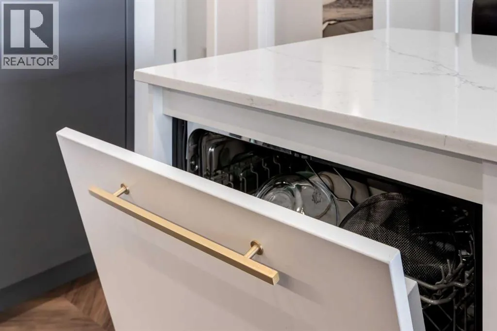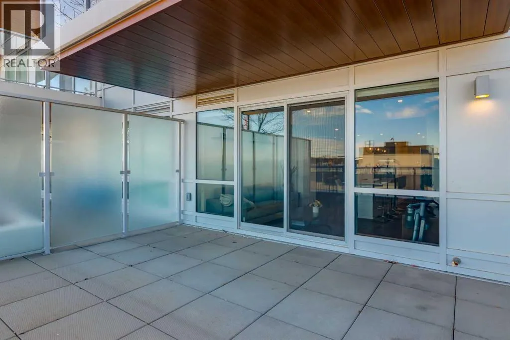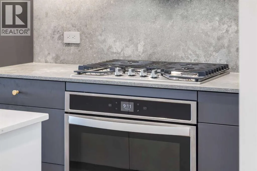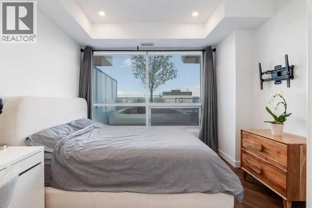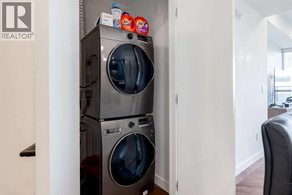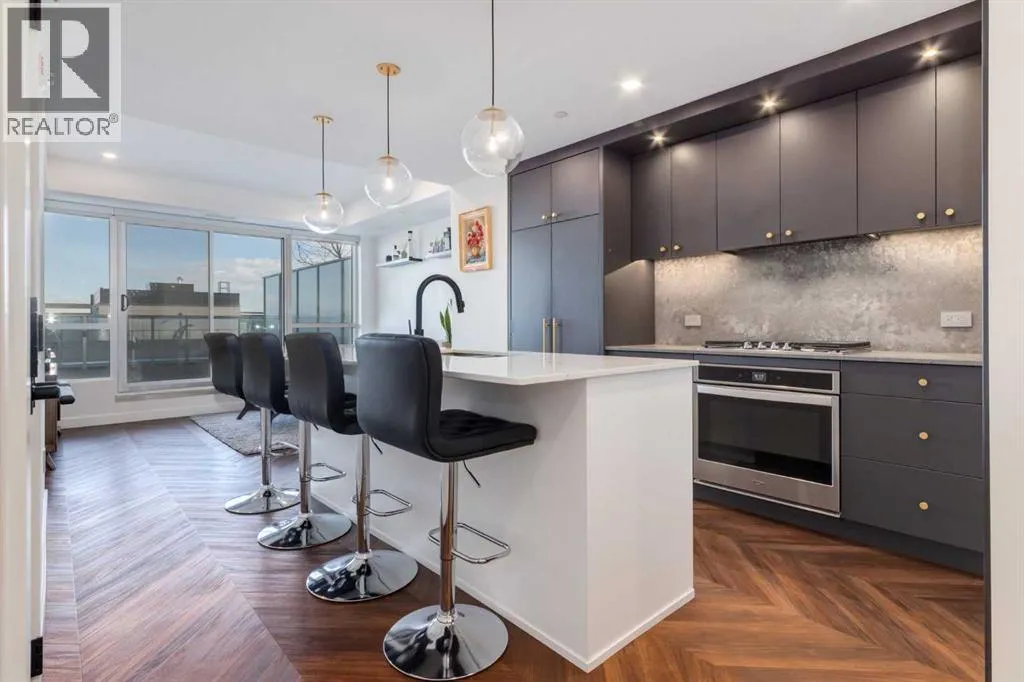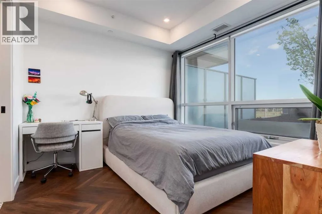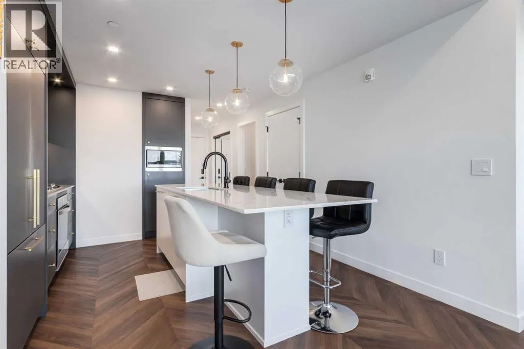 Priced to Sell! Welcome to Gateway by TRUMAN, nestled in the heart of the Master Planned community of West District. This concrete-constructed 2-bedroom, 2-bathroom home includes 1 titled underground parking stall and a spacious patio. Enjoy the pinnacle of craftsmanship and luxury with features like air conditioning, Chevron Luxury Wide plank flooring, and custom penny round mosaic tiles in all baths. LED pot lights illuminate the 9-foot+/- painted ceilings, enhancing the ambiance of the custom Chef-inspired kitchen. Finished in a luxurious Super Matte texture with brushed gold hardware, the kitchen boasts a high-end gas cooktop and wall oven, an integrated 36" Fisher & Paykel fridge, panelled dishwasher, and soft-close custom cabinetry with under-cabinet lighting. Quartz countertops and backsplash add a touch of sophistication. Additional features include a washer & dryer and window coverings for the floor-to-ceiling glass doors that lead to the expansive private patio. Located mere steps away from popular spots such as Hot Shop Yoga, Deville Coffee House, Hankki, La Diperie Ice Cream, Una, Blanco, and more! Gateway by TRUMAN offers a lifestyle of convenience and luxury in West District's thriving community. (id:27476)