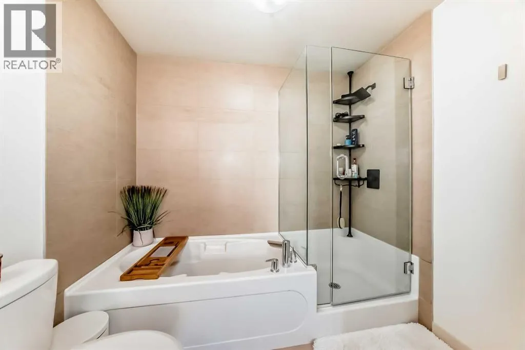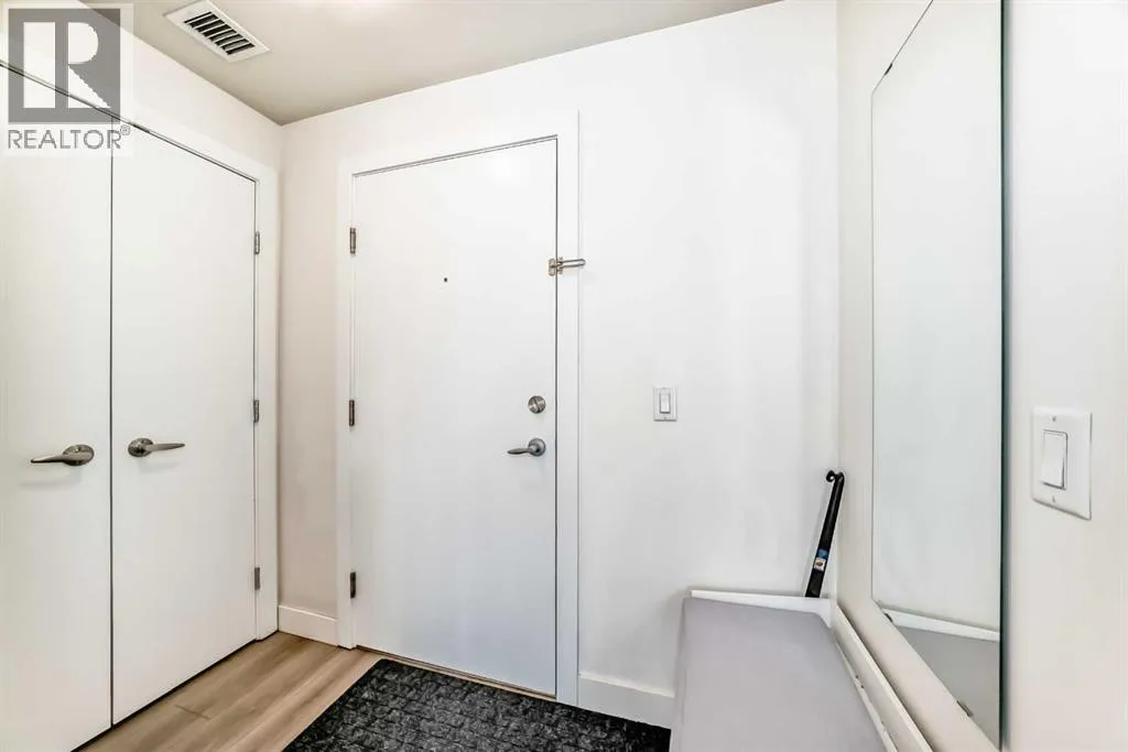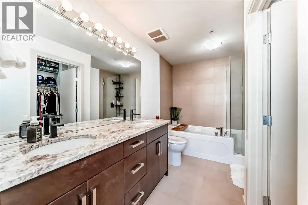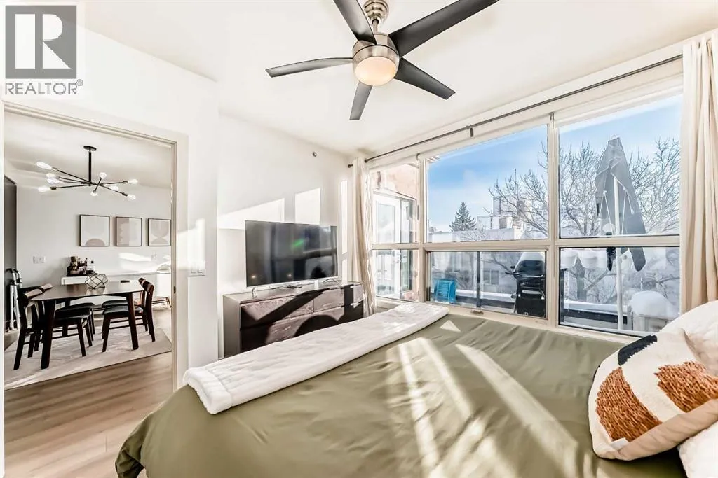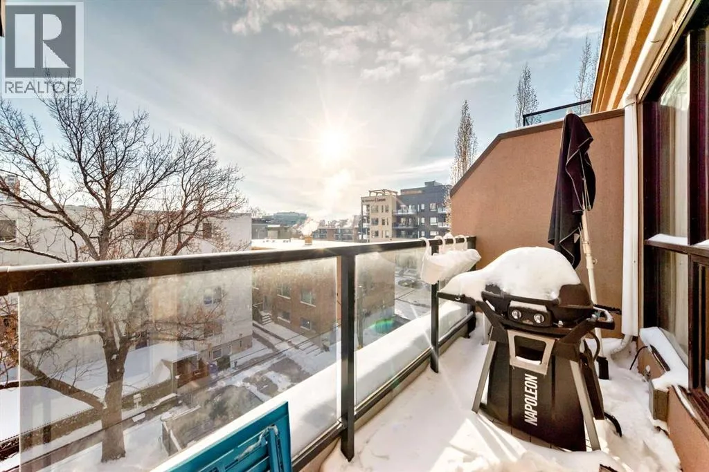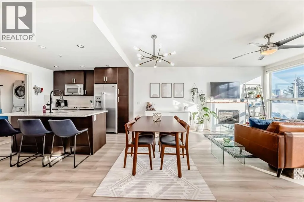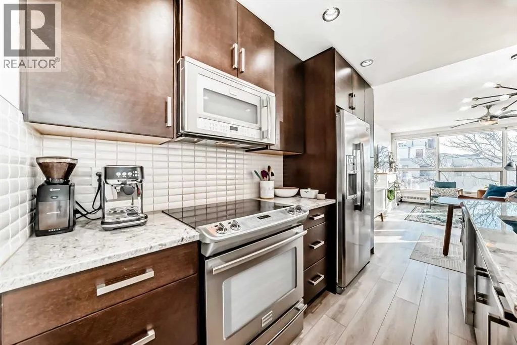 Stunning One Bedroom Condo at TWEED! This boutique executive residence building is a concrete and steel constructed complex on a quaint tree-lined street in Cliff Bungalow, boasting a brick/stucco exterior, two elevators and professionally designed common areas. The open concept interior of this unit impresses with stainless steel appliances, stylish granite countertops, a tiled backsplash and contemporary flat panel cabinetry. The bedroom is a serene space with large windows and a 5-piece ensuite. Additional elements include air conditioning, vinyl plank flooring, a 2-piece bathroom, a modern fireplace, in-suite laundry, and a beautiful window wall in the living room, a large balcony with a BBQ gas line. An incredibly convenient storage locker is included, separate from the suite on the 4th floor, an underground parking stall, a large balcony with a BBQ gas line. Cliff Bungalow is tucked between Mission and Lower Mount Royal; a mature neighbourhood, close to many desirable shops, trendy eateries, urban parks and a quick walk into Downtown. Book an appointment to view. (id:27476)