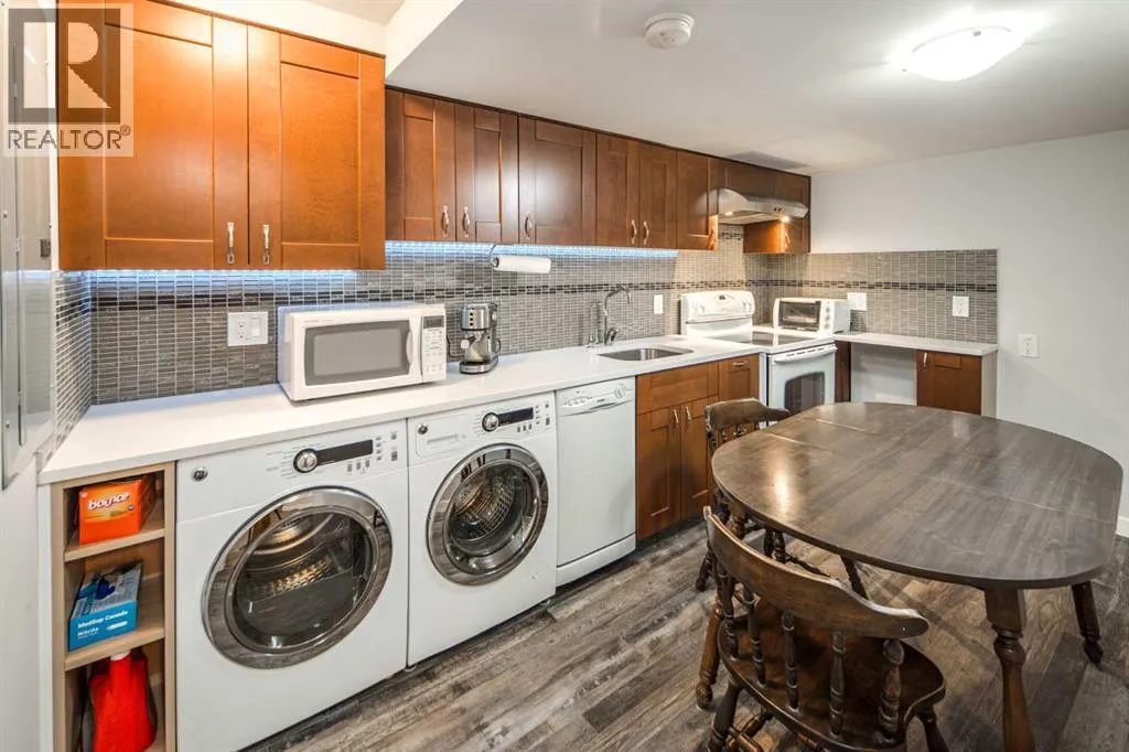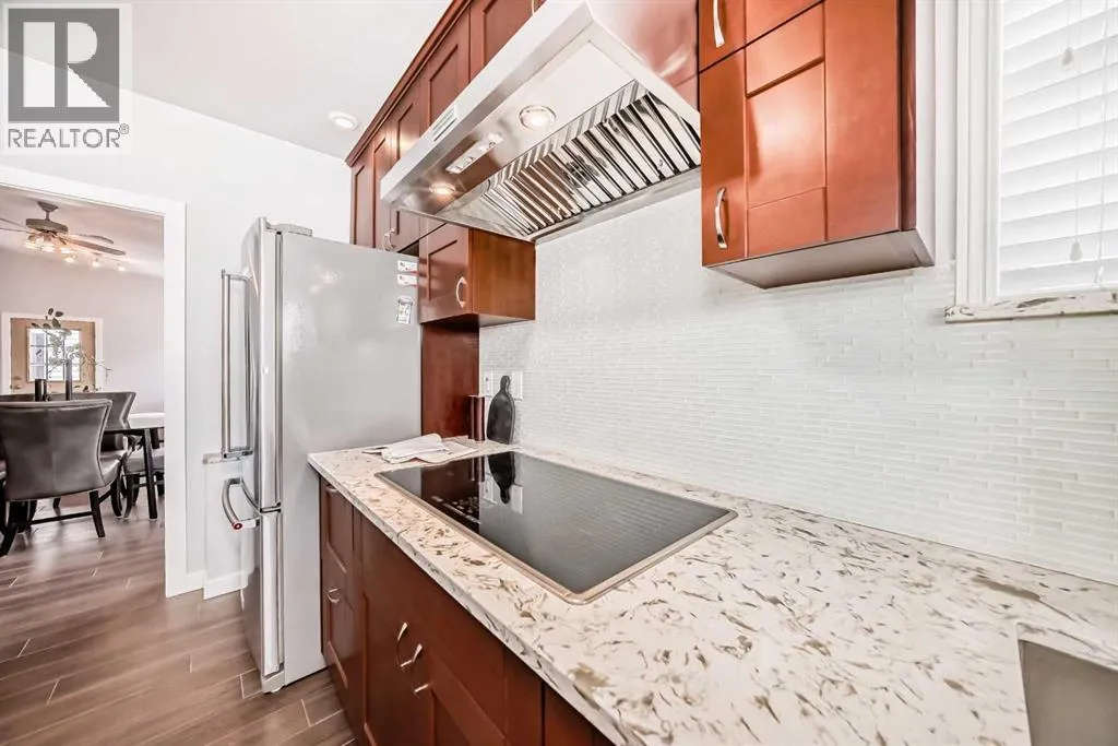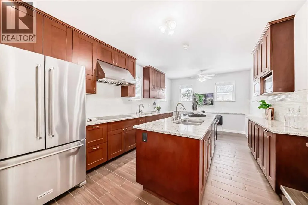 LOCATION! LOCATION! LOCATION! Welcome to this exceptional, fully renovated luxury bungalow nestled in the highly coveted, family-friendly community of Dalhousie, ideally situated near top-ranked schools, the prestigious University of Calgary, scenic parks, vibrant shopping centres, and multiple convenient transit options. This stunning 5-bedroom, 5-bathroom home offers over 2,700 square feet of thoughtfully designed, elegant living space, blending contemporary aesthetics with premium, high-quality finishes throughout. The house is equipped with high-quality in-floor heating, offering exceptional, consistent warmth and cozy comfort during Canadaâs long, cold winters, while adding an elegant touch of luxury to your everyday living experience.The open-concept layout boasts a bright and spacious living room, a cozy and functional family area, and a gracefully connected dining room â perfect for both everyday living and stylish entertaining. The brand-new gourmet kitchen is a chefâs dream, equipped with top-of-the-line stainless steel appliances, a restaurant-grade range hood, a large 5-burner induction cooktop, luxurious marble countertops, and custom solid wood cabinetry, all combining beauty with functionality. The main floor features three sun-drenched bedrooms, including a generously sized primary suite complete with a spa-inspired ensuite bathroom featuring a soaker tub. For added convenience, the main level also offers a laundry-ready closet with rough-ins for a stackable washer and dryer, perfectly positioned near the bedrooms. The separate-entry lower level is ideal for income generation or multigenerational living, featuring a fully equipped second kitchen, two spacious ensuite bedrooms, a dedicated home office, and dual laundry setups for maximum independence and flexibility. Step outside to a beautifully landscaped, expansive backyard with a large, private deck shaded by mature trees. The deck is pre-installed with in-floor heating pipes and rough-ins for a f uture hot tub, creating a perfect outdoor oasis. The massive backyard offers ample room to park an RV or a small boat, making it a dream for adventure lovers. The oversized and elevated double garage provides extra clearance, making it easy to accommodate large trucks or a workshop setup. Dalhousie is a mature, vibrant community known for its excellent walkability and access to schools, public transit, parks, cafes, and shopping. With quick connections to Crowchild Trail, John Laurie Blvd, and the Dalhousie LRT station, your commute and errands are always a breeze. Whether you're looking to upsize, relocate, or invest in a home that offers style, comfort, privacy, and incredible future potential, this rare offering must be experienced in person to fully appreciate its true value. Schedule your private viewing today! The seller has just replaced the garage roof. Please see the photos for details. (id:27476)