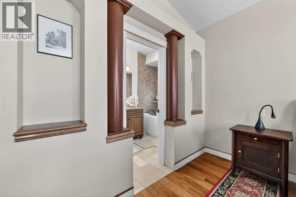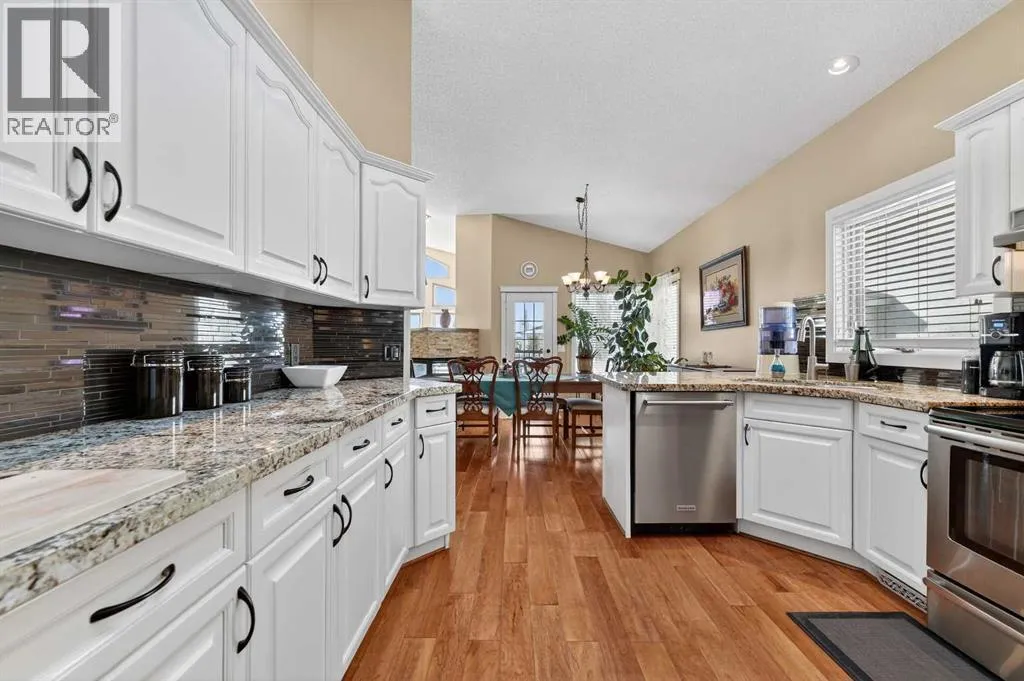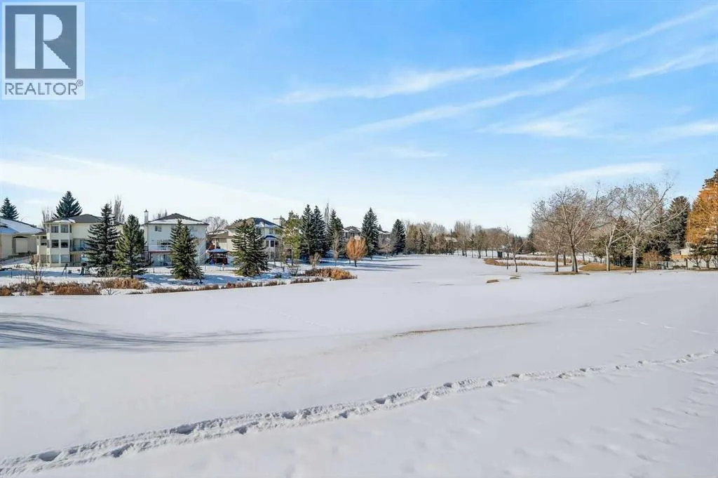 Perfectly positioned in the sought-after community of Douglasdale Estates, this executive fully finished bungalow backs directly onto the golf course, offering a rare combination of privacy, views, and everyday luxury living in one of Calgaryâs most established estate neighborhoods. Vaulted ceilings span the main floor, creating an airy, light-filled atmosphere that enhances the homeâs spacious design and architectural appeal.The open-concept layout seamlessly connects the kitchen, dining, and living spaces â ideal for entertaining or relaxed daily living. The kitchen features hardwood flooring, skylight, white cabinetry, stainless steel appliances, and a functional layout overlooking the eating area with access to a covered deck perfect for enjoying peaceful golf course views year-round. A striking three-way gas fireplace anchors the main living space, adding warmth and ambiance throughout.The main level offers two bedrooms, including a generous primary retreat with a full ensuite featuring dual sinks, separate shower, and jetted soaker tub, plus an additional full bathroom and a versatile front flex room originally designed as a formal dining space.Downstairs, the fully finished lower level with in-floor heating expands your lifestyle possibilities with two additional bedrooms, full bathroom, family/media area, and dedicated office space â ideal for guests, multigenerational living, or working from home.Additional value features include a double-attached garage, completed Poly-B plumbing replacement. Rare opportunity to secure a move-in-ready executive bungalow on a golf course lot in a prestigious, amenity-rich community. (id:27476)