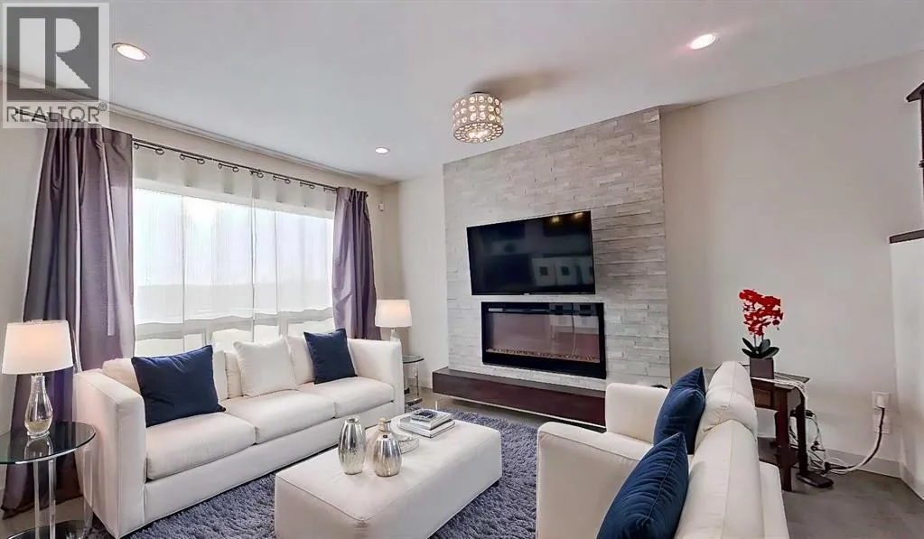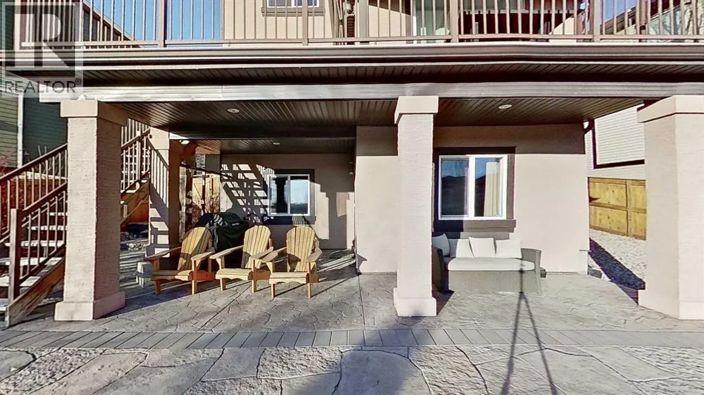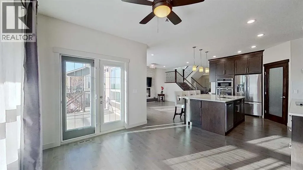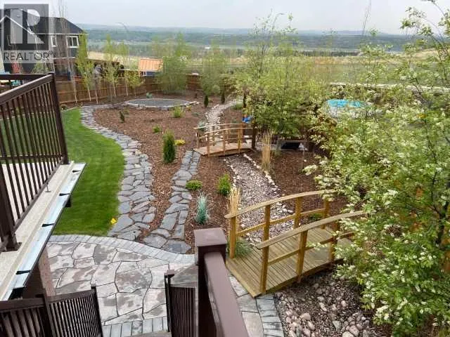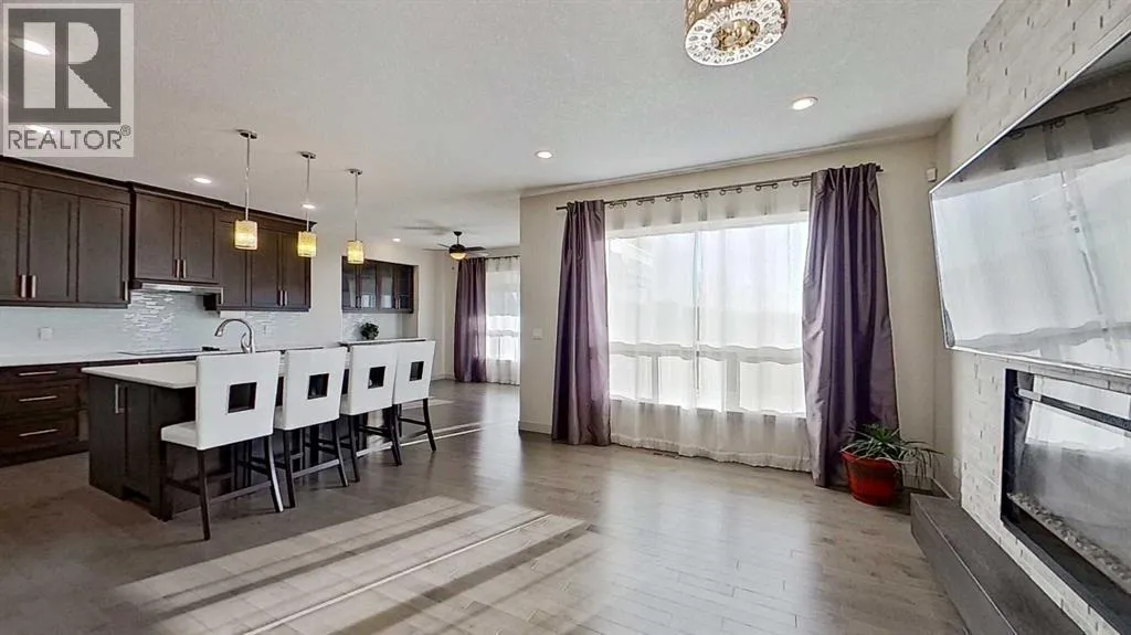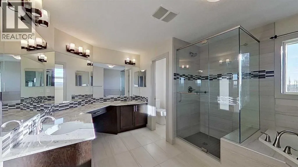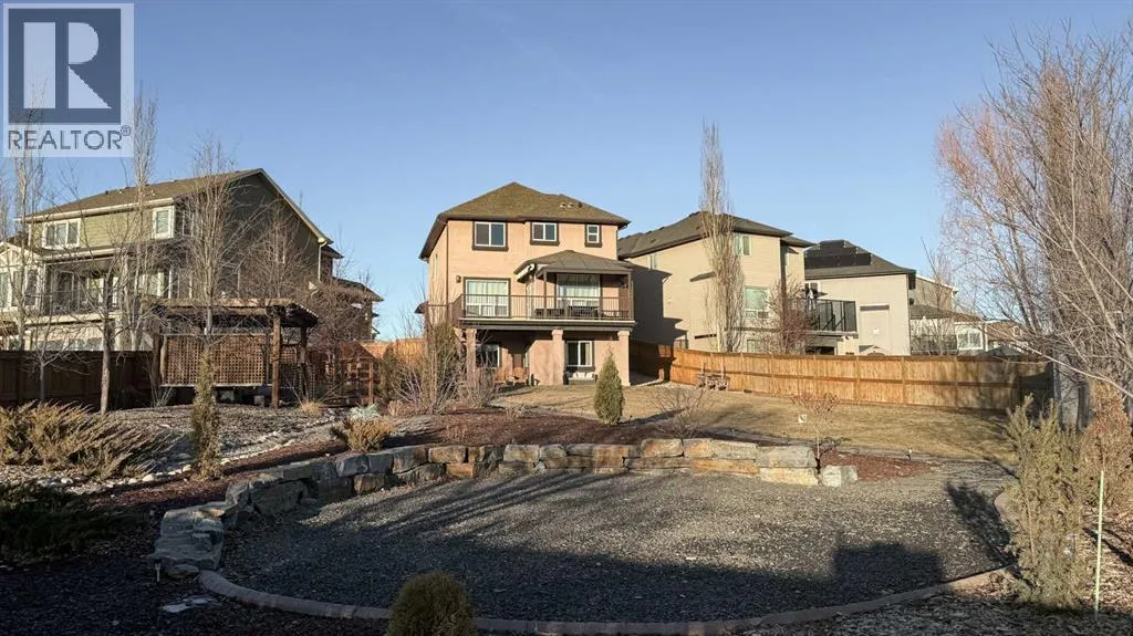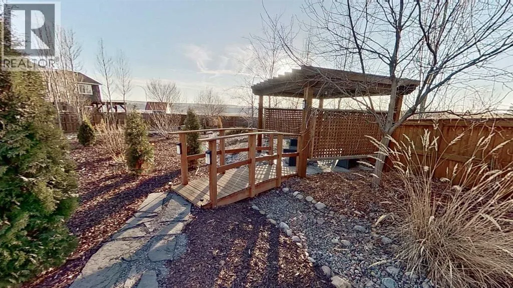 Exceptional home on one of the largest lots in Cranston, offering a rare pie-shaped, south-facing, professionally landscaped backyard on a quiet cul-de-sac. The outdoor space is truly unique, featuring a covered upper deck with awning, stone stairs leading to a gated backyard exit, a pergola, and two charming bridges connecting the yard-perfect for relaxing or entertaining. A fully developed walkout basement completes the seamless indoorâoutdoor living experience. The open-concept main floor showcases a striking floor-to-ceiling tiled electric fireplace, a dedicated main-floor office, and a convenient walk-through pantry, ideal for modern living. Upstairs, the spacious primary retreat includes a luxurious ensuite with his-and-hers sinks, a vanity area, a walk-in closet, and a private coffee bar. A large bonus room, two oversized bedrooms-each with walk-in closets, and a generous laundry room complete the upper level. The walkout basement offers outstanding versatility with two additional bedrooms, a full bathroom (10 mm glass shower) with heated tile floors, a large living area, and a wet bar with heated tile flooring, all with direct access to the backyard. Located in the highly sought-after community of Cranston, known for its family-friendly atmosphere, excellent schools, parks and pathway systems, proximity to Fish Creek Park and the Bow River, and easy access to Seton Urban District, South Health Campus, and major commuter routes (3 min walk to the bus stop). (id:27476)