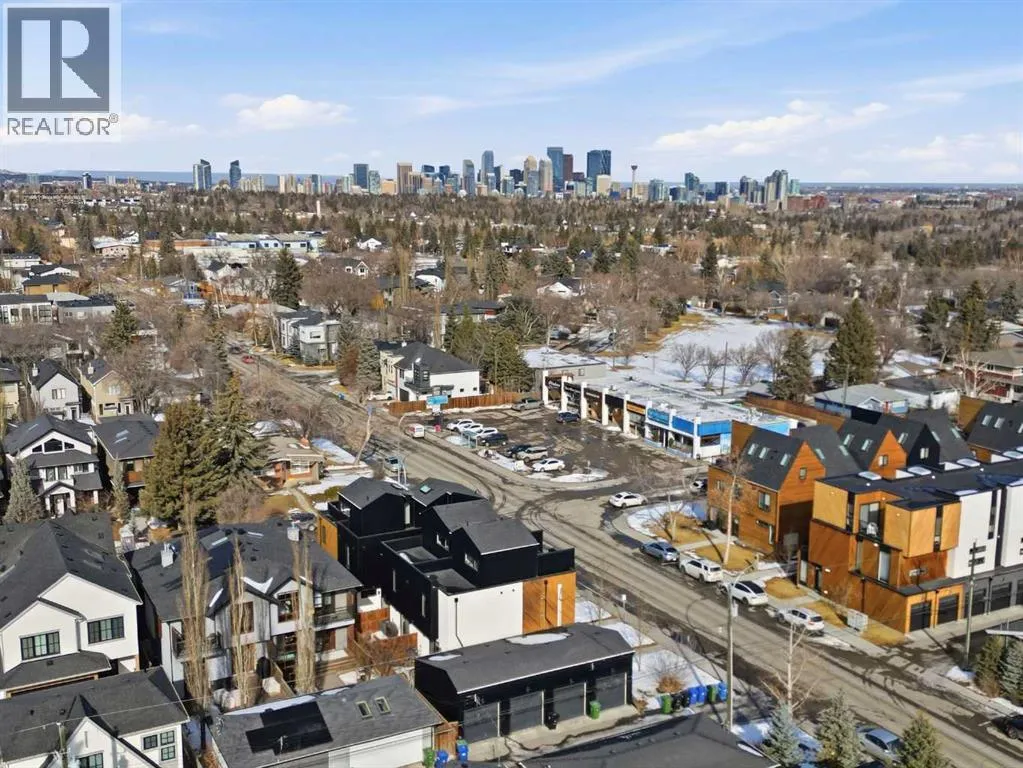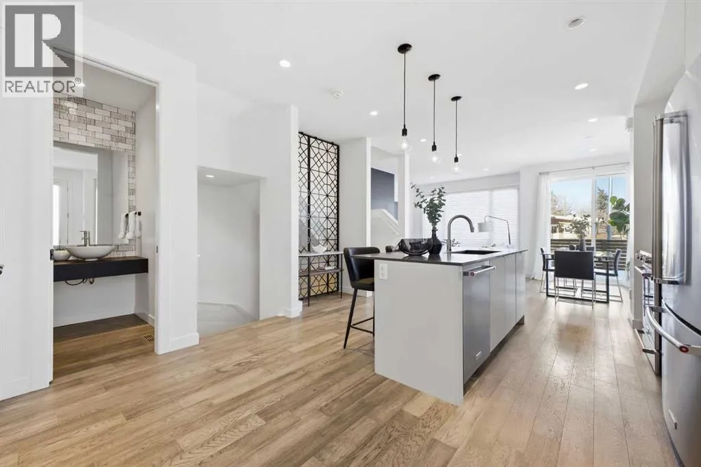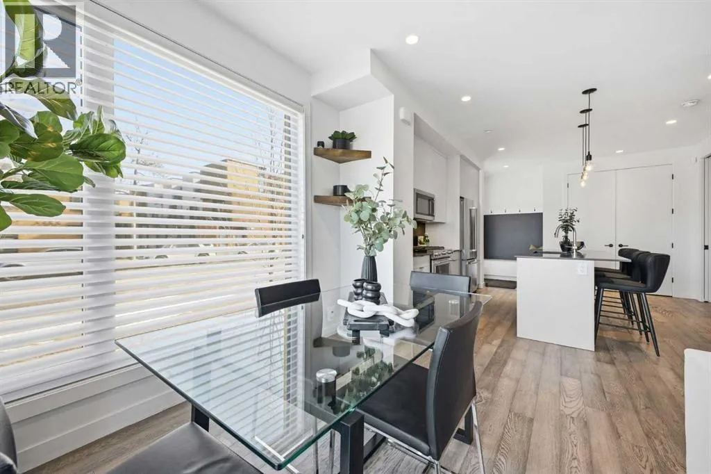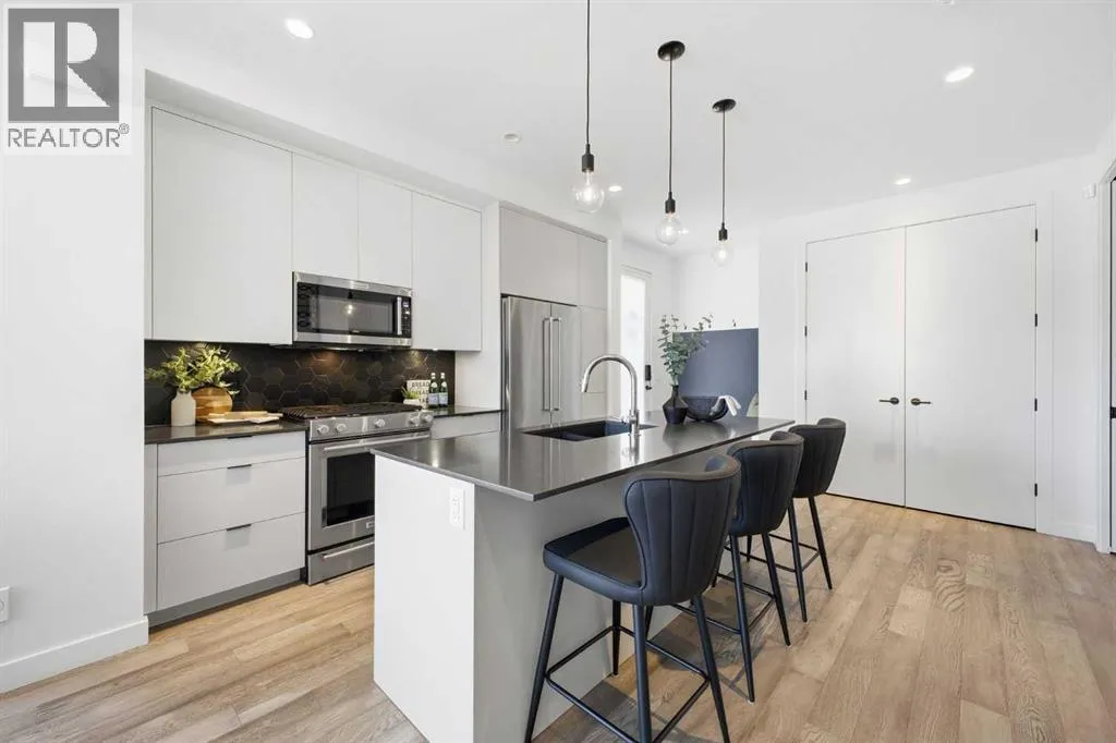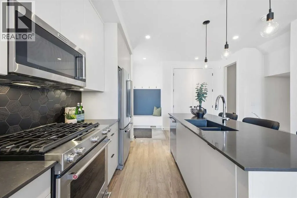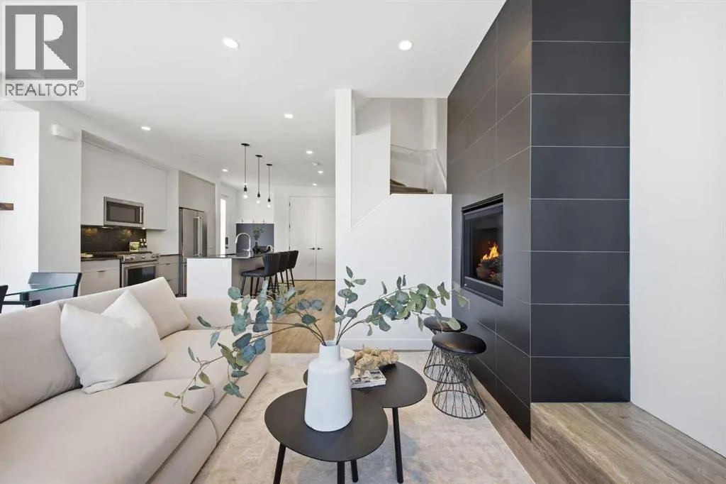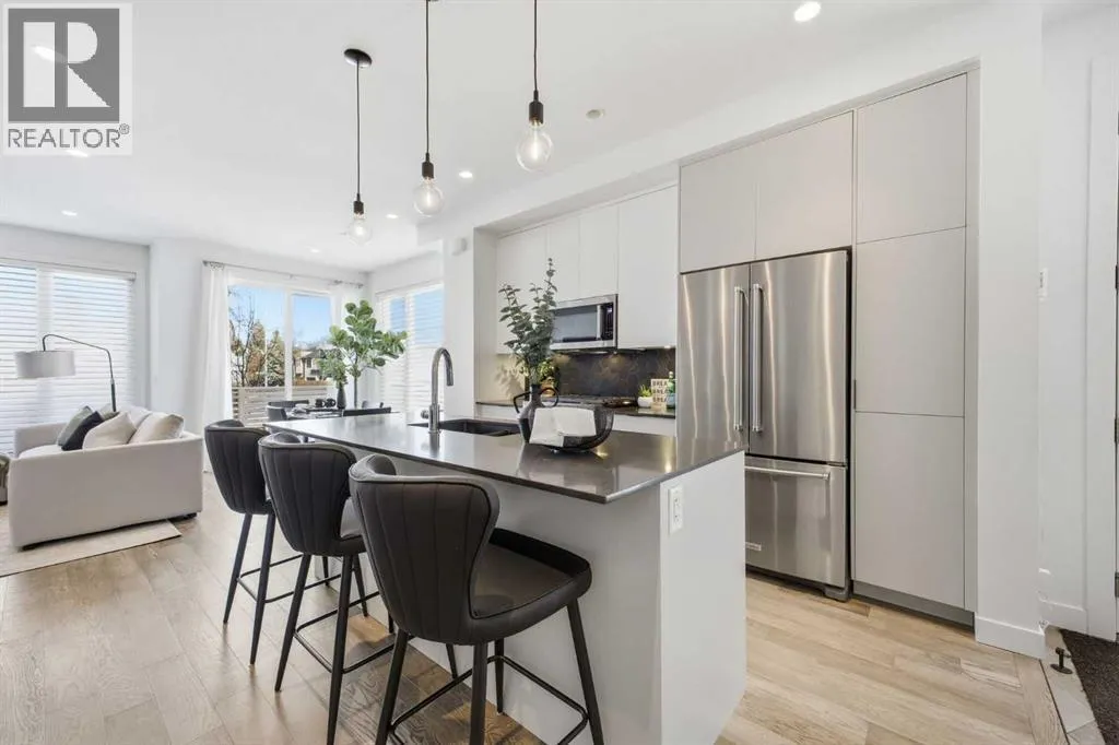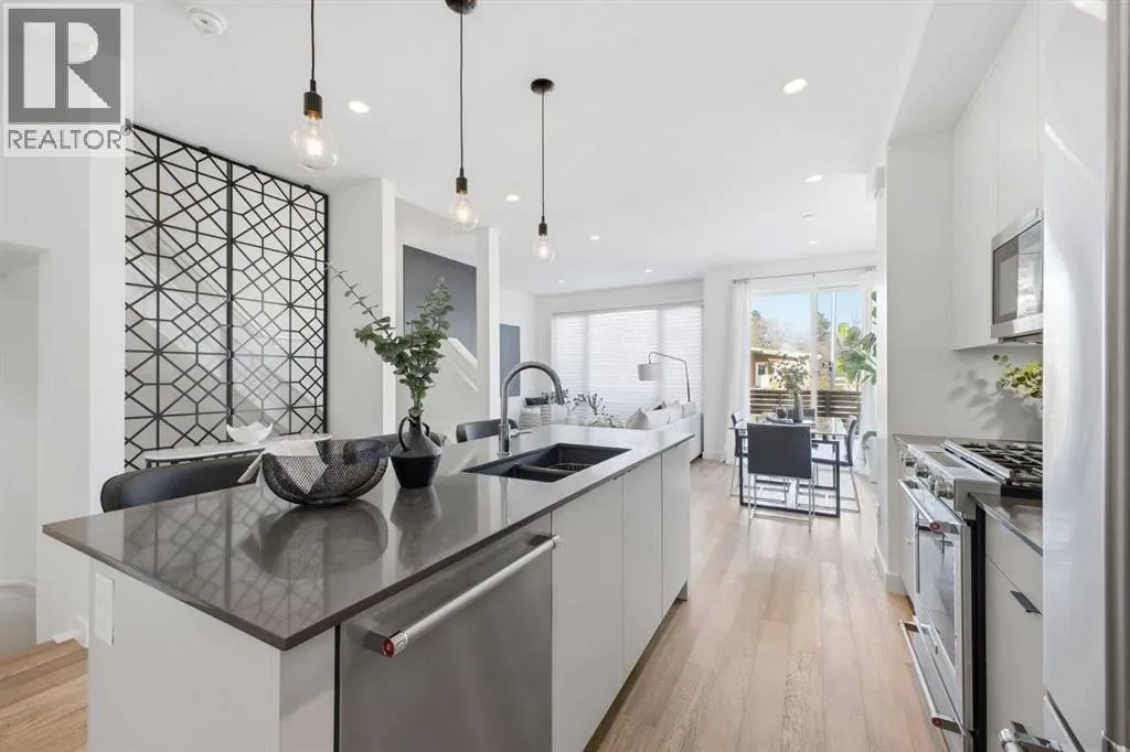OPEN HUSE SUNDAY, MARCH 22ND FROM 1-4 PM. Welcome to this beautifully designed three storey END UNIT townhome in the heart of Altadore, offering nearly 2,200 sq ft of refined living space enhanced by thoughtful upgrades and custom finishes throughout. The open and airy main level features a bright, contemporary layout anchored by a chefâs kitchen with quartz countertops, a large island with eating bar, abundant cabinetry, and stainless steel appliances. The adjoining dining area opens onto the deckâan ideal setting for hosting family and friendsâwhile the inviting living room with gas fireplace creates a warm, stylish space for everyday living and entertaining. The second level hosts two generously sized bedrooms, a well-appointed 4 piece bath, and convenient laundry. The private primary retreat includes a walk in closet and a secluded 4 piece ensuite with dual sinks and an oversized shower. The third floor loft, complete with a wet bar, offers exceptional flexibility as a media room, home office, studio, or lounge. From here, step out onto the private rooftop patio and enjoy sweeping viewsâan impressive extension of your living space. The fully finished basement adds even more versatility with a spacious recreation room, a third bedroom, and a full bathroomâperfect for guests or additional family needs. Outside, a large front patio provides another inviting spot to relax or entertain. Additional highlights include central air conditioning for year round comfort, heated bathroom floors throughout, and the convenience of a single detached garage. Set within one of Calgaryâs most desirable inner city communities, this home is steps from parks, schools, shopping, and the vibrant amenities of Marda Loop, with quick access to downtown. This Altadore townhome blends modern design, custom craftsmanship, and urban convenienceâan exceptional opportunity in a sought after location. (id:27476)