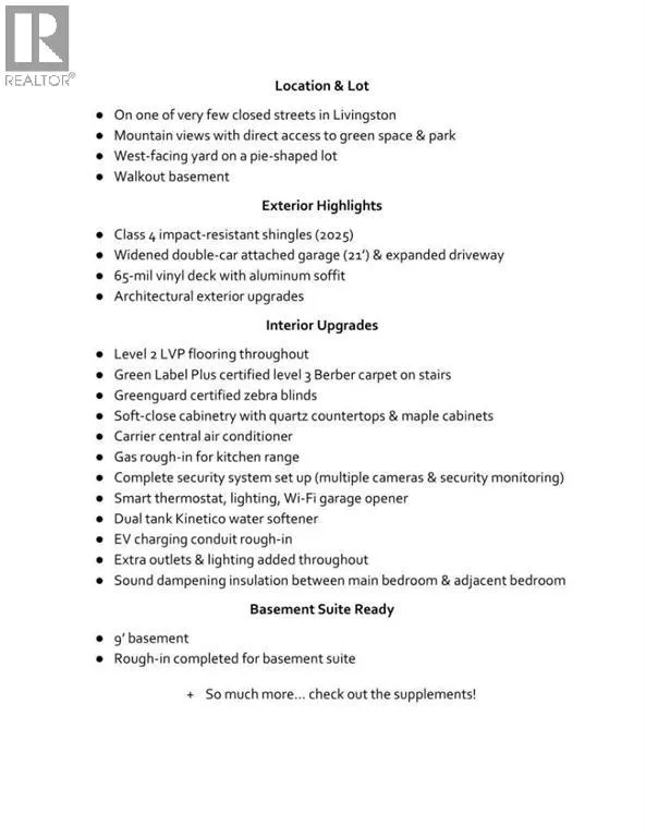 Rare opportunity to own a like-new walkout home on a massive west-facing pie lot backing onto green space, with mountain views on clear days! Built just over 2 years ago and located on one of Livingstonâs few quiet closed streets with no through traffic, this property offers privacy, views, and a lot size that is nearly impossible to replicate in newer developments.Welcome to 150 Lucas Close NW, offering nearly 1,800 sq ft above grade, a double attached garage, and a thoughtfully designed layout built for modern living. The bright main floor features an open concept design with a stylish kitchen complete with quartz countertops, soft-close maple cabinetry, Whirlpool appliances, and gas range rough-in, flowing into the dining area and living room with large windows and access to the rear deck overlooking the expansive backyard.Upstairs youâll find 3 bedrooms, a spacious primary retreat with a large walk-in closet and ensuite, upper floor laundry, another full bathroom, and a large bonus/family roomâperfect for families or additional living space. The layout was carefully designed with no bedrooms above the garage and sound-dampening insulation between key rooms for added comfort.The walkout basement with 9â ceilings is already roughed in for a future suite (subject to City approval), with drain rough-ins for kitchen, bathroom and laundry, a 200-amp electrical panel, gas connection, and separate door locks already installedâoffering excellent potential for future development.Additional features include Class 4 impact resistant shingles, central air conditioning, smart home upgrades, hardwired security cameras, EV charging conduit rough-in, widened double attached garage, expanded driveway parking, and an oversized backyard.And all this before even mentioning the incredible amenities that make Livingston one of Calgaryâs most exciting communities. Residents enjoy access to the impressive Livingston Hub, a 35,000 sq ft residentsâ association facility featuring skating rinks, tennis courts, playgrounds, splash park, indoor gathering spaces and year-round community programming. The neighbourhood is designed around outdoor living with extensive pathways, parks, and green spaces, while still offering convenient access to Stoney Trail, Deerfoot Trail, nearby shopping, schools, and the Calgary International Airport.A move-in ready home on one of the best lots in Livingston, combining location, privacy, and future potential. (id:27476)