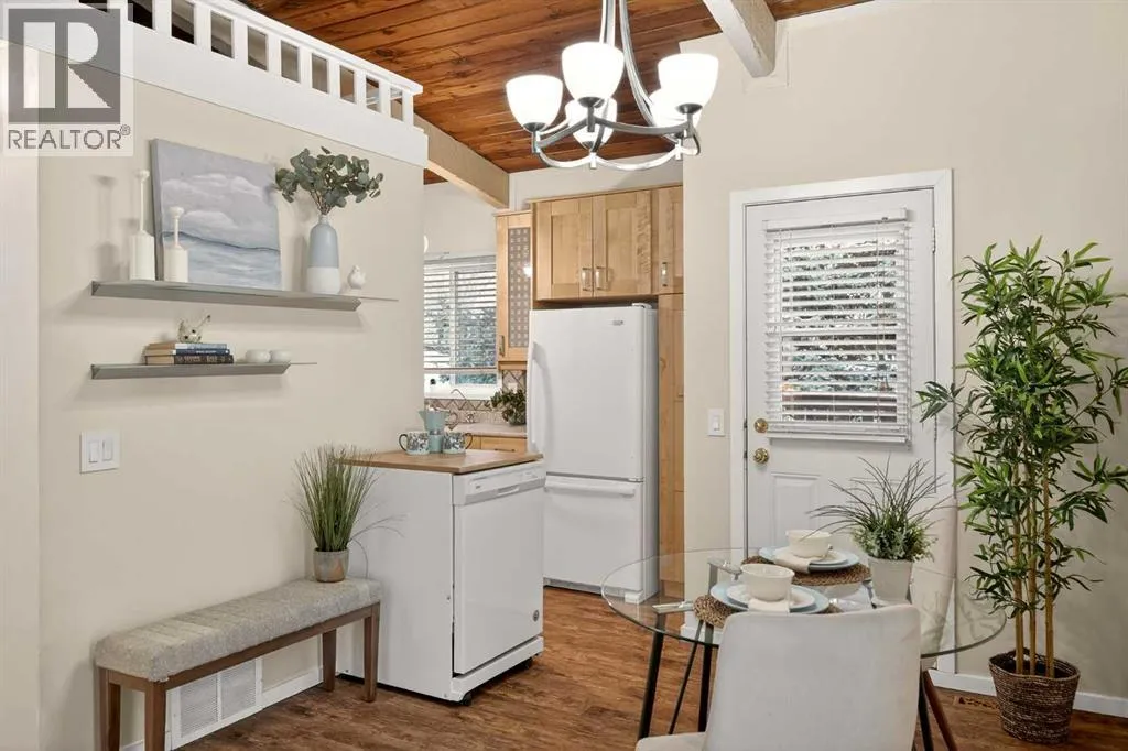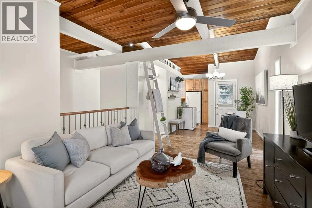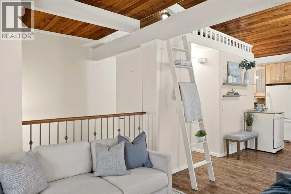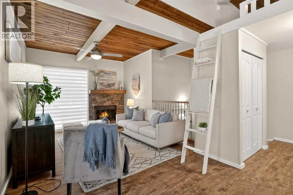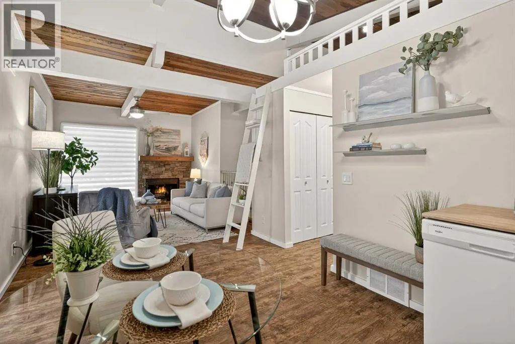 Tucked into a quiet corner of the complex and fronting a peaceful street, this UPDATED COTTAGE-CHIC townhouse feels like a little escape â the kind of place youâd hope to stumble upon for a weekend in the woods â yet itâs right here in the city. And best of all? Itâs not your typical cut-and-paste condo. This home has soul.Upstairs, WOOD-BEAMED VAULTED CEILINGS wrap the main living space in warmth and character, creating a cozy, open setting where the living, dining, and kitchen gather naturally under one inviting roofline. Itâs intimate without feeling tight â perfect for slow mornings with coffee, easy dinners with friends, and unhurried evenings curled up by the fireplace. The charmingly RENOVATED KITCHEN feels collected rather than cookie-cutter, blending thoughtful updates with cottage personality. And tucked above it all, a SWEET HIDEAWAY LOFT offers that rare bonus space â a secret nook for streaming, reading, overnight guests, or simply disappearing for a quiet moment.Downstairs, BOTH BEDROOMS are gently snuggled away, creating a calm and private retreat from the main living space. A clever bathroom and convenient laundry keep daily life simple and functional, while the thoughtful layout gives you that natural separation between gathering upstairs and resting below. This location delivers a sense of calm AND places you just steps from shopping, restaurants, cafés, and transit. Whether itâs a quick grocery run, dinner out, or an easy commute, everything you need is within walking distance, making day-to-day life effortless and connected.If youâve been waiting for something with heart â something that feels curated, cozy, and one-of-a-kind â this is it. Be sure to check out the video and virtual tour and call your favourite Realtor to book a showing today! (id:27476)