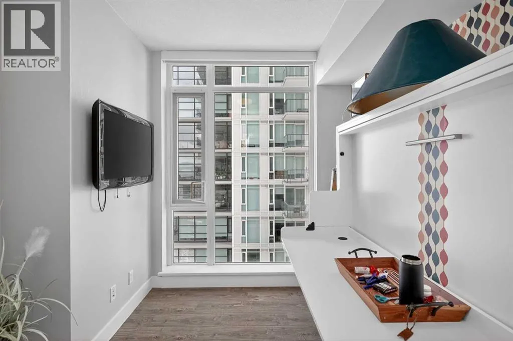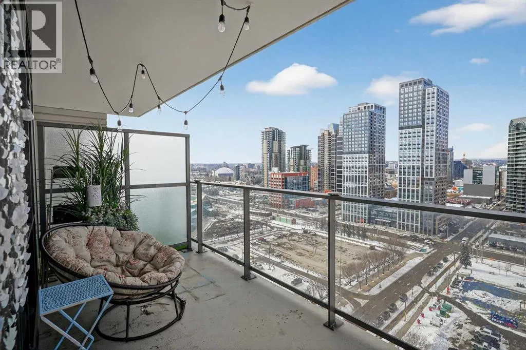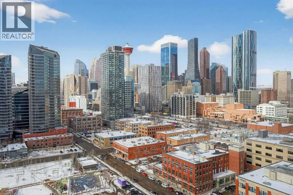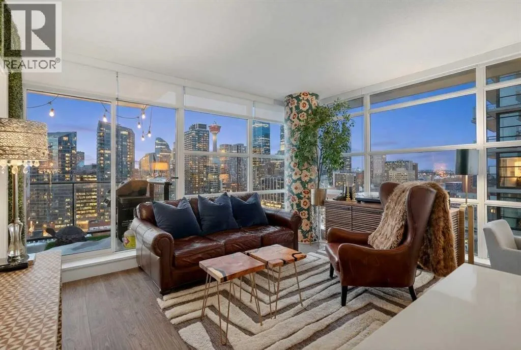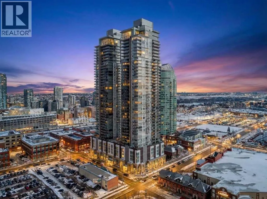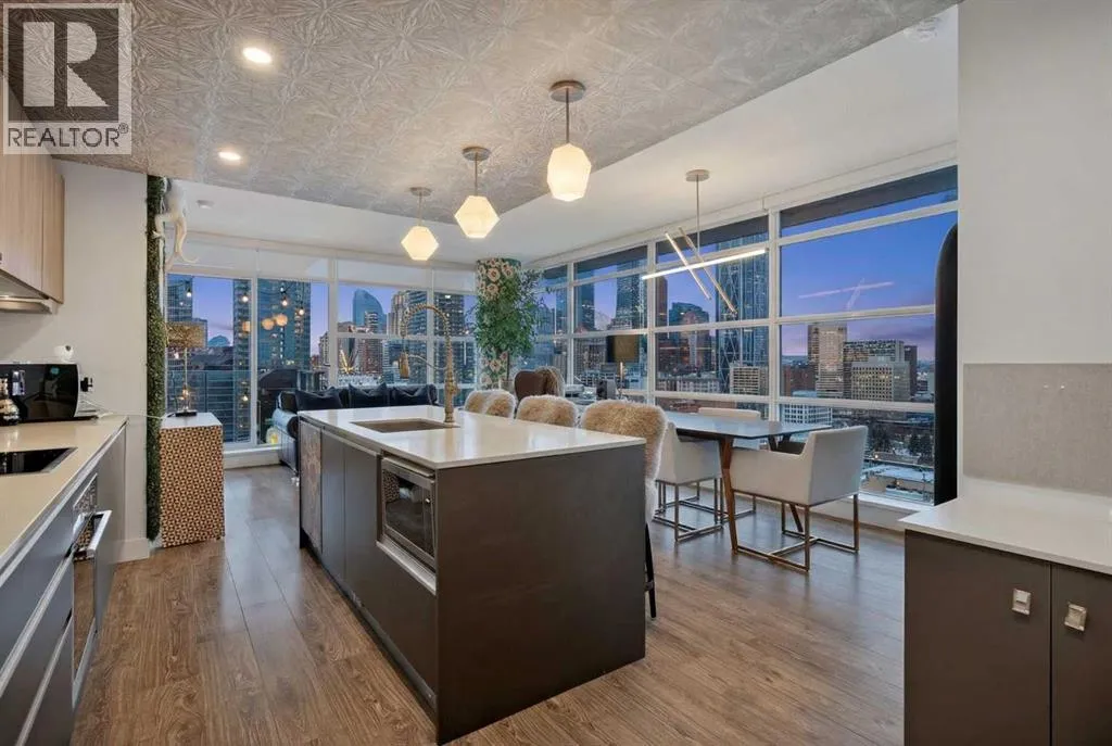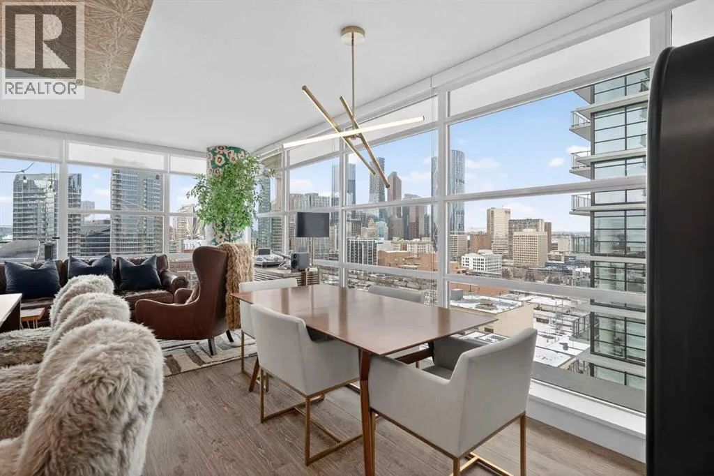 Welcome to the Gaurdian, South Tower. Truly one of Calgary's most sought after and spectacular buildings. This 2 bedroom, 2 bathroom home is unlike any other you have seen. Walking in you are greeted with gorgeous laminate floors, a white and gold feature wall and custom light fixtures. Entering into your open floor plan starts with your chef inspired kitchen with gold fixtures, custom built-in's in the cabinets and drawers, custom back splash, quartz counter tops and built-in stainless steel appliances. The large dining space is not something you normally find in a condo and is a great area to entertain or for quiet nights at home with the family. Your living room is a great size and offers you expansive VIEWS of DOWNTOWN, THE CALGARY TOWER, the MOUNTAINS, and connects to you west facing balcony. With this home being a corner unit you have amazing floor to ceiling windows offering views from every room. The primary bedroom is large enough for a king size bed as well as additional bedroom furniture and has a beautiful ensuite bathroom. The second bedroom is also a great size and has a custom MURPHY BED that was designed for the space and doubles as a home office. The second bathroom is custom designed and has a huge walk-in shower. The unit INCLUDES ALL TV'S AND MOUNTS as well as 2 TITLED SIDE BY SIDE UNDERGROUND PARKING SPACES!!!!! The Gaurdian has great amenities including a massive gym, social room, garden terrace, workshop, and is steps from the stampede grounds, great restaurants, shopping, bus and train routes giving you the best of downtown living. Do not miss out on your opportunity to own the most unique home in one of Calgary's most desired luxury buildings. (id:27476)