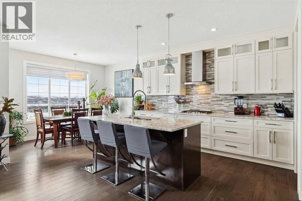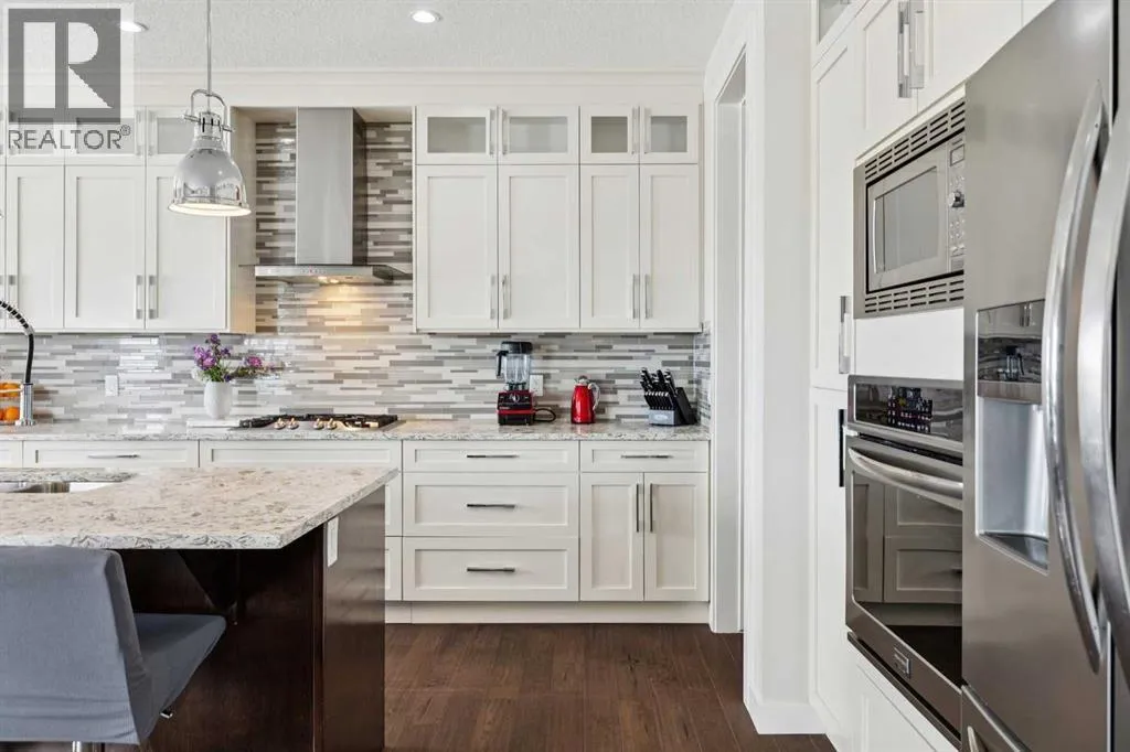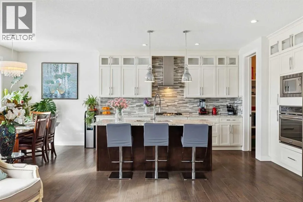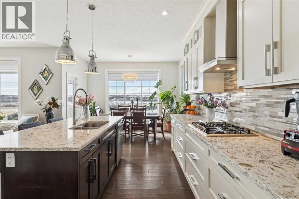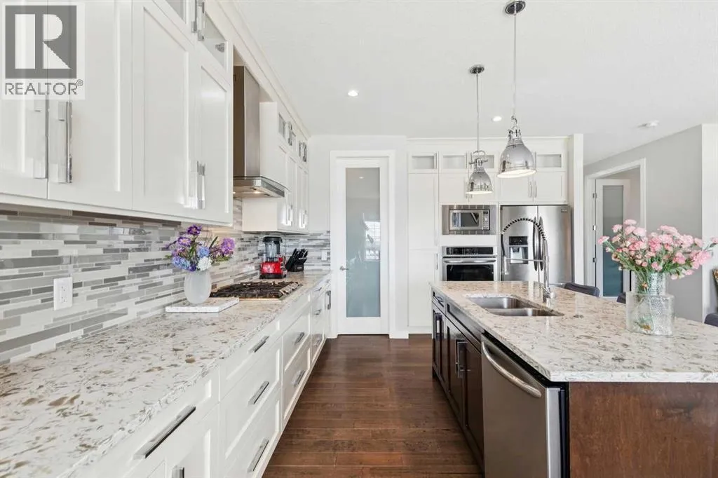 Boasting 3,558 sq ft of developed living space (2,559 sq ft above grade), this executive-level residence offers uninterrupted SW views across the expansive Cranston Escarpment green space toward the breathtaking Canadian Rockies. With its coveted SW exposure, the home is drenched in natural light throughout the day, creating a warm & inviting atmosphere all day long. A dramatic two-storey vaulted ceiling welcomes you into the highly functional floor plan. Designed with entertaining in mind, the open-concept main floor showcases stunning views from every angle. The living room is anchored by a beautiful gas fireplace with custom built-ins, creating a refined & comfortable gathering space. The chef-inspired kitchen features a gas cooktop, built-in wall oven, & a substantial island offering generous prep space & seating for family/guests. The dining area sits adjacent to the kitchen, perfectly positioned to take in the impressive SW mountain views. Step out onto the spacious balcony to enjoy uninterrupted views & spectacular sunsets. The large mudroom & a walk-through pantry provide the utmost in convenience. A dedicated main floor den/office & a 2pc powder room complete the main. Upstairs, youâll find three generously sized bedrooms. The primary retreat captures the same spectacular views & offers a large walk-in closet & a decadent 5-piece ensuite. One of the secondary bedrooms features a cheater door to the well appointed 4pc bathroom. A spacious bonus room is ideal for family movie nights & the upper laundry room includes additional storage & a utility sink. The fully developed walk-out lower level is filled with natural light, it truly doesnât feel like a basement. This level includes a 2nd kitchen area, a 2nd washer & dryer, a 4th bedroom, & a large recreation space, making it ideal for extended family, teens, or multi-generational living. Step outside to the low-maintenance landscaping complete with a stone patio & walkway. The rear gate opens directly onto expa nsive green space & endless community pathways. The oversized double attached garage features over-height ceilings, offering an abundance of storage options & excellent flexibility for larger vehicles or additional shelving. With the completion of the new Ring Road, commuting around the city is convenient, & schools of all levels are just minutes away. The stunning SW exposure & panoramic mountain views must be experienced to be fully appreciated, watch the seasons change & enjoy the ever evolving beauty of the Rockies from all three levels of this exceptional home. Call for more information! (id:27476)
