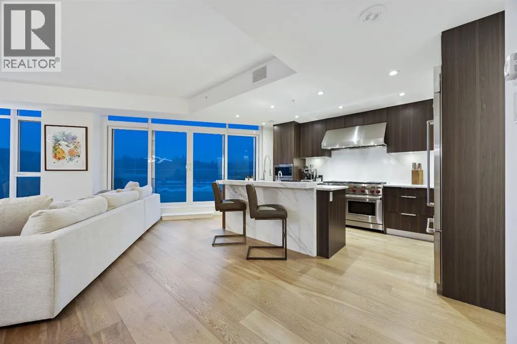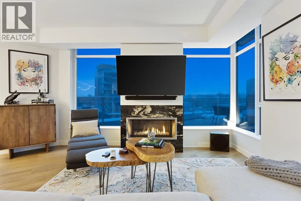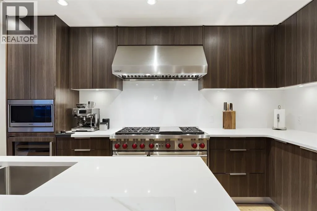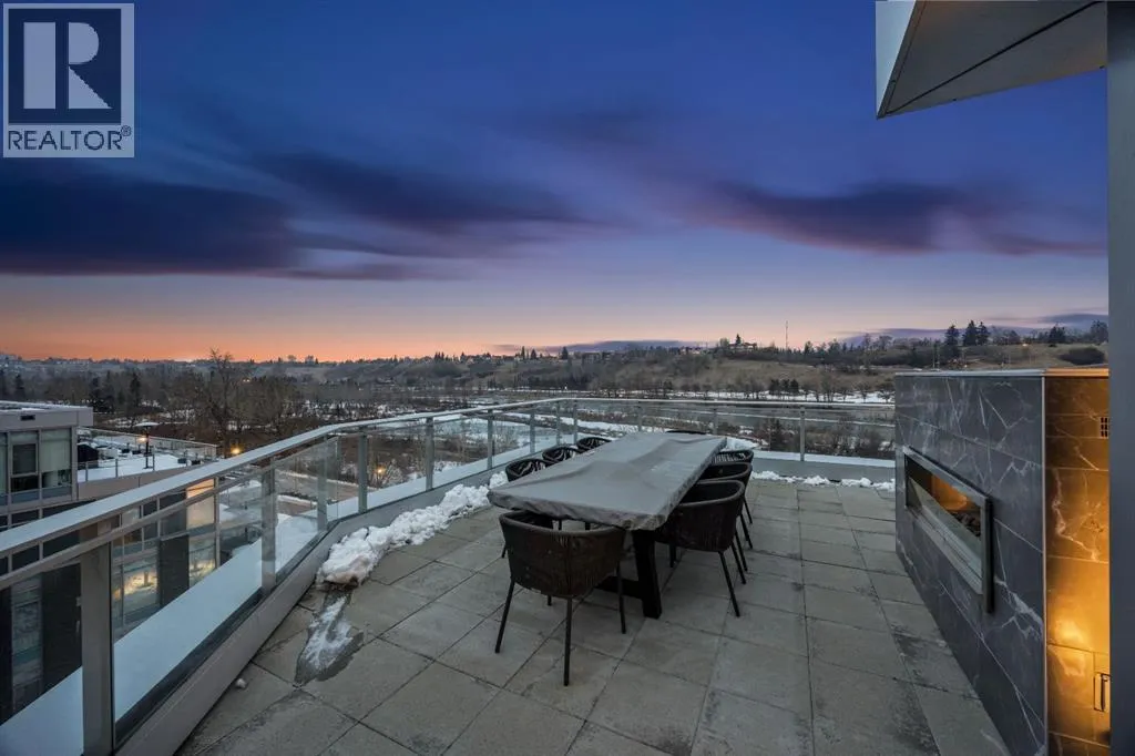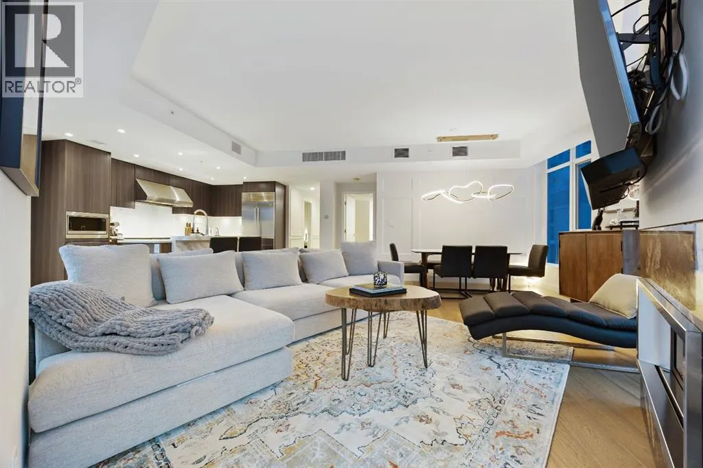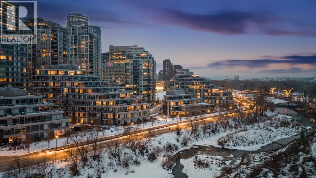 Rare opportunity to own an extensively upgraded executive residence in Parkside at Waterfront, ideally positioned along the scenic Bow River and overlooking Prince's Island Park. Offering over 1,300 square feet of refined living space, this beautifully upgraded suite features an exceptional 731 square feet wraparound patio complete with a hot tub and built-in gas fireplace, perfect for enjoying riverfront views in one of Calgaryâs most picturesque settings. A spacious foyer leads to a striking hallway with coffered wall detailing and feature art lighting. The open concept living and dining areas are anchored by a gas fireplace and surrounded by expansive windows that flood the home with natural light. The upgraded chefâs kitchen showcases quartz counters, a large island, Sub-Zero refrigerator and wine fridge, instant hot water, and a 6-burner Wolf gas range with double ovens and a 1200 CFM professional hood fan. The spacious primary retreat offers custom closet shelving, sconces, automated Hunter Douglas blinds with blackout feature, and a luxurious ensuite with dual sinks, soaker tub, and separate shower. A generous second bedroom features its own ensuite and custom closet shelving, while a versatile den is ideal for a home office or pantry. A third full bathroom provides added convenience for guests. Additional highlights include two heated underground parking stalls, storage locker and access to the outstanding amenities at Parkside at Waterfront, including a fitness centre, steam room, hot tub, and party room. Enjoy an unbeatable lifestyle on Calgaryâs Bow River pathway system with easy walkability to Downtown Calgary, Eau Claire Athletic Club, Kensington Village, and Princeâs Island Park. This is an incredible opportunity to own the only riverfront unit with a private hot tub in the complex. (id:27476)