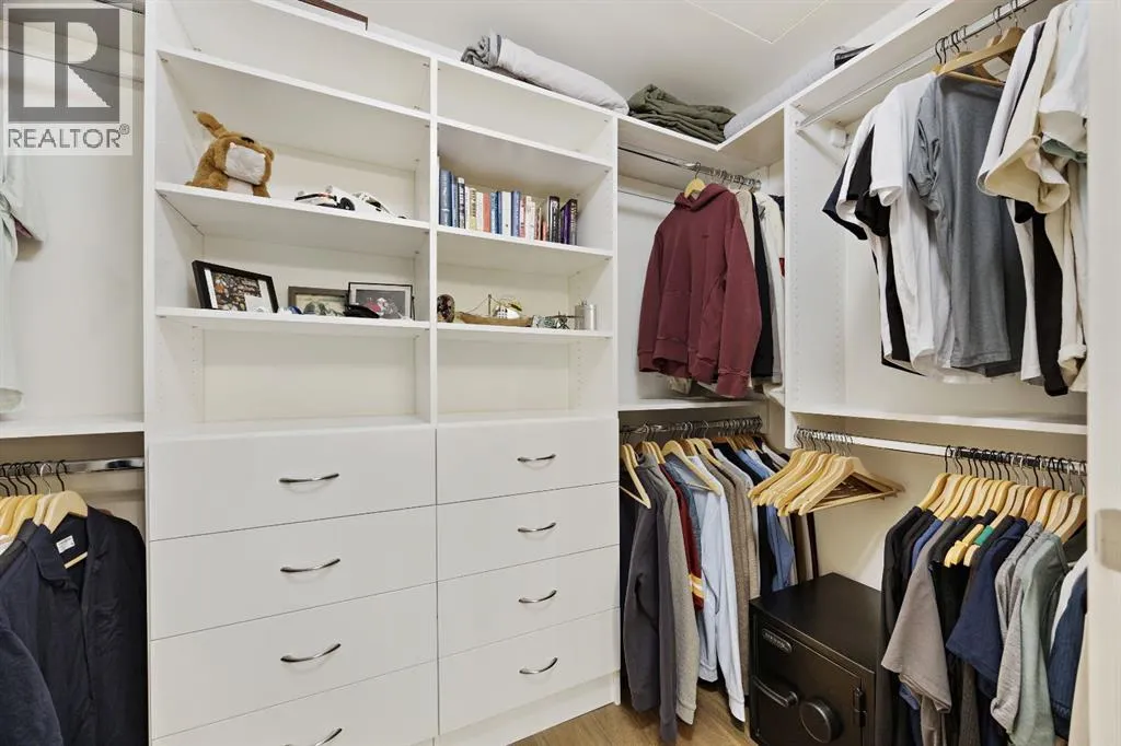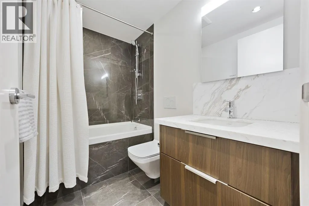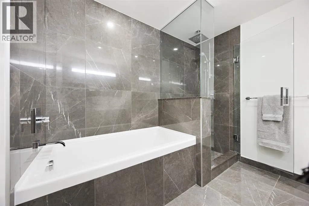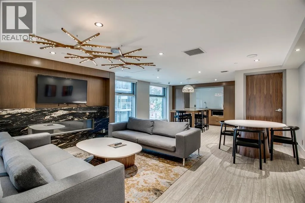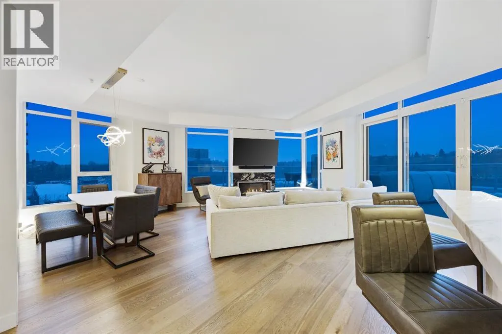 Rare opportunity to own an extensively upgraded executive residence in Parkside at Waterfront, ideally positioned along the scenic Bow River and overlooking Prince's Island Park. Offering over 1,300 square feet of refined living space, this beautifully upgraded suite features an exceptional 731 square feet wraparound patio complete with a hot tub and built-in gas fireplace, perfect for enjoying riverfront views in one of Calgaryâs most picturesque settings. A spacious foyer leads to a striking hallway with coffered wall detailing and feature art lighting. The open concept living and dining areas are anchored by a gas fireplace and surrounded by expansive windows that flood the home with natural light. The upgraded chefâs kitchen showcases quartz counters, a large island, Sub-Zero refrigerator and wine fridge, instant hot water, and a 6-burner Wolf gas range with double ovens and a 1200 CFM professional hood fan. The spacious primary retreat offers custom closet shelving, sconces, automated Hunter Douglas blinds with blackout feature, and a luxurious ensuite with dual sinks, soaker tub, and separate shower. A generous second bedroom features its own ensuite and custom closet shelving, while a versatile den is ideal for a home office or pantry. A third full bathroom provides added convenience for guests. Additional highlights include two heated underground parking stalls, storage locker and access to the outstanding amenities at Parkside at Waterfront, including a fitness centre, steam room, hot tub, and party room. Enjoy an unbeatable lifestyle on Calgaryâs Bow River pathway system with easy walkability to Downtown Calgary, Eau Claire Athletic Club, Kensington Village, and Princeâs Island Park. This is an incredible opportunity to own the only riverfront unit with a private hot tub in the complex. (id:27476)