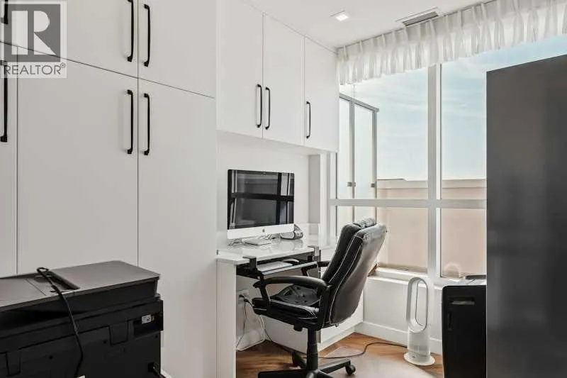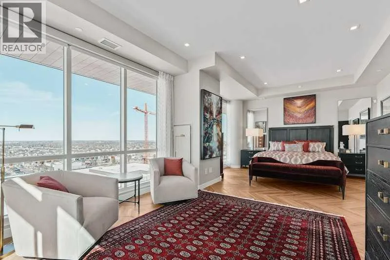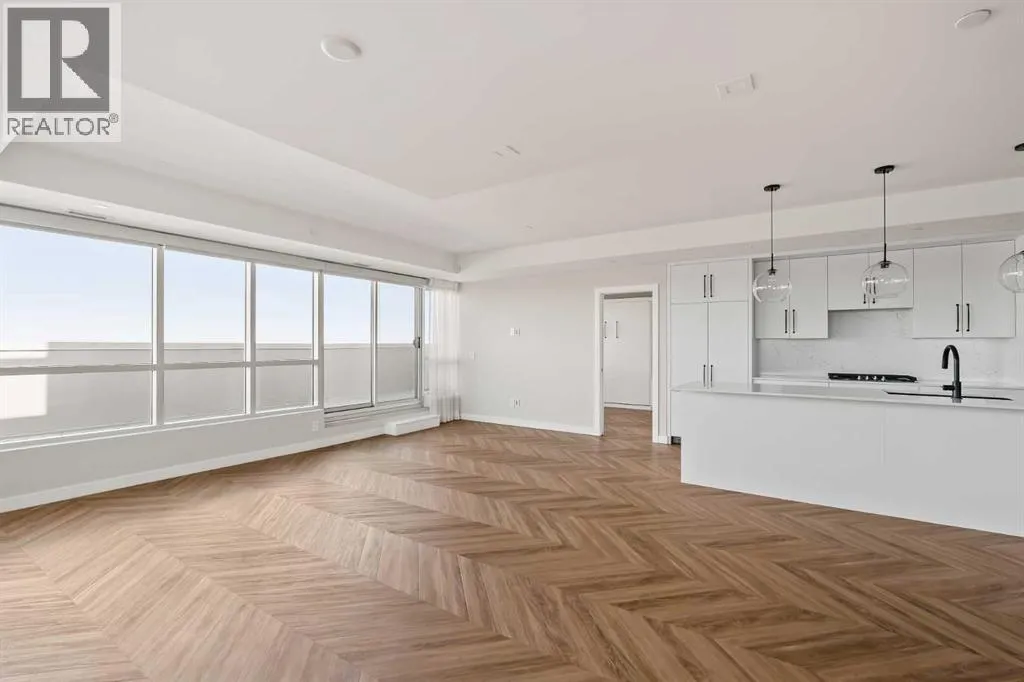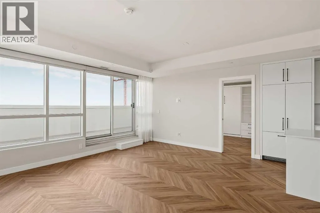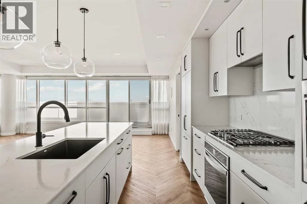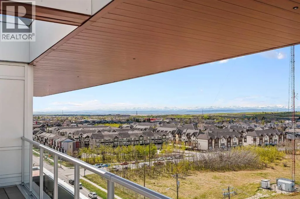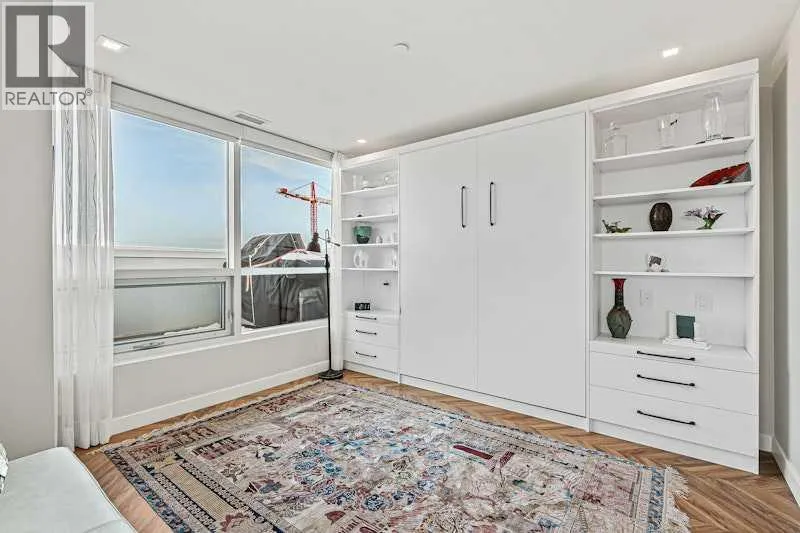Proudly presenting Suite 717, the most coveted West facing corner penthouse in the prestigious Gateway buildings. This extraordinary home offers stunning panoramic mountain views, evening sunsets, impeccable custom upgrades, and a lifestyle of sophistication and comfort. Thoughtfully designed, the home features electric blackout blinds on all windows, a high-end security system with burglar-proof locks, and a versatile main floor with a custom Murphy bed, built-in office, two separate office spaces, refined window treatments, a customized laundry room, and comfort-raised toilets. The gourmet kitchen is a true showpiece, boasting a single bowl sink, garburator, oversized globe pendant lights, dimmable lighting, and upgraded pull out waste bins. Additional luxuries include two premium parking stalls directly outside of the elevator, two storage lockers, accessibility features throughout, and a bonus spacious in suite storage area under the stairs. This penthouse also comes with air conditioning, chevron flooring, quartz countertops, LED square pot lights, solid core doors, soft close drawers, and a gas line on the patio. Built in 2019 with concrete construction and exceptional soundproofing, this boutique style building is unlike anything else in the city. Residents enjoy access to a rooftop patio, stylish residents' lounge, concierge service, visitor parking, EV chargers, and secure bike storage. Located in the Trendy West District this property is steps from Sobeys, Big T's BBQ, UNA Pizza, Deville Coffee, F45 Gym, Hankki, YYC Cycle, and more, with quick access to Old Banff Coach Road, Stoney Trail, and nearby mountain escapes. The fast growing West District will soon offer over 1 million square feet of retail and commercial space, designed for a walkable lifestyle with 20-ft sidewalks and bike paths. Just 15 minutes from downtown, 5 minutes to Winsport, and 60 minutes to the Rockies, Suite 717 offers unmatched urban convenience with a breathtaking natural backdrop. Book your showing today! (id:27476)
