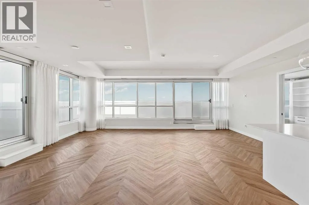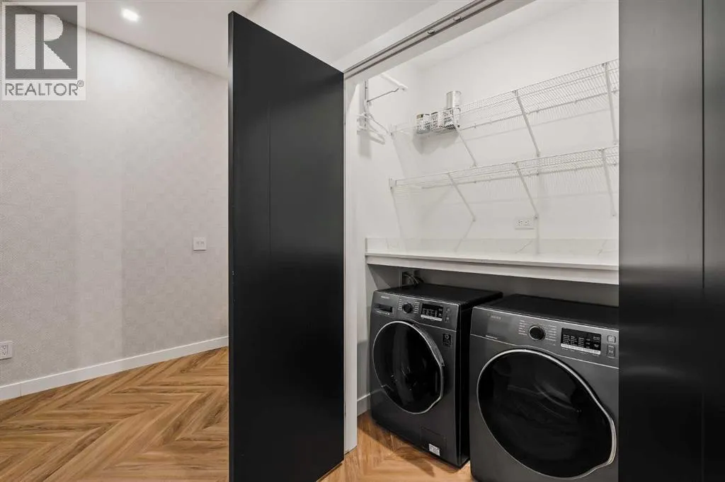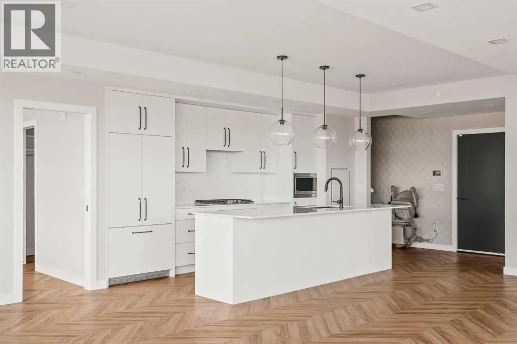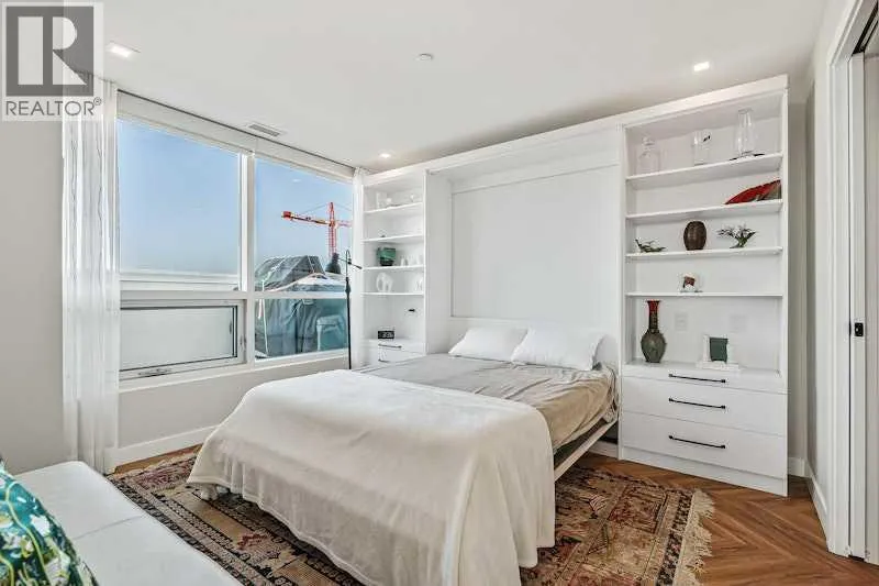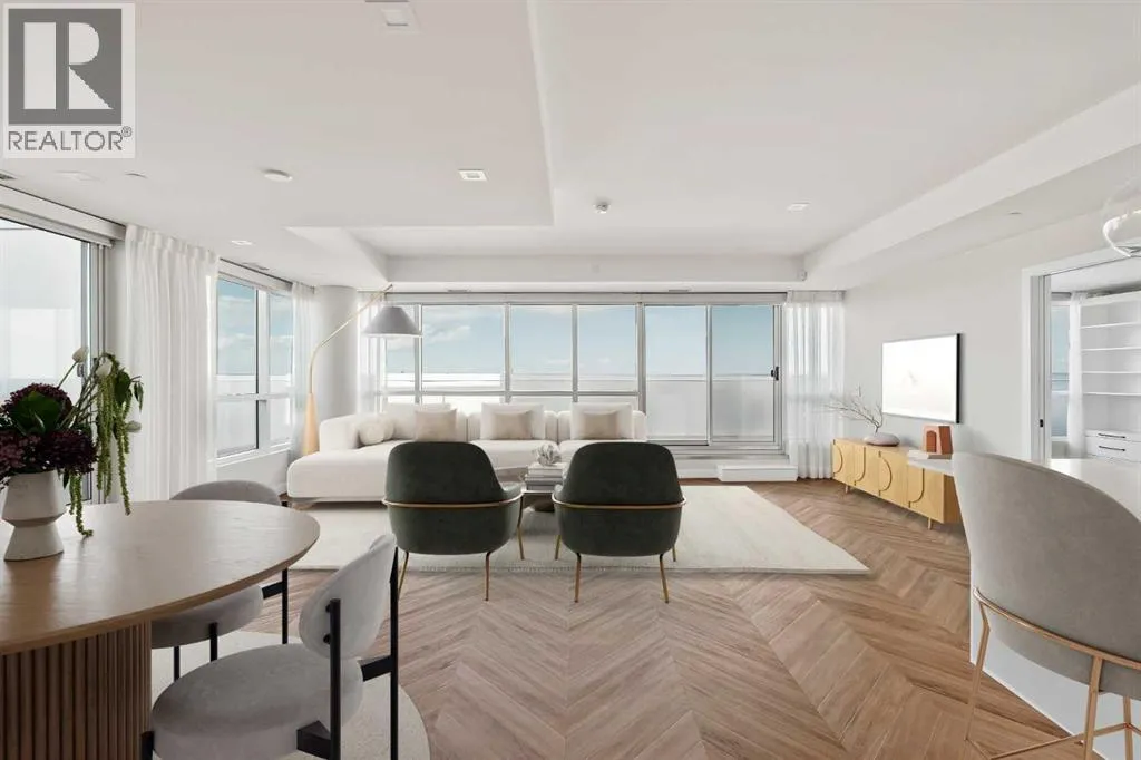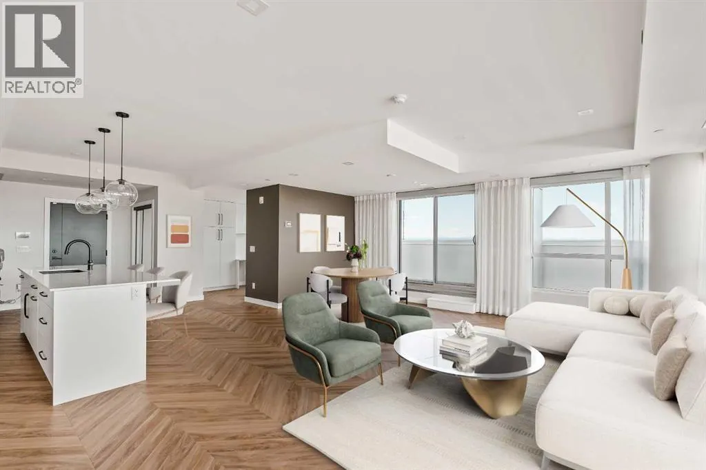 Proudly presenting Suite 717, the most coveted West facing corner penthouse in the prestigious Gateway buildings. This extraordinary home offers stunning panoramic mountain views, evening sunsets, impeccable custom upgrades, and a lifestyle of sophistication and comfort. Thoughtfully designed, the home features electric blackout blinds on all windows, a high-end security system with burglar-proof locks, and a versatile main floor with a custom Murphy bed, built-in office, two separate office spaces, refined window treatments, a customized laundry room, and comfort-raised toilets. The gourmet kitchen is a true showpiece, boasting a single bowl sink, garburator, oversized globe pendant lights, dimmable lighting, and upgraded pull out waste bins. Additional luxuries include two premium parking stalls directly outside of the elevator, two storage lockers, accessibility features throughout, and a bonus spacious in suite storage area under the stairs. This penthouse also comes with air conditioning, chevron flooring, quartz countertops, LED square pot lights, solid core doors, soft close drawers, and a gas line on the patio. Built in 2019 with concrete construction and exceptional soundproofing, this boutique style building is unlike anything else in the city. Residents enjoy access to a rooftop patio, stylish residents' lounge, concierge service, visitor parking, EV chargers, and secure bike storage. Located in the Trendy West District this property is steps from Sobeys, Big T's BBQ, UNA Pizza, Deville Coffee, F45 Gym, Hankki, YYC Cycle, and more, with quick access to Old Banff Coach Road, Stoney Trail, and nearby mountain escapes. The fast growing West District will soon offer over 1 million square feet of retail and commercial space, designed for a walkable lifestyle with 20-ft sidewalks and bike paths. Just 15 minutes from downtown, 5 minutes to Winsport, and 60 minutes to the Rockies, Suite 717 offers unmatched urban convenience with a breathtaking natural backdrop. Book your showing today! (id:27476)