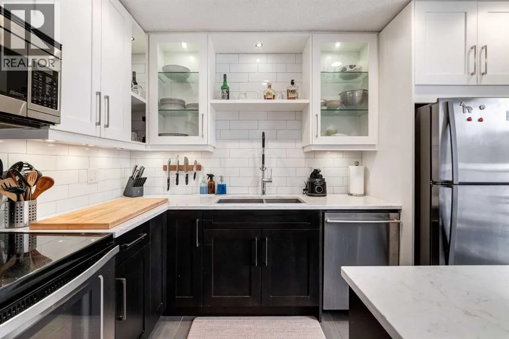Welcome to Heatherington Estates in the desirable community of Kelvin Grove. This beautifully updated townhome offers 1,402 SF above grade, an attached single garage, a sunny front WEST facing balcony and a private fenced rear patio. The main level features a bright and spacious living room with gorgeous original hardwood floors and large windows that flood the space with natural light. The fully renovated kitchen is a standout, showcasing custom cabinetry, quartz countertops, undercabinet lighting, stainless steel appliances, subway tile backsplash, trendy tile flooring and a large island with seating perfect for both everyday living and entertaining. A convenient 3 piece bathroom stylishly upgraded with a tiled shower, tile flooring and quartz countertop vanity, creates a clean and modern space completing this floor. Upstairs youâll find two generous bedrooms, both with hardwood flooring and a full bathroom. The spacious primary retreat offers a walk-in closet. The lower level offers a large developed flex room ideal for a media room, home office or potential third bedroom, along with access to the attached garage. Ideally located with quick access to Glenmore Trail, Elbow Drive and Macleod Trail, and just minutes from Chinook Centre, transit and numerous amenities, this is an exceptional opportunity to own a beautifully updated home in a prime central location. (id:27476)