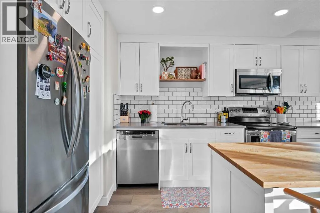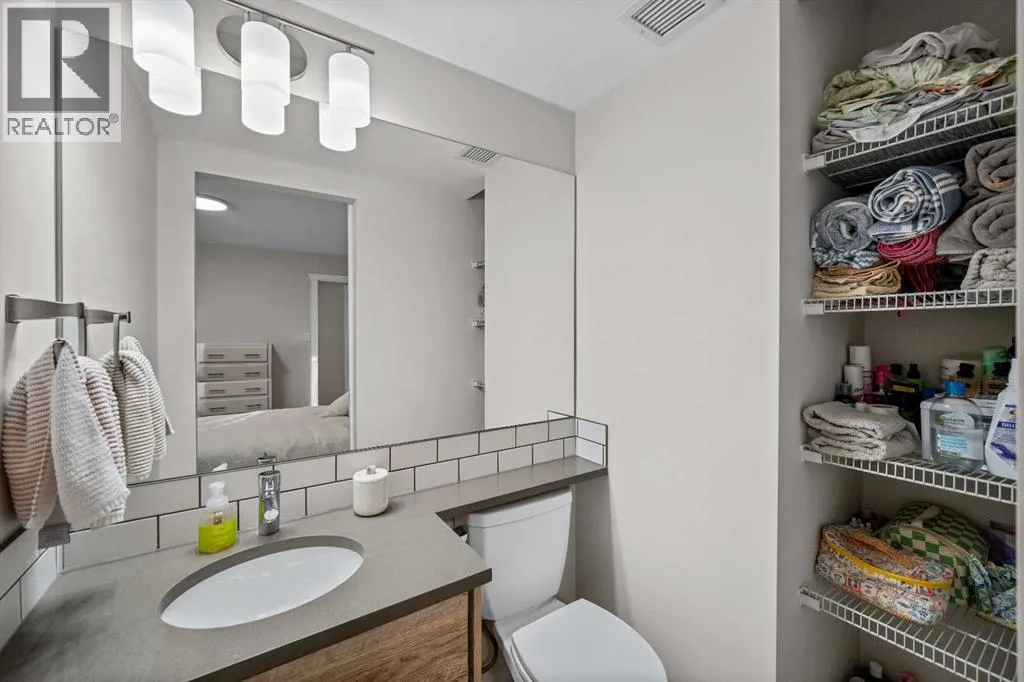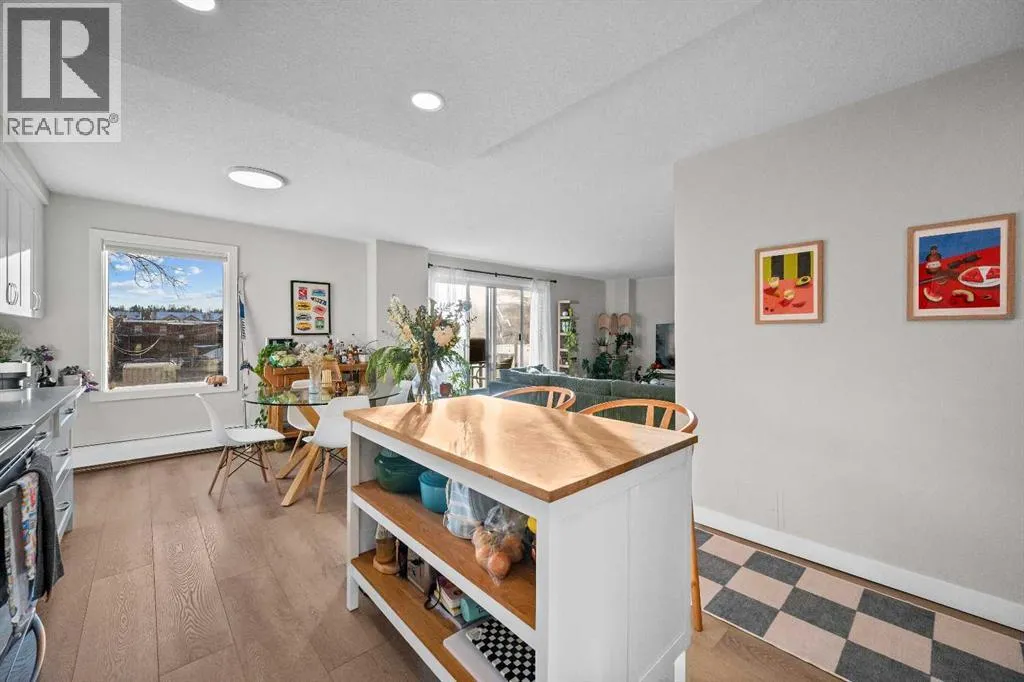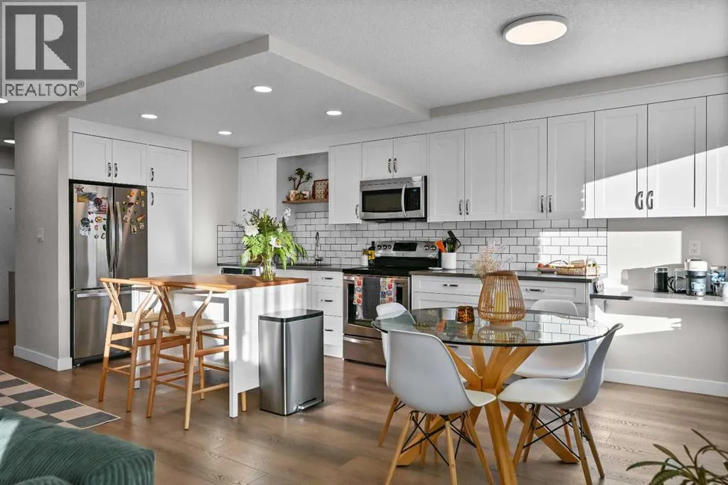 2 BEDS | 2 BATHS | QUARTZ COUNTERTOPS | SOUTH-FACING BALCONY | HEATED UNDERGROUND PARKING | PET-FRIENDLY CONCRETE BUILDING | FULLY RENOVATED | VINYL PLANK FLOORINGBeautifully renovated bright corner unit in the heart of the Beltline offering exceptional value and move-in ready convenience. The open-concept layout features a white kitchen with quartz countertops, subway tile backsplash, soft-close cabinets, pot drawers, pantry storage, built-in desk, and a free-standing island for added prep and storage.The spacious living room is filled with natural light and opens onto a large south-facing balcony with updated glass panels. Both bedrooms are generous in size with built-in closet organizers, while the primary bedroom includes a private 2-piece ensuite behind a barn door.The main 4-piece bathroom is fully renovated, and the entire condo features durable vinyl plank flooring. A convenient in-unit storage room with stacking washer and dryer completes the space.Additional features include heated underground parking, bike storage, and a quiet, well-managed concrete building that is pet-friendly.Located steps from Connaught Park and the off-leash area, and within walking distance to 11 Street shops and cafés, 17 Avenue restaurants and nightlife, Co-op Midtown, GoodLife Fitness, Urban Fare, Community Natural Foods, and excellent transit access.Turn-key living in one of Calgaryâs most walkable neighborhoods. (id:27476)