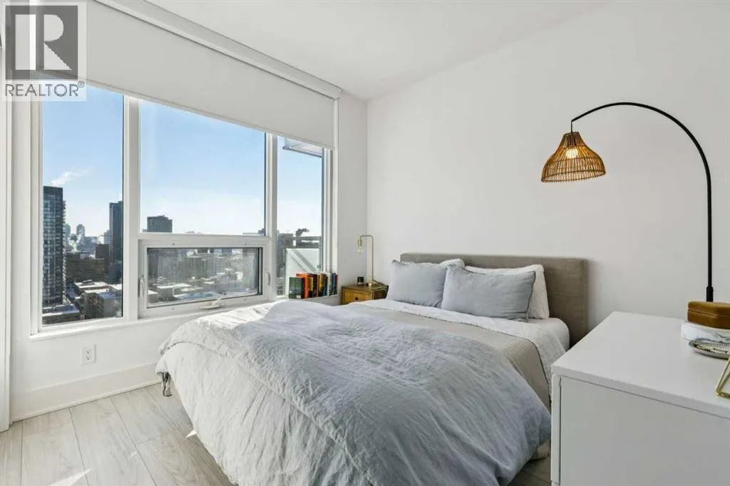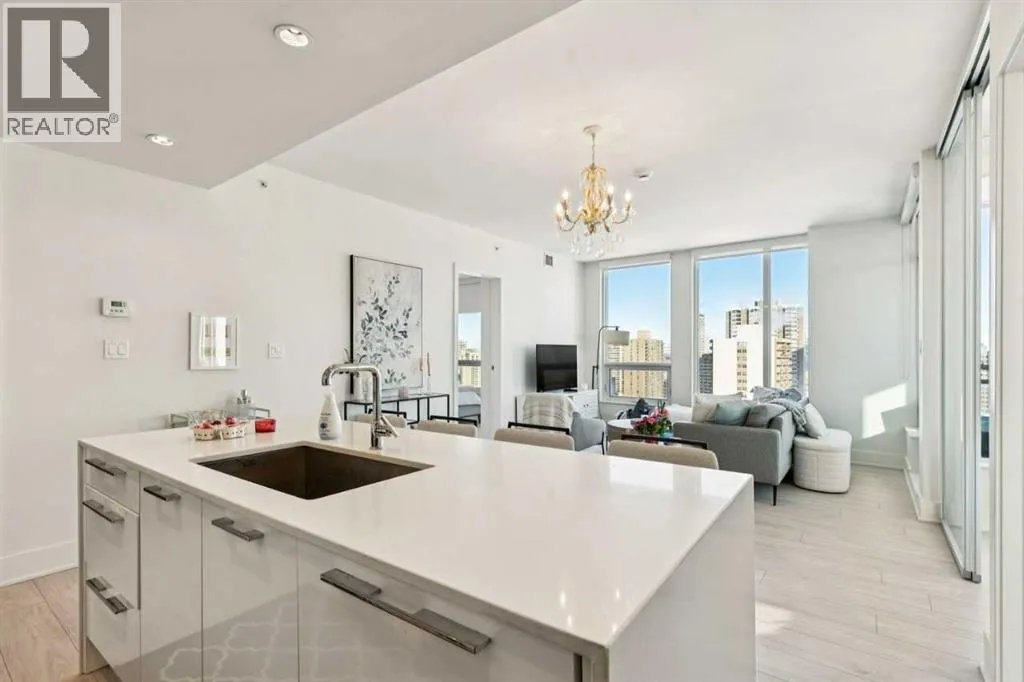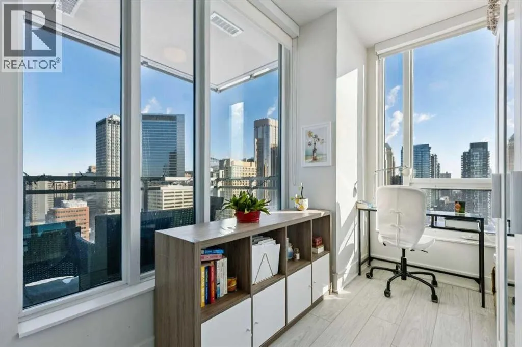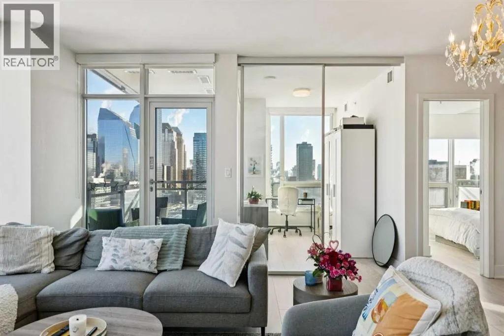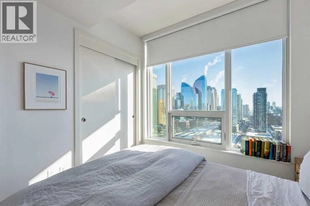 Live, work and play at The Mark on 10th. Perched on the 20th floor, this bright and spacious corner unit offers breathtaking panoramic views of Calgaryâs downtown core and the vibrant Beltline. Featuring 2 bedrooms, 2 bathrooms and a private den with sliding glass doors, the thoughtfully designed 909 sq ft layout blends style and function. The contemporary kitchen is appointed with premium German appliances/cabinetry, Kohler fixtures and sleek quartz countertops. A rare titled oversized parking stall (approx. 1.5 stalls) offers exceptional space and convenience rarely found in the Beltline. A custom walk-in closet, blackout blinds in both bedrooms and a private balcony create a sophisticated retreat above the city.Residents enjoy luxury amenities including full-time concierge, secure parcel lockers, a stunning 34th-floor rooftop, hot tub, sauna, steam room and fitness centre, plus a garden terrace and guest unit on 3rd fl. Steps to cafés, restaurants, groceries, LRT, and 17th Ave. (id:27476)