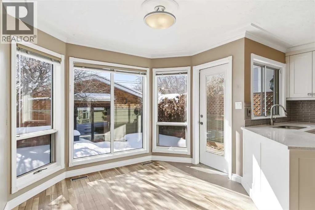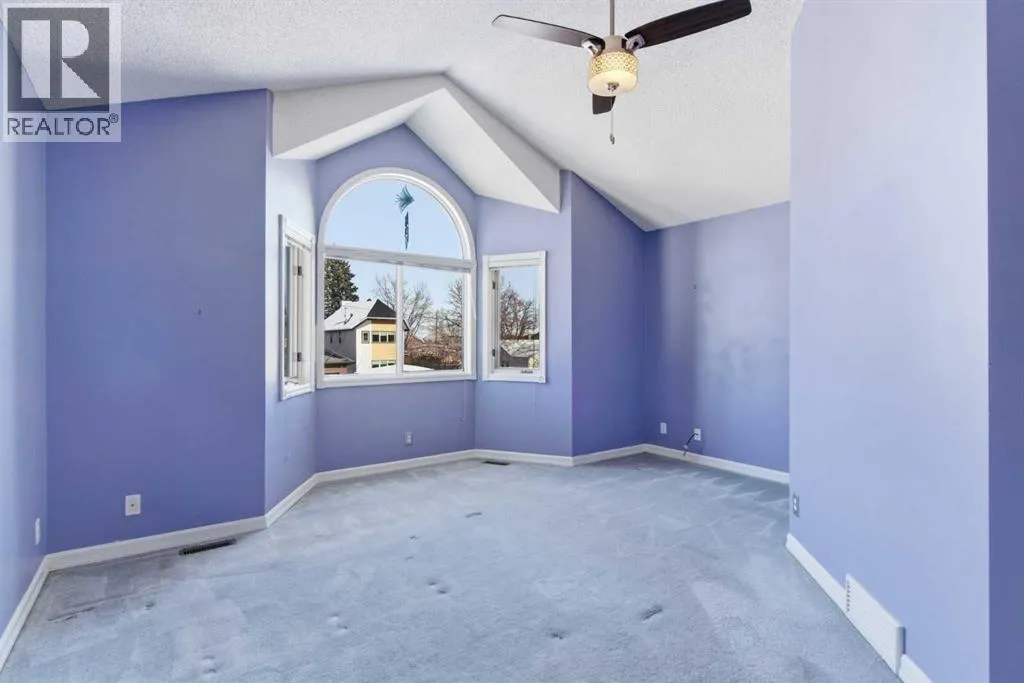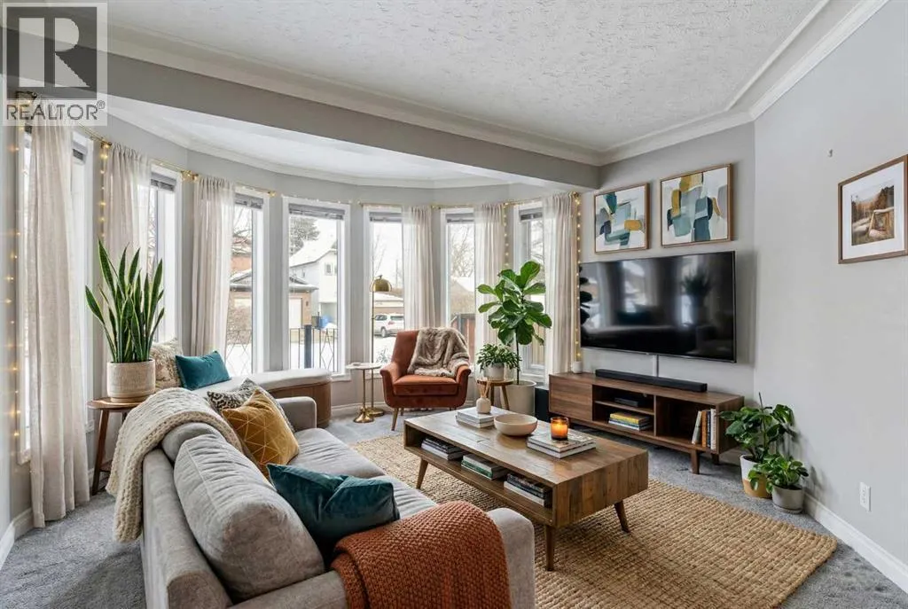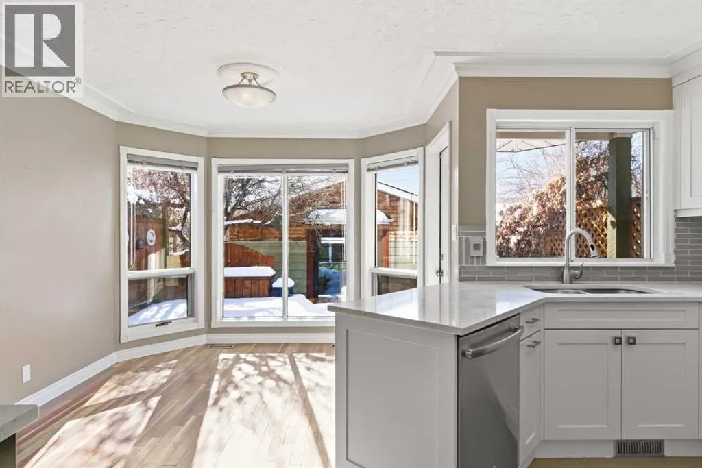 Welcome to this charming two-storey residence set on a beautiful 25' x 120' level lot in one of Calgaryâs most desirable inner-city communities. Positioned on a quiet street surrounded by other distinguished homes, this property offers exceptional curb appeal and an elevated exterior presence that immediately captures the eye. The stone-accented entrance, durable Hardie board siding, and charming front porch with covered entry framed by the upper-level overhang create a timeless and refined first impression.Inside, the home offers a thoughtfully designed layout filled with natural light. Expansive windows throughout both the main and upper levels allow sunshine to pour into every space, enhancing the warmth and character of the interior. The sunken living room, highlighted by bay windows overlooking the peaceful street, adds architectural depth and charm. At the rear of the home, south-facing windows illuminate the kitchen and dining areas with beautiful natural light throughout the day. The upgraded kitchen showcases stone countertops, quality cabinetry, and elegant crown molding finishes, blending comfort and sophistication.Hardwood and tile flooring enhance the main living areas, while the upper level includes carpet, offering future owners the opportunity to personalize finishes to their taste.Upstairs features two generously sized bedrooms, including a spacious primary retreat complete with a large pass-through closet leading to a private 4-piece ensuite. The ensuite is designed as a true retreat, featuring a standalone soaker tub alongside a glass-encased tiled shower. A second full 4-piece bathroom complements the upper level, along with a third room ideal for a home office, nursery, or flexible living space. A classic laundry chute adds both character and convenience, directing linens to the main-floor laundry room below.The outdoor setting is equally impressive. The large south-facing backyard offers privacy and sunlight, while the expansive rear de ck â complete with a raised flower bed along its edge â creates the perfect setting for entertaining, relaxing, or gardening. A covered overhang provides sheltered access at the rear entrance. The double detached garage with glass double-door entry backs onto a lane, enhancing functionality and ease of access.The lifestyle here is exceptional. The Winston Golf Club is just steps away, with Fox Hollow Golf Course only a short drive. Ridge pathways, biking and running trails, and an off-leash dog park are nearby. Enjoy quick access to downtown, Deerfoot Trail, and all the amenities along 16th Avenue, making this location both prestigious and practical.Set on a premium lot in a coveted community, this home offers striking curb appeal, abundant natural light, and timeless character â a rare opportunity to own a beautifully positioned property in an outstanding inner-city setting. (id:27476)