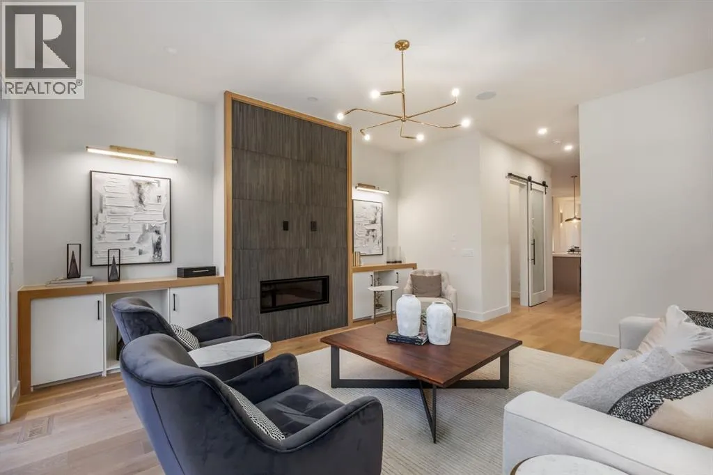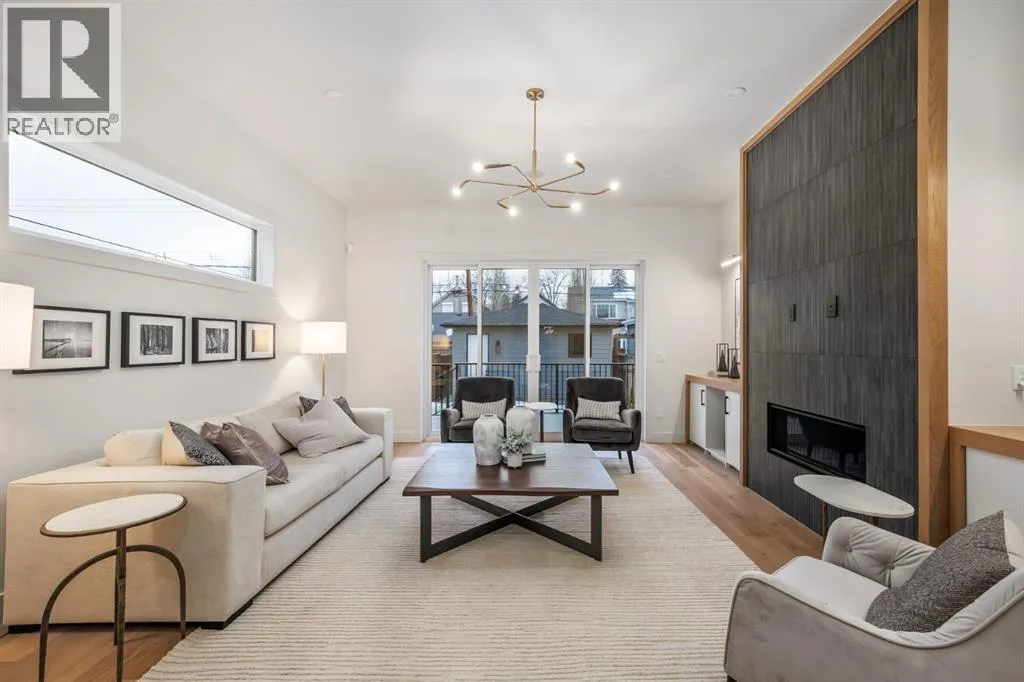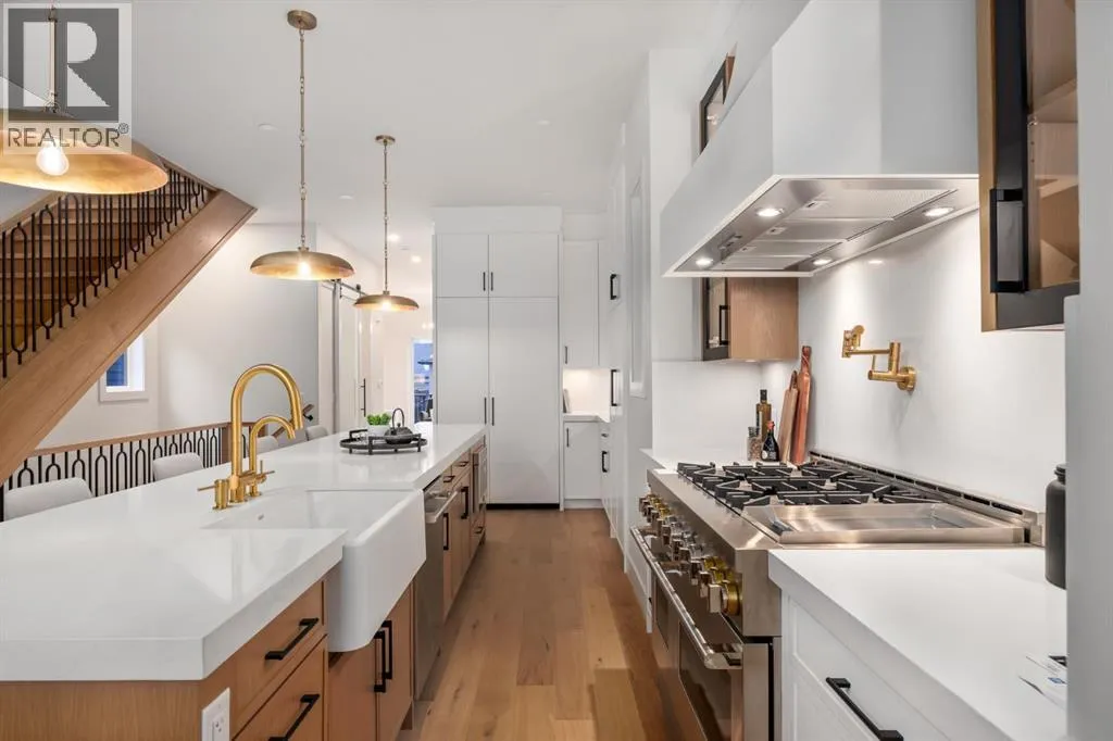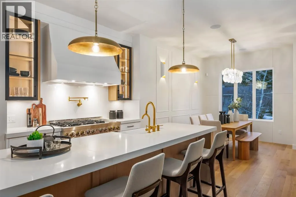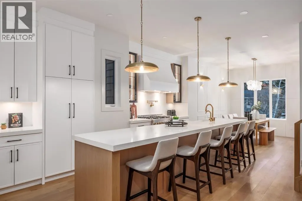 OPEN HOUSE Saturday April 4th 1-3PM & Sunday April 5th 3-6PM! Experience elevated inner-city living with this impeccably designed, brand-new home nestled in one of Calgaryâs most sought-after neighbourhoods: Hillhurst. Constructed by a trusted local builder known for craftsmanship, functionality, and aesthetic excellence, this 2-storey residence offers 2,224 SF above grade, with a fully developed basement, 4 bedrooms, and 4.5 bathroomsâa perfect blend of modern luxury and thoughtful detail. From the striking brick facade to the high-end engineered wide plank oak hardwood, every inch of this home exudes quality. The main floor welcomes you with a built-in entry feature and a front formal dining area, accented by elegant wall mouldings, white and gold sconces, and a designer chandelier. At the other end, an open-concept living room is a showstopper, featuring a large-format textured tile fireplace, custom built-ins with display lighting, and massive patio sliders leading to a west-facing, 135-ft deep backyard with a raised patio and gas lineâideal for indoor-outdoor entertaining. The chefâs kitchen is nothing short of stunning, complete with a 2.5" thick quartz island, panel-ready fridge/freezer with knurled handles, sleek quartz countertops, a gas range with pot filler, and backlit display cabinets framing the custom hood fan. Youâll also find a farmhouse sink, full slab backsplash, hidden coffee/appliance nook, built-in pantry, and a drawer-style microwaveâeach designed to inspire culinary creativity. Tucked behind a barn-style sliding door, the den offers a quiet workspace with a built-in desk, shelving, and bright window. The mudroom, also with a barn door, features tiled flooring, a built-in bench, and a large closet for seamless organization. Upstairs, each of the three spacious bedrooms come with walk-in closets and custom built-ins, along with private ensuites. The primary is sure to impress with vaulted ceilings, a LED-lit feature wall, statement gold light f ixture, and a spa-inspired ensuite that boasts a steam shower, dual vanities, and a standalone soaker tub with dramatic black and white tile wall backdrop. A nearby laundry room offers convenience with a sink, folding station, shelving, and tile backsplash. The fully finished, carpeted basement, with 9-ft ceilings, is roughed in for in-floor heating and designed for comfort and versatilityâfeaturing a spacious rec area, a TV wall with built-in components, a wet bar with lit display shelves and tile flooring, a full bath, and a large fourth bedroom with built-ins including a desk. An efficient mechanical room completes the lower level, with additional upgrades including solid core doors and built-in speakers throughout the entire home. Perfectly situated just steps from shops along 14 St NW and walking distance to Kensington Village, Calgaryâs extensive river pathways, and the Downtown Coreâthis is urban luxury at its finest. Act now and make this exceptional Hillhurst property your forever home. (id:27476)