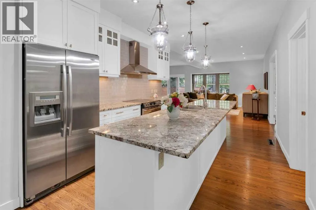 Nestled on a picturesque tree-lined street just steps from the Glencoe Club, this charming 2-storey home offers 2,661 sq ft of spacious living. Featuring 3+1 bedrooms and 3.5 bathrooms, the open-concept main floor welcomes you with a wall of windows leading to a west-facing patio perfect for entertaining. The main level includes a generous living and dining area, a cozy family room, and an open kitchen with a center island. The master suite features a sitting area large walk in closet and a 5-piece ensuite with dual sinks. The fully finished basement includes a triple-safe waterproofing system for added peace of mind. Outside, enjoy a double detached garage and easy access to a paved lane. Located just half a block from scenic river pathways, parks, and minutes from downtown, this home is close to top schools like Western Canada, William Reid, and Earl Grey. (id:27476)