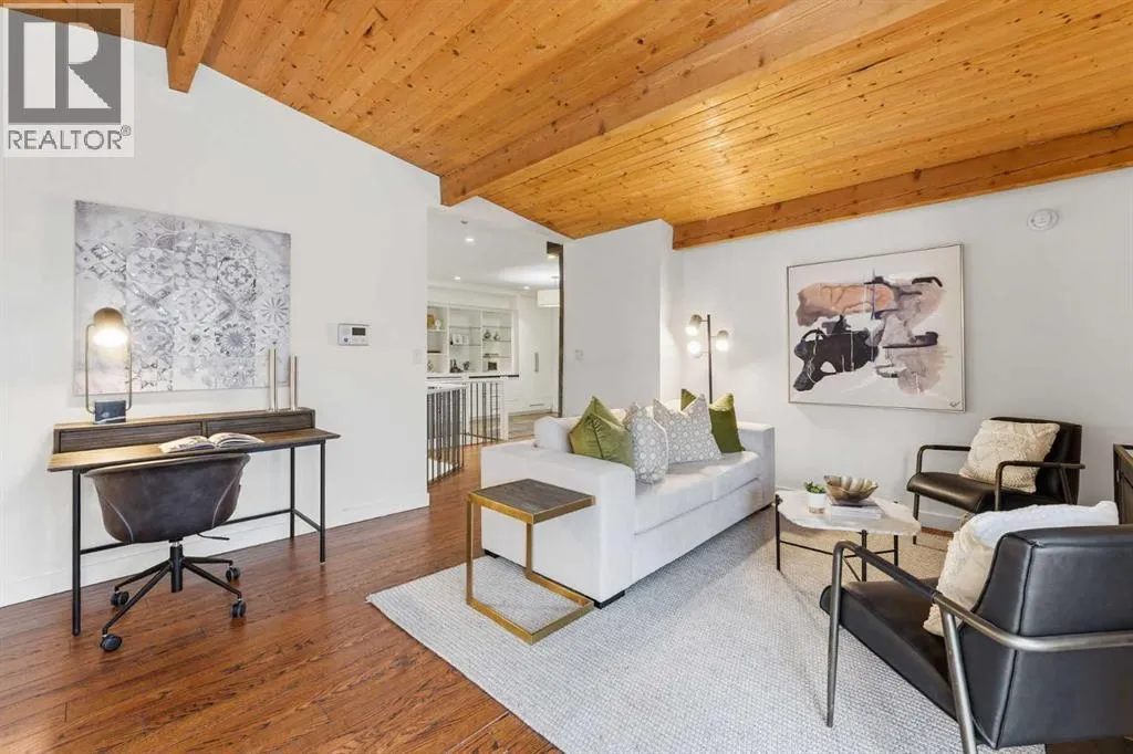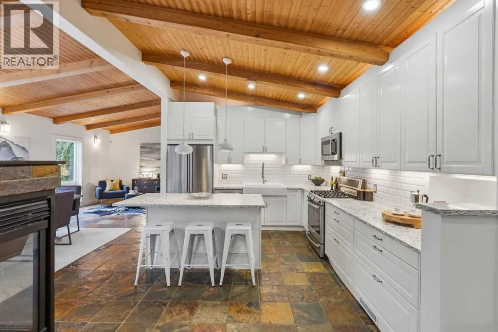 O/H March 7 & 8 noon to 2 . Quietly positioned along a tree-lined street in the established community of Glendale, this beautifully renovated 1,840 sq ft bungalow blends timeless mid-century character with the comfort & function of thoughtful modern upgrades. Set on an oversized 70â wide lot, the property delivers exceptional outdoor space, architectural charm & a layout designed for everyday living & effortless entertaining. A spacious foyer introduces the home with custom built-ins for organized storage & display. Overhead, dramatic vaulted wood-panelled ceilings with exposed beams highlight the homeâs original architectural beauty while establishing a warm & welcoming atmosphere throughout the main living areas. Relax beside the charming wood-burning fireplace in the living room or open the sliding patio doors to extend gatherings outdoors, supporting a seamless indoor & outdoor lifestyle across every season. Designed for both style & function, the beautifully updated kitchen showcases quartz countertops, timeless subway tile, stainless steel appliances including a gas range & a large central island that naturally brings family & guests together. A gas fireplace shared with the dining space adds warmth & ambiance while oversized windows fill the dining area with natural light, creating an inviting setting for daily meals & special occasions alike. Conversation easily continues in the adjacent family room where a comfortable layout encourages connection after dinner or quiet evenings at home. Rest & recharge in the spacious primary retreat featuring oversized west-facing windows & a custom walk-in closet designed for practical organization. A spa-inspired 5-piece bathroom elevates everyday routines with dual sinks & a deep soaker tub designed for relaxation. Two additional bedrooms & a stylish 3-piece bathroom complete the main level. Downstairs, the fully finished basement provides flexible living space for changing family needs with a large recreation room s uited for movie nights or games, a versatile nook ideal for hobbies, study or play, plus a fourth bedroom & a 3-piece bathroom that comfortably accommodates guests. An insulated, drywalled & heated double attached tandem garage offers exceptional year-round convenience while providing additional workspace & storage options. Outdoor living shines in the expansive west-facing backyard where a pergola-covered deck with gas line supports effortless summer barbecues & relaxed evening gatherings. Generous yard space created by the oversized lot allows plenty of room for kids & pets to play while mature trees contribute privacy & a peaceful setting. Phenomenally located within walking distance to several schools & the community centre with an outdoor skating rink, tennis courts & playgrounds. Additional recreation is nearby at Glenmeadows/Turtle Hill Park. Plus enjoy quick access to downtown, the LRT & major routes. (id:27476)