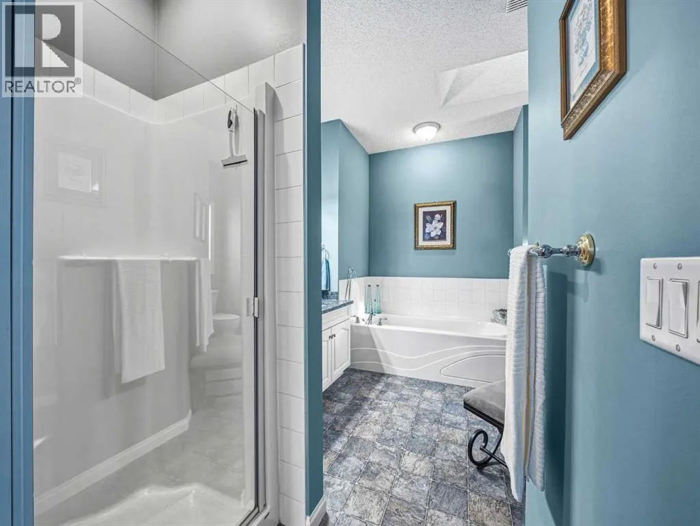 ***Open House: Saturday, March 14th 1pm-3pm and Sunday, March 15th 1pm-3pm*** This well-maintained bungalow villa in Signal Hill offers a bright, open-concept layout with vaulted ceilings, hardwood flooring, and plenty of natural light. The upgraded kitchen features granite countertops, stainless steel appliances, and a skylight, and connects to the breakfast nook and living room with a gas fireplace. From the breakfast nook, step out to a large deck with an awning and enjoy elevated southwest-facing views. The deck is designed to waterproof the covered patio below, extending outdoor living space.The primary bedroom includes a walk-in closet and a four-piece ensuite with stone countertops, a soaker tub, separate shower, and an additional skylight.At the front of the home, a formal dining room is ideal for entertaining, while a second bedroom (currently used as an office) adds flexibility. A two-piece powder room with an upgraded vanity completes the main level.The mudroom leading to the garage offers stacked laundry, counter space, and cabinetry for extra storage. The double garage is insulated and drywalled.The fully developed walkout basement features radiant in-floor heating supplied by a boiler system, upgraded carpet, a second fireplace, and a large living and recreation area. There is also a bedroom, a four-piece bathroom with stone countertops, and a gym with professional flooring that could be converted to a fourth bedroom. The walkout opens to a covered patio below the upper deck, providing shade in summer. The backyard includes one of the few private gardens in the complex, where owners can plant freely. Additional features include newer central air conditioning, a newer hot water tank, water softener, central vacuum, and ample storage. Excellent location with quick access to Westhills Town Centre Shopping & Restaurants, Aspen Landing Shopping Centre, the LRT, and major routes. (id:27476)