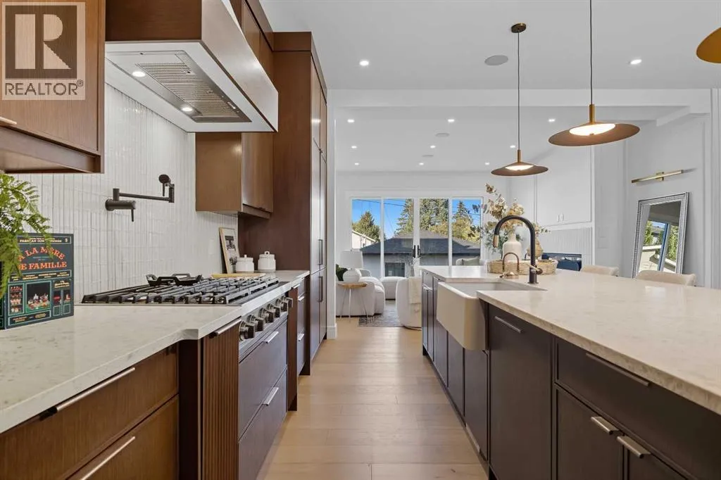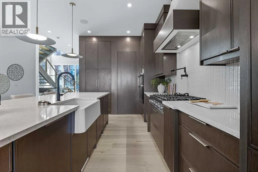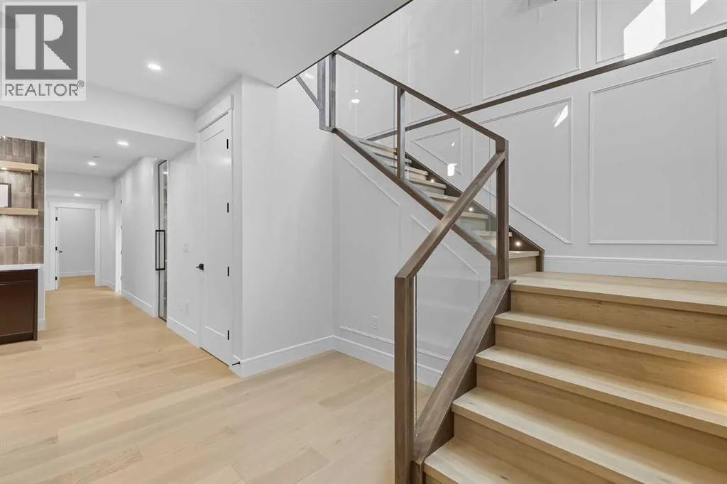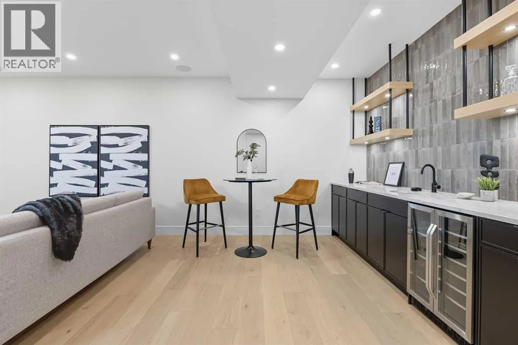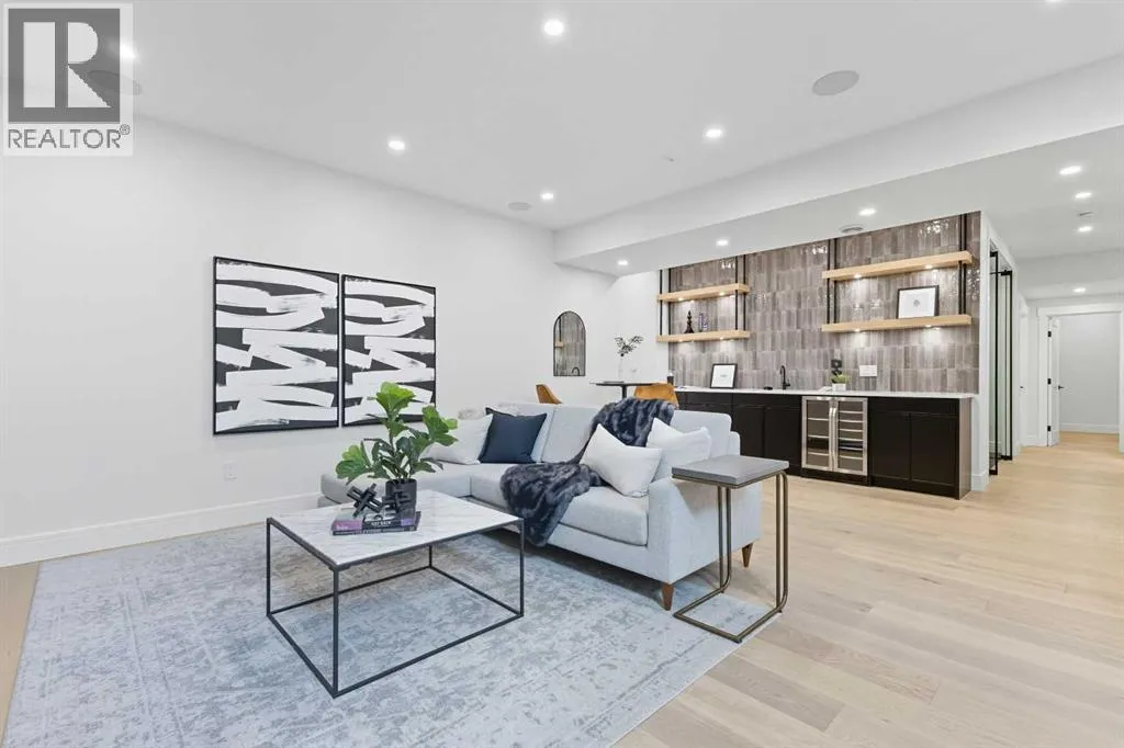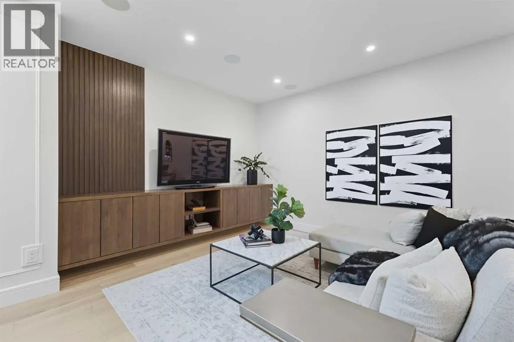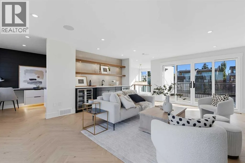 OPEN HOUSE SATURDAY, APRIL 4TH FROM 1-4 PM & SUNDAY, APRIL 5TH FROM 1-3 PM. Perched on coveted 29th Avenue with UNPARALLELED CITY, DOWNTOWN & MOUNTAIN VIEWS amongst multi-million dollar homes, this exquisite, brand new 3+1 bedroom home is situated on a 33âx125â lot & exudes the epitome of luxury, offering over 4500 sq ft of developed living space. The open, airy main level presents engineered hardwood floors, lofty ceilings & chic light fixtures, showcasing a grand foyer with floor to ceiling Rift cut oak cabinets & textured feature wall that leads to a kitchen thatâs impeccably finished with chamomile butter quartz counter tops, large island/eating bar, fluted cabinets with spice drawers, corrugated tile backsplash, convenient pot filler & stainless steel appliance package. A walk-in butler pantry with extra utility sink & extra storage thatâs perfect for storing small appliances is an added convenience. The spacious dining area with built-in hutch & 2 paneled beverage fridges, provides ample space to host family & friends. The living room is anchored by a feature fireplace & wainscoted feature wall. Completing the main level, is a handy mudroom with hexagon tile floors, built-in cabinets & hooks plus a 2 piece powder room. An elegant open riser staircase with glass inserts leads to the second level that hosts 3 bedrooms, a 5 piece main bath & laundry room with sink, lots of storage & hanging racks. The primary retreat is a true private oasis, featuring a sitting area with cozy double sided fireplace, to-die-for walk-in closet with laundry room access & zen-like 6 piece ensuite with heated floors, large vanity with dual sinks, relaxing freestanding soaker tub & rejuvenating steam shower. A third level loft with magnificent feature wall, wet bar & access to north & south decks with UNMATCHED MOUNTAIN VIEWS plus CITY & DOWNTOWN VISTAS is the ideal space for entertaining. A den/study area & 2 piece powder room are the finishing touches to the third level. Basement dev elopment includes a large family/media room with wet bar & charming wine room â perfect for game or movie night. A dedicated home gym with glass doors, epoxy flooring, mirrored wall & electrical for a TV delivers the perfect setting early morning workouts. The fourth bedroom with walk-in closet & large spa-like 3 piece bath with steam shower complete the basement. Other notable features include built-in speakers on each level, wainscoting detail throughout plus roughed in A/C. Outside, enjoy aggregate walk-ways & private back yard with patio & access to the double detached garage with rough in for heat.. This outstanding inner city home is located close to trendy Marda Loop, excellent schools, shopping, public transit & has easy access to 33rd & 26th Avenues & Crowchild Trail. (id:27476)
