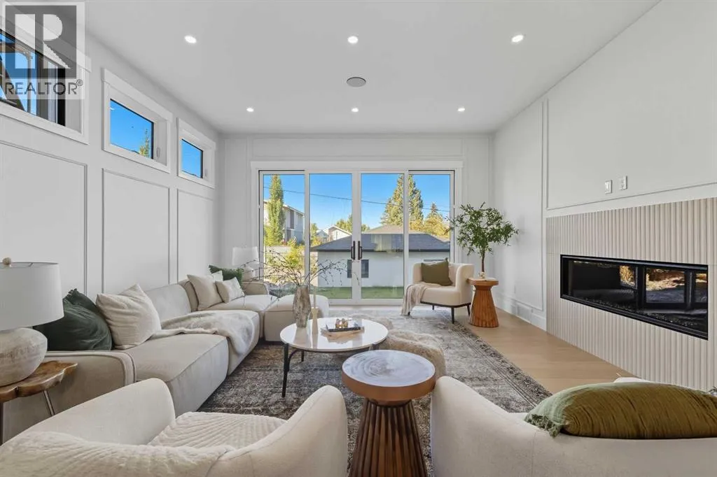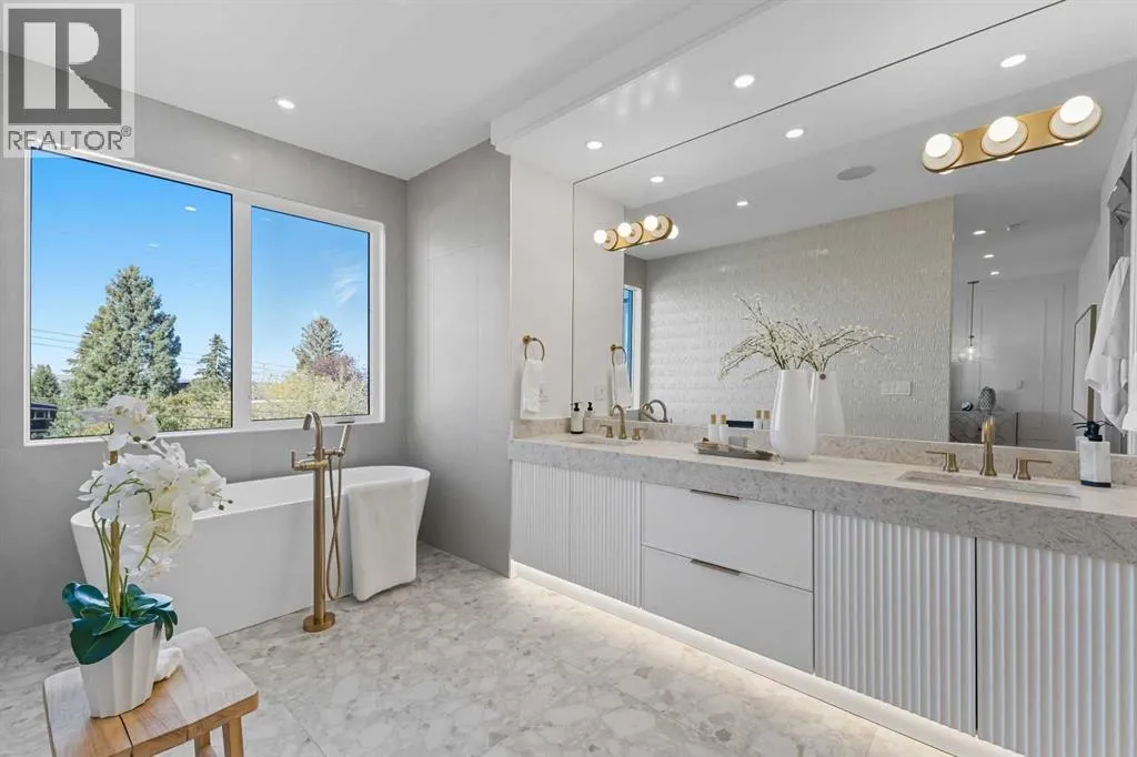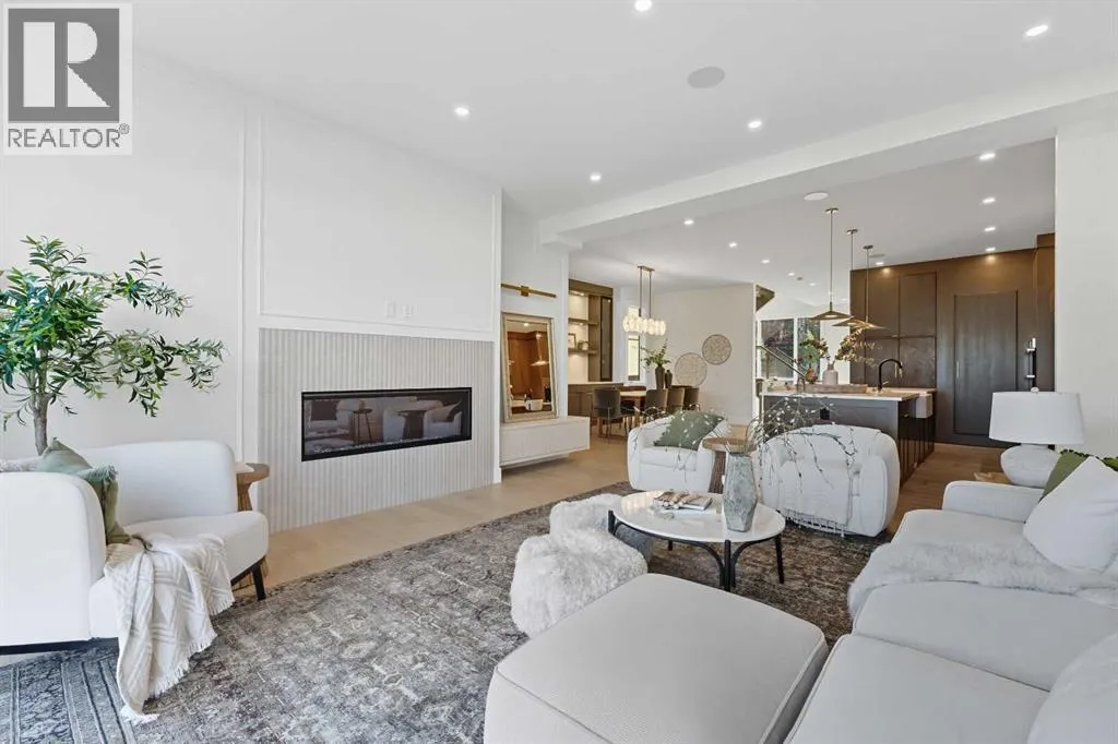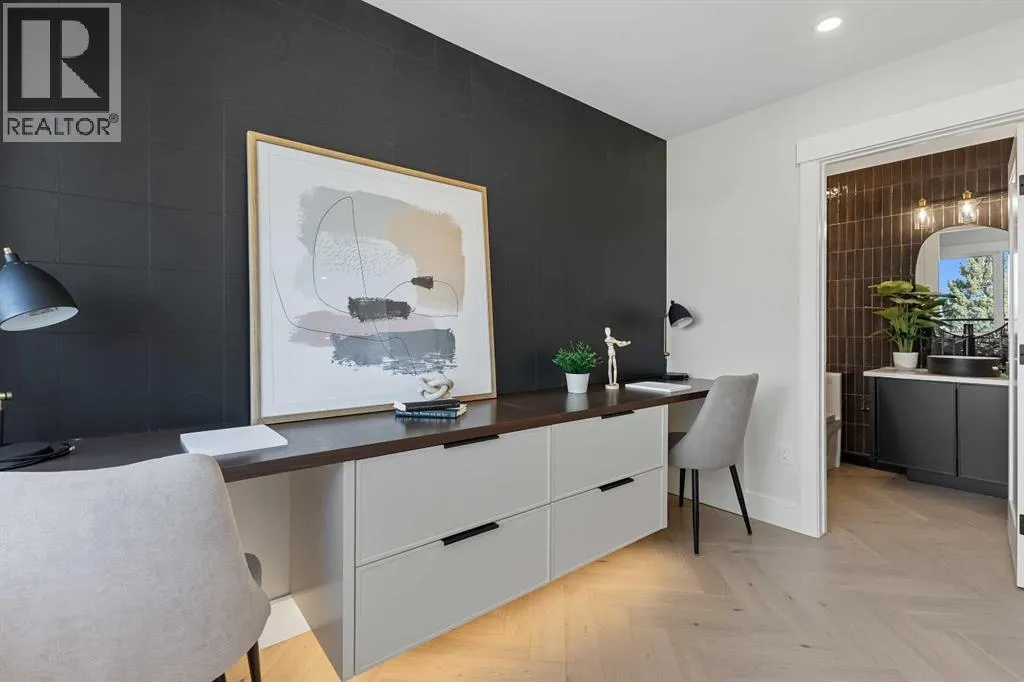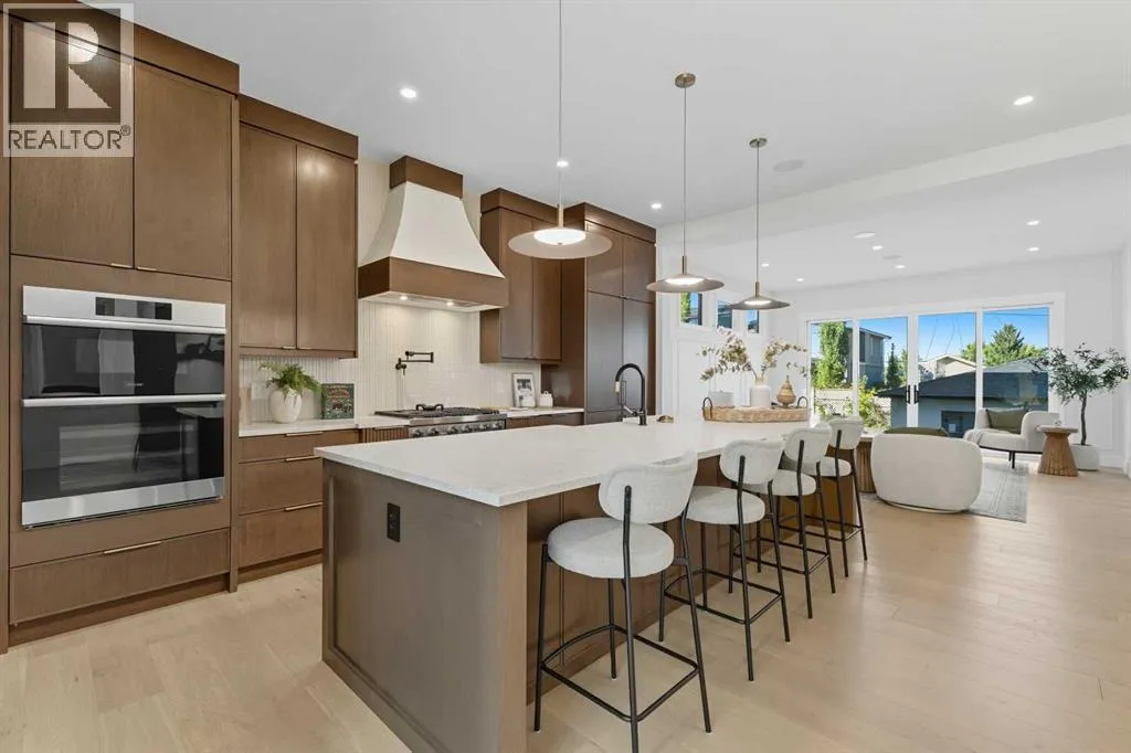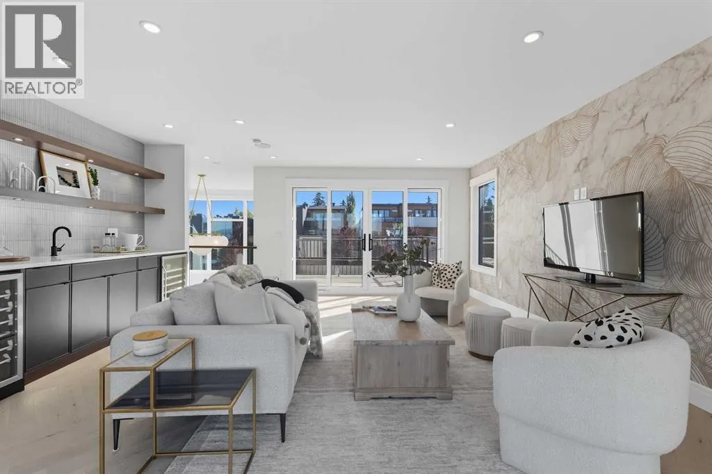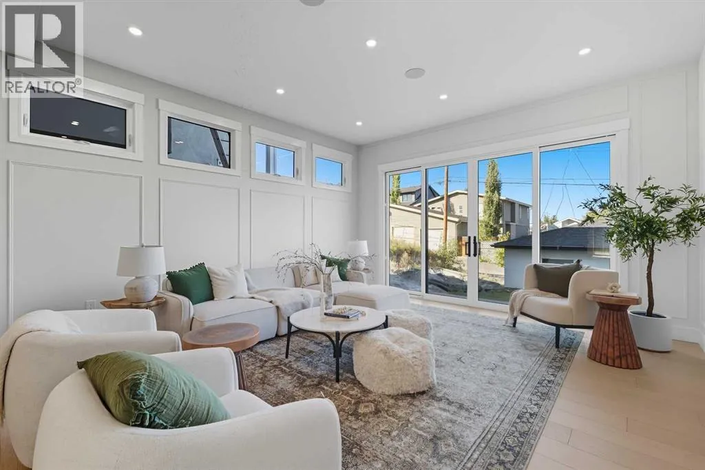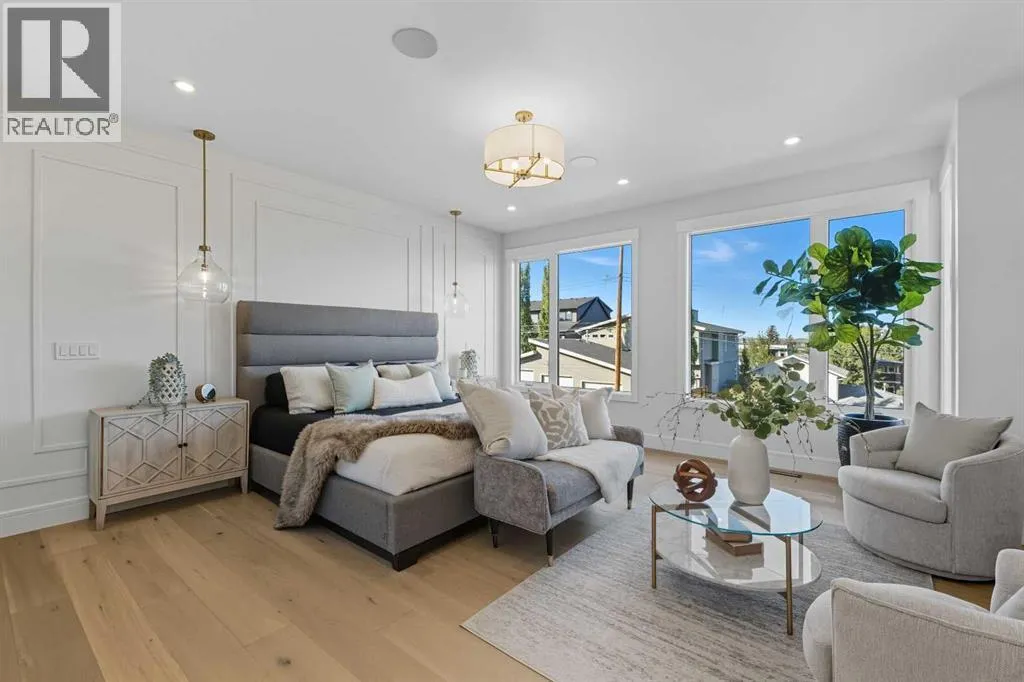 OPEN HOUSE SATURDAY, APRIL 4TH FROM 1-4 PM & SUNDAY, APRIL 5TH FROM 1-3 PM. Perched on coveted 29th Avenue with UNPARALLELED CITY, DOWNTOWN & MOUNTAIN VIEWS amongst multi-million dollar homes, this exquisite, brand new 3+1 bedroom home is situated on a 33âx125â lot & exudes the epitome of luxury, offering over 4500 sq ft of developed living space. The open, airy main level presents engineered hardwood floors, lofty ceilings & chic light fixtures, showcasing a grand foyer with floor to ceiling Rift cut oak cabinets & textured feature wall that leads to a kitchen thatâs impeccably finished with chamomile butter quartz counter tops, large island/eating bar, fluted cabinets with spice drawers, corrugated tile backsplash, convenient pot filler & stainless steel appliance package. A walk-in butler pantry with extra utility sink & extra storage thatâs perfect for storing small appliances is an added convenience. The spacious dining area with built-in hutch & 2 paneled beverage fridges, provides ample space to host family & friends. The living room is anchored by a feature fireplace & wainscoted feature wall. Completing the main level, is a handy mudroom with hexagon tile floors, built-in cabinets & hooks plus a 2 piece powder room. An elegant open riser staircase with glass inserts leads to the second level that hosts 3 bedrooms, a 5 piece main bath & laundry room with sink, lots of storage & hanging racks. The primary retreat is a true private oasis, featuring a sitting area with cozy double sided fireplace, to-die-for walk-in closet with laundry room access & zen-like 6 piece ensuite with heated floors, large vanity with dual sinks, relaxing freestanding soaker tub & rejuvenating steam shower. A third level loft with magnificent feature wall, wet bar & access to north & south decks with UNMATCHED MOUNTAIN VIEWS plus CITY & DOWNTOWN VISTAS is the ideal space for entertaining. A den/study area & 2 piece powder room are the finishing touches to the third level. Basement dev elopment includes a large family/media room with wet bar & charming wine room â perfect for game or movie night. A dedicated home gym with glass doors, epoxy flooring, mirrored wall & electrical for a TV delivers the perfect setting early morning workouts. The fourth bedroom with walk-in closet & large spa-like 3 piece bath with steam shower complete the basement. Other notable features include built-in speakers on each level, wainscoting detail throughout plus roughed in A/C. Outside, enjoy aggregate walk-ways & private back yard with patio & access to the double detached garage with rough in for heat.. This outstanding inner city home is located close to trendy Marda Loop, excellent schools, shopping, public transit & has easy access to 33rd & 26th Avenues & Crowchild Trail. (id:27476)