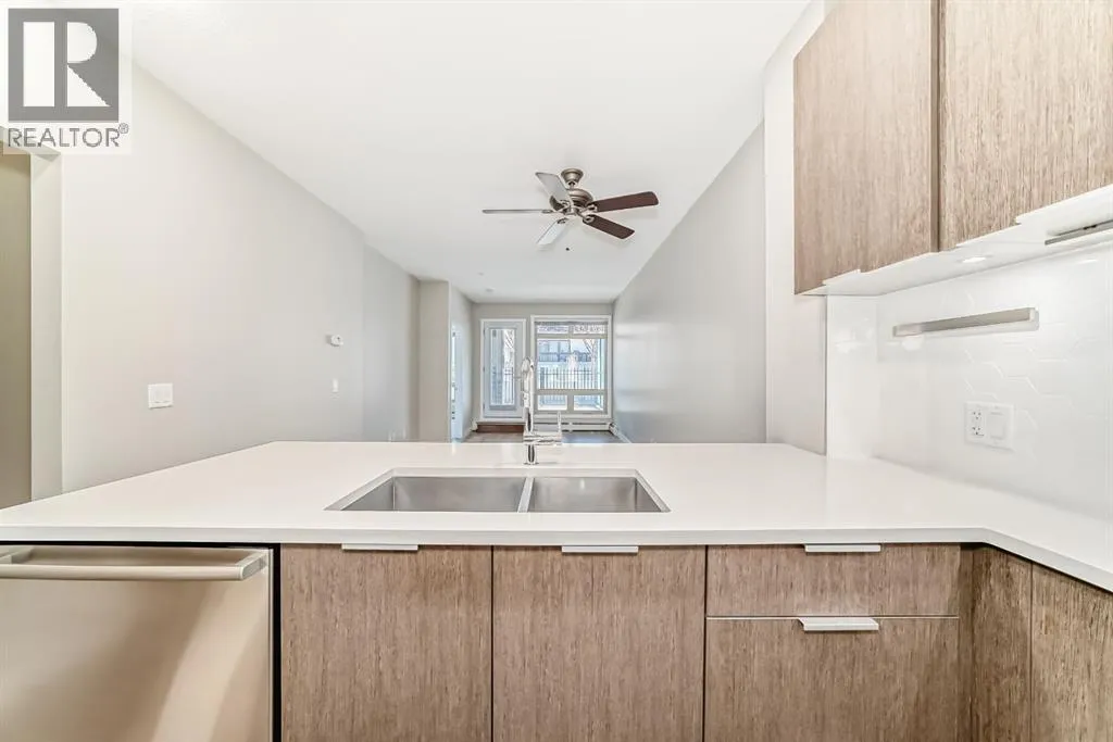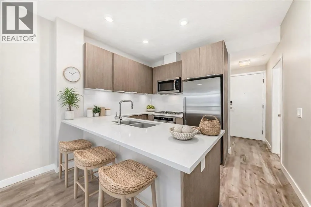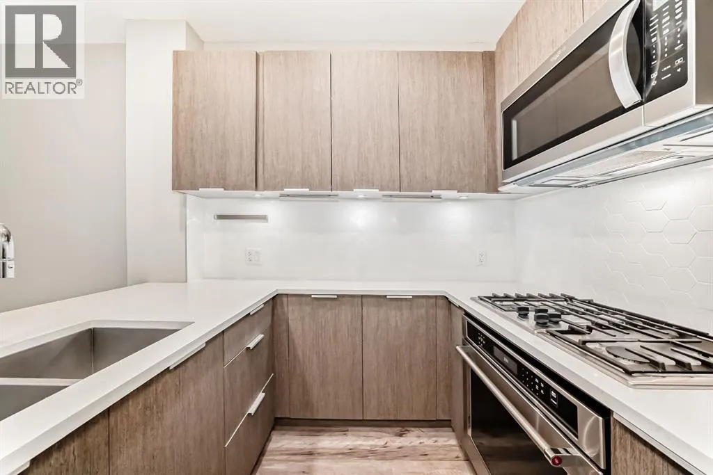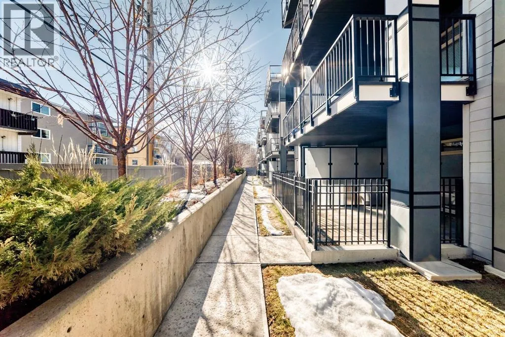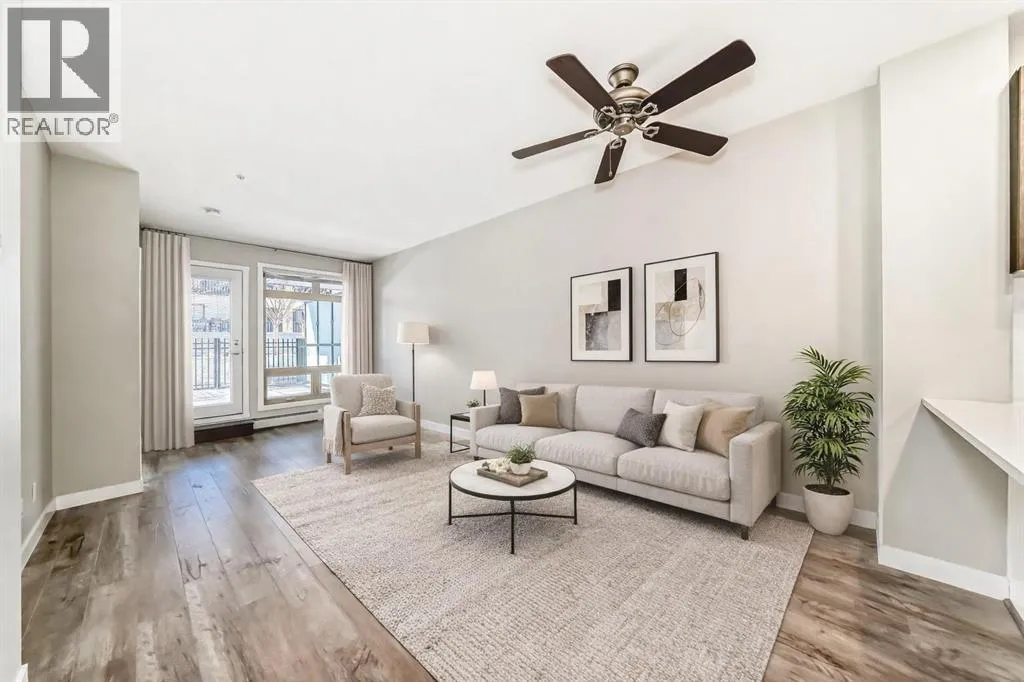 Welcome to the Ven in Kensignton a modern and well built residence in the heart of Sunnyside, featuring this stunning and impeccably maintained 1 bedroom plus den/bedroom condo in one of Calgaryâs most vibrant, walkable, and desirable inner city neighbourhoods. Built in 2015 and proudly owned by the original owner, this spacious main floor unit blends modern style with everyday functionality, offering soaring 9â ceilings, brand new laminate flooring, fresh paint, a bright open layout, and two full bathrooms. The sleek contemporary kitchen is a true showstopper, complete with a gas range, stainless steel appliances, quartz countertops, breakfast bar and rich cabinetry, perfect for entertaining or daily living. The generously sized primary bedroom features a tray ceiling, ceiling fan, a walk-through closet and a beautifully finished ensuite with marble counters and a large tiled shower. The second bathroom includes a tub/shower combination with matching marble counters. The versatile den works perfectly as a home office, guest room, or creative space. The inviting living room opens onto a spacious, extra private SE facing patio with a gas BBQ hook-up and direct access to a quiet residents only walkway, ideal for pet owners and outdoor enthusiasts. Additional highlights include in suite laundry, one titled underground parking stall, a separate storage locker, bike storage, a residents only underground wash bay, and a dedicated workbench room for tuning skis or snowboards. Located directly across from an off-leash dog park and playground, and just steps from the Sunnyside CTrain Station, a short walk downtown and the boutique shops, cafés, and restaurants of the lively Kensington district and the SAIT campus adjacent to the Jubilee Auditorium. This home offers the best of urban living in a serene, tucked away setting beside a peaceful hillside. Youâll love where you live! **some photos are virtually staged** (id:27476)