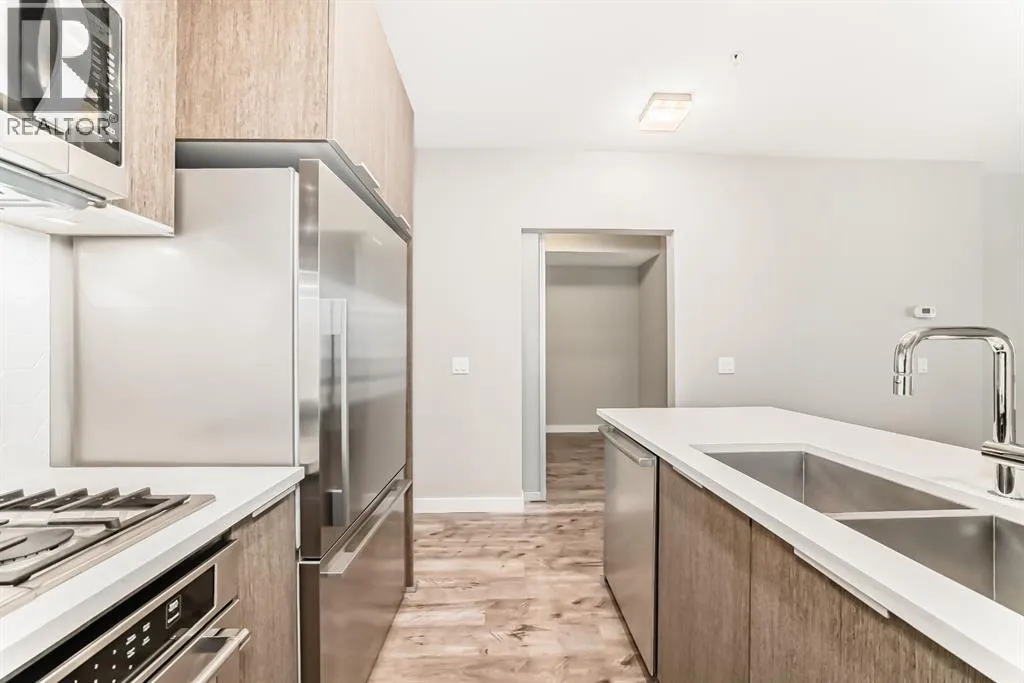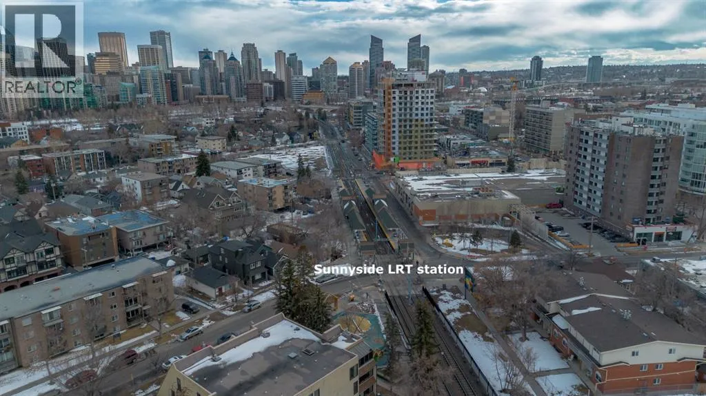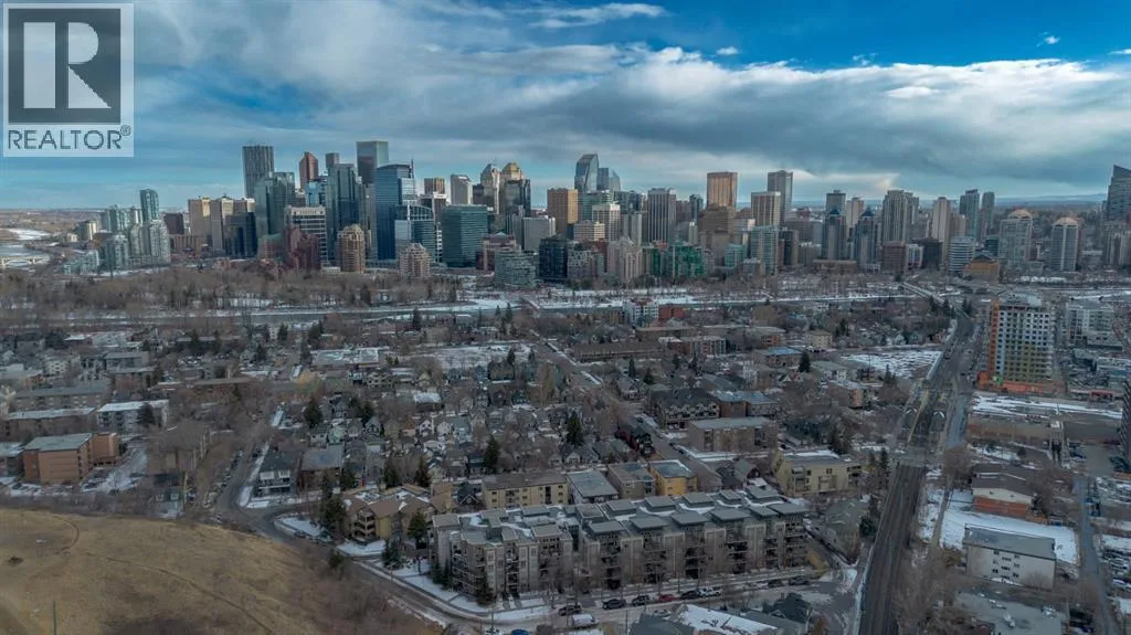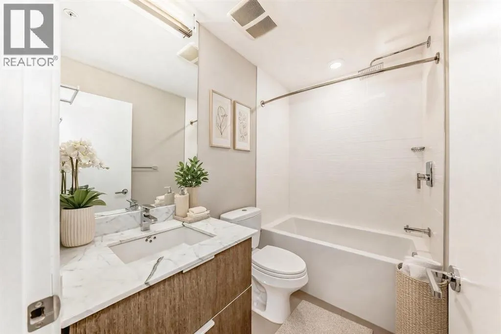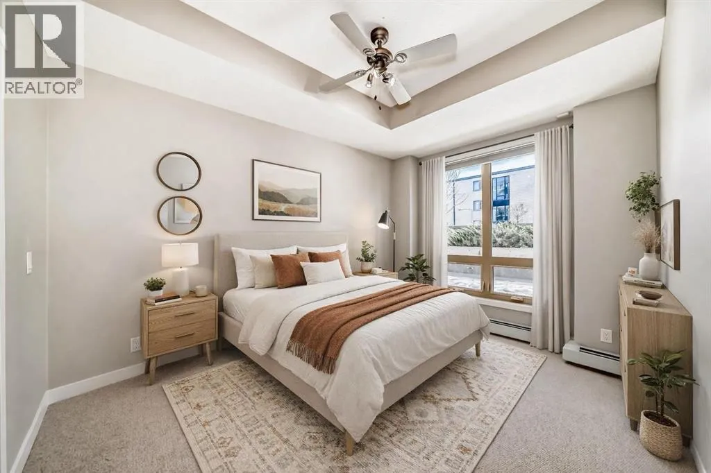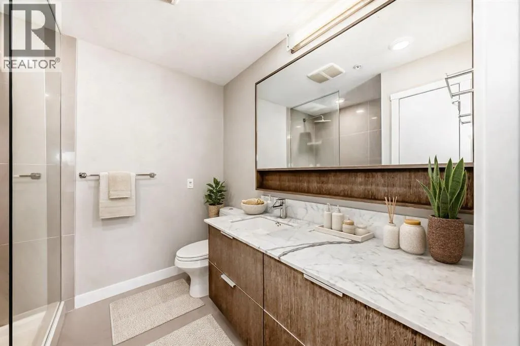 Welcome to the Ven in Kensignton a modern and well built residence in the heart of Sunnyside, featuring this stunning and impeccably maintained 1 bedroom plus den/bedroom condo in one of Calgaryâs most vibrant, walkable, and desirable inner city neighbourhoods. Built in 2015 and proudly owned by the original owner, this spacious main floor unit blends modern style with everyday functionality, offering soaring 9â ceilings, brand new laminate flooring, fresh paint, a bright open layout, and two full bathrooms. The sleek contemporary kitchen is a true showstopper, complete with a gas range, stainless steel appliances, quartz countertops, breakfast bar and rich cabinetry, perfect for entertaining or daily living. The generously sized primary bedroom features a tray ceiling, ceiling fan, a walk-through closet and a beautifully finished ensuite with marble counters and a large tiled shower. The second bathroom includes a tub/shower combination with matching marble counters. The versatile den works perfectly as a home office, guest room, or creative space. The inviting living room opens onto a spacious, extra private SE facing patio with a gas BBQ hook-up and direct access to a quiet residents only walkway, ideal for pet owners and outdoor enthusiasts. Additional highlights include in suite laundry, one titled underground parking stall, a separate storage locker, bike storage, a residents only underground wash bay, and a dedicated workbench room for tuning skis or snowboards. Located directly across from an off-leash dog park and playground, and just steps from the Sunnyside CTrain Station, a short walk downtown and the boutique shops, cafés, and restaurants of the lively Kensington district and the SAIT campus adjacent to the Jubilee Auditorium. This home offers the best of urban living in a serene, tucked away setting beside a peaceful hillside. Youâll love where you live! **some photos are virtually staged** (id:27476)