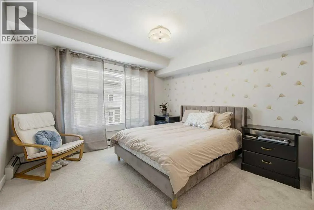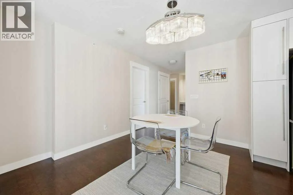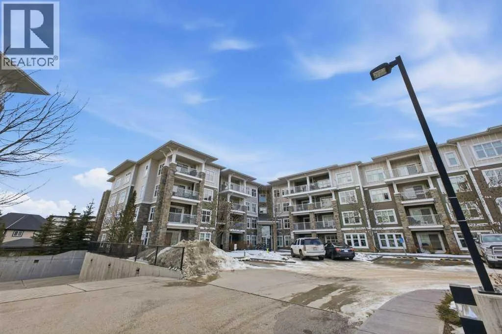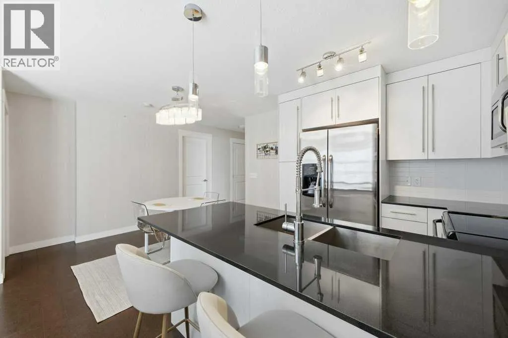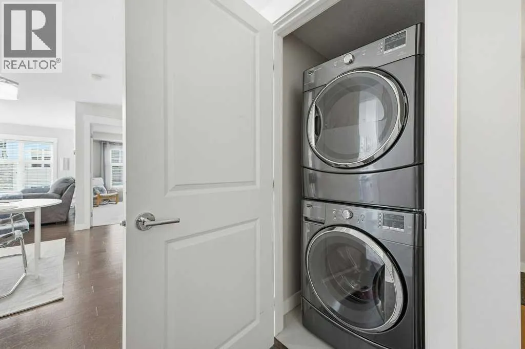 This is a top-floor corner unit and that matters. No one above you, no noise from the hallway on two sides, and windows wrapping the south, southeast, and southwest. Natural light from morning through evening. It's one of the quieter positions in the building, and one of the larger floor plans available. The living room is generous for a condo this size. There's room for a proper sofa, a coffee table, and still space to move around. The cork flooring runs through the main living areas. It's softer underfoot than hardwood and keeps the space feeling warm. This isn't a unit where you feel like you're living in a box. The corner layout gives you that extra breathing room that most condos in this price range just don't have. The kitchen sits open to the living and dining area with no walls cutting it off and no awkward transition. Upgraded appliances, a microwave hood fan above the stove, good counter space, and enough cabinetry to actually store things. The layout is practical and the flow makes sense whether you're cooking for one or having people over. There's also a built-in desk just off the kitchen area, It keeps a workspace tucked in without eating up a whole room. The dining area sits between the kitchen and the living room, big enough for a full table and chairs, with natural light coming in from multiple directions. Morning coffee here with the south sun coming through is a pretty good way to start a day. The primary bedroom comfortably fits a king bed with nightstands on both sides and still leaves you room to move. Dual closets mean storage isn't an issue. The 4-piece ensuite is off the primary and well-sized. It's your own bathroom, private to the bedroom, which matters when you have guests or a roommate using the second bath. The second bedroom is also a solid size, fits a queen easily, and works just as well as a home office or flex space if you don't need the second bedroom full time. It has direct access to the second full 4-piece bathroom in the hall. In-suite laundry is included, washer and dryer in the unit. Step out onto the south-facing balcony. You've got south and west exposure, which means afternoon and evening sun. One titled, heated underground parking stall is included. Assigned storage locker also included, separate from the unit, on the parkade level. Condo fees cover heat, water. Electricity is the only utility you're paying separately. Outside the front door, you're in Mahogany, one of the few lake communities in Calgary where the lake access is actually good. Residents get two beaches, the Beach House, tennis courts, a skating rink in winter, and over 35 km of pathways that wind through the wetlands. It's a community where people actually use the amenities. Seton is a short drive with a grocery store, restaurants, coffee shops, a Cineplex, and South Health Campus all within a few minutes. Deerfoot and Stoney Trail are both easily accessible. (id:27476)