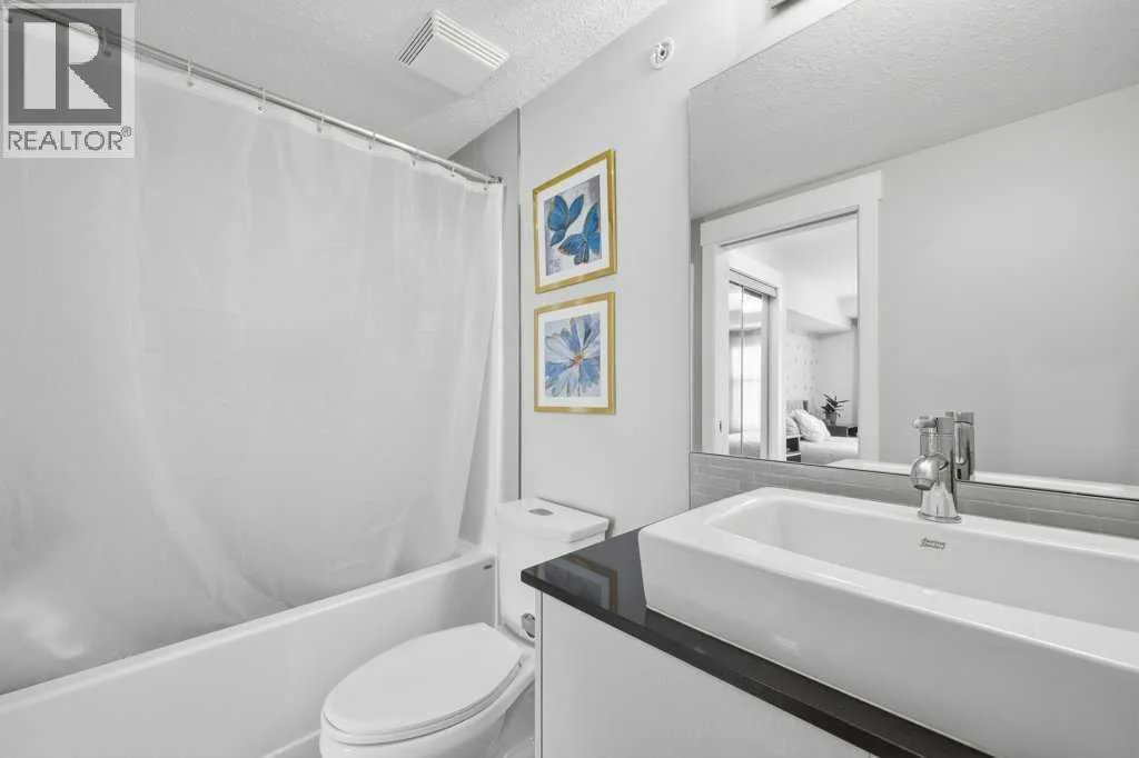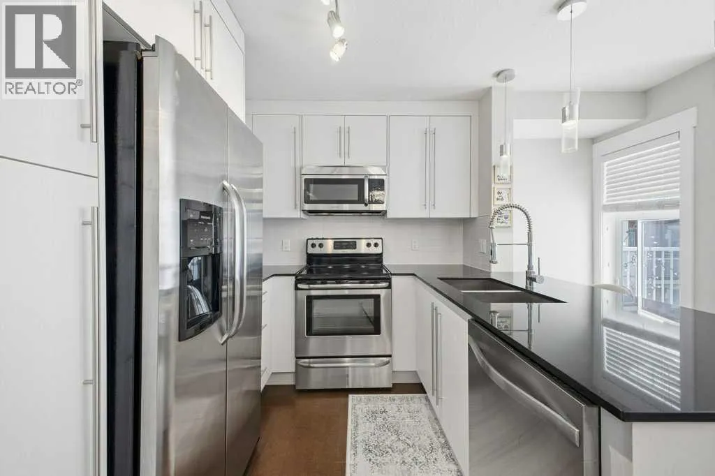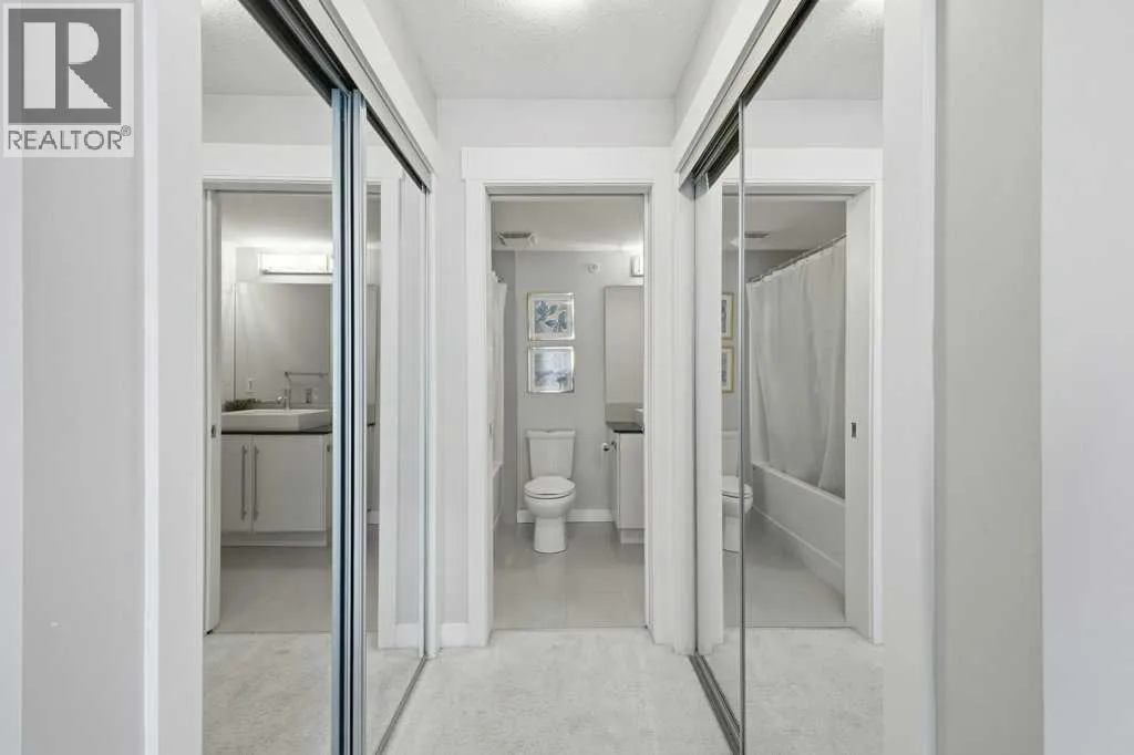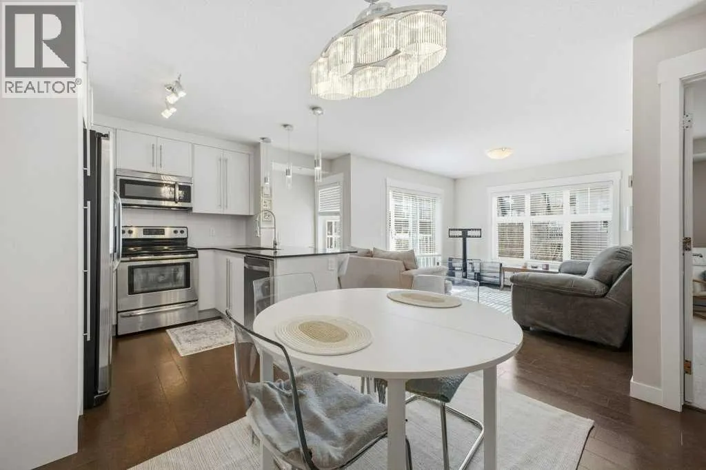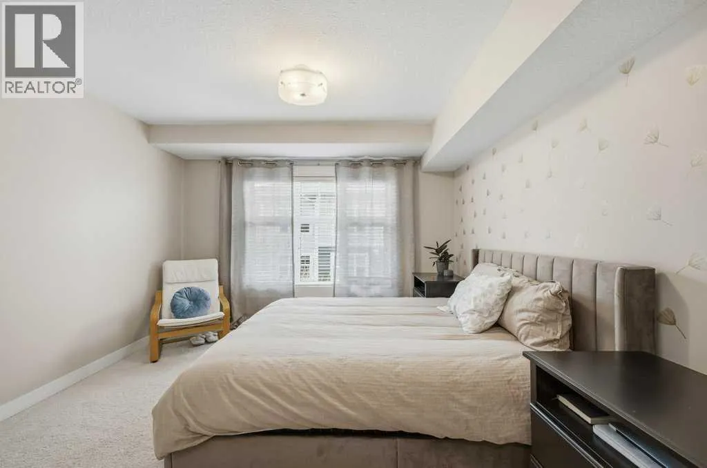 This is a top-floor corner unit and that matters. No one above you, no noise from the hallway on two sides, and windows wrapping the south, southeast, and southwest. Natural light from morning through evening. It's one of the quieter positions in the building, and one of the larger floor plans available. The living room is generous for a condo this size. There's room for a proper sofa, a coffee table, and still space to move around. The cork flooring runs through the main living areas. It's softer underfoot than hardwood and keeps the space feeling warm. This isn't a unit where you feel like you're living in a box. The corner layout gives you that extra breathing room that most condos in this price range just don't have. The kitchen sits open to the living and dining area with no walls cutting it off and no awkward transition. Upgraded appliances, a microwave hood fan above the stove, good counter space, and enough cabinetry to actually store things. The layout is practical and the flow makes sense whether you're cooking for one or having people over. There's also a built-in desk just off the kitchen area, It keeps a workspace tucked in without eating up a whole room. The dining area sits between the kitchen and the living room, big enough for a full table and chairs, with natural light coming in from multiple directions. Morning coffee here with the south sun coming through is a pretty good way to start a day. The primary bedroom comfortably fits a king bed with nightstands on both sides and still leaves you room to move. Dual closets mean storage isn't an issue. The 4-piece ensuite is off the primary and well-sized. It's your own bathroom, private to the bedroom, which matters when you have guests or a roommate using the second bath. The second bedroom is also a solid size, fits a queen easily, and works just as well as a home office or flex space if you don't need the second bedroom full time. It has direct access to the second full 4-piece bathroom in the hall. In-suite laundry is included, washer and dryer in the unit. Step out onto the south-facing balcony. You've got south and west exposure, which means afternoon and evening sun. One titled, heated underground parking stall is included. Assigned storage locker also included, separate from the unit, on the parkade level. Condo fees cover heat, water. Electricity is the only utility you're paying separately. Outside the front door, you're in Mahogany, one of the few lake communities in Calgary where the lake access is actually good. Residents get two beaches, the Beach House, tennis courts, a skating rink in winter, and over 35 km of pathways that wind through the wetlands. It's a community where people actually use the amenities. Seton is a short drive with a grocery store, restaurants, coffee shops, a Cineplex, and South Health Campus all within a few minutes. Deerfoot and Stoney Trail are both easily accessible. (id:27476)