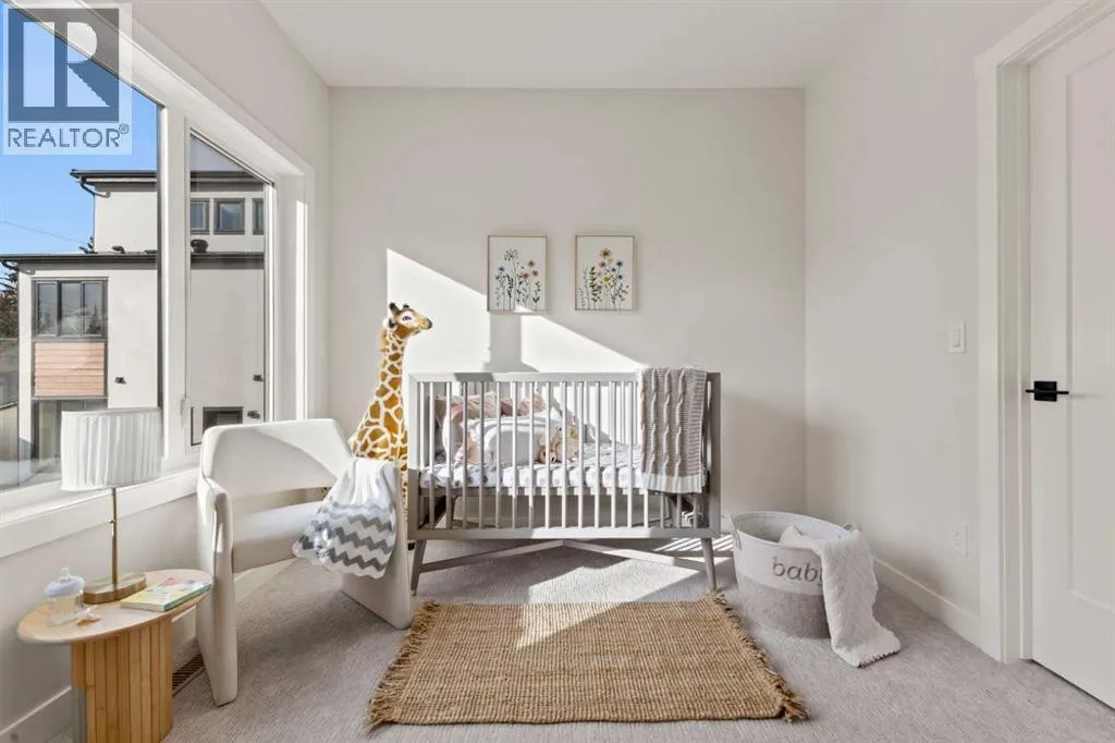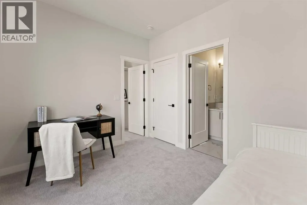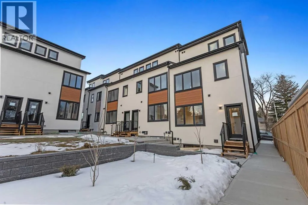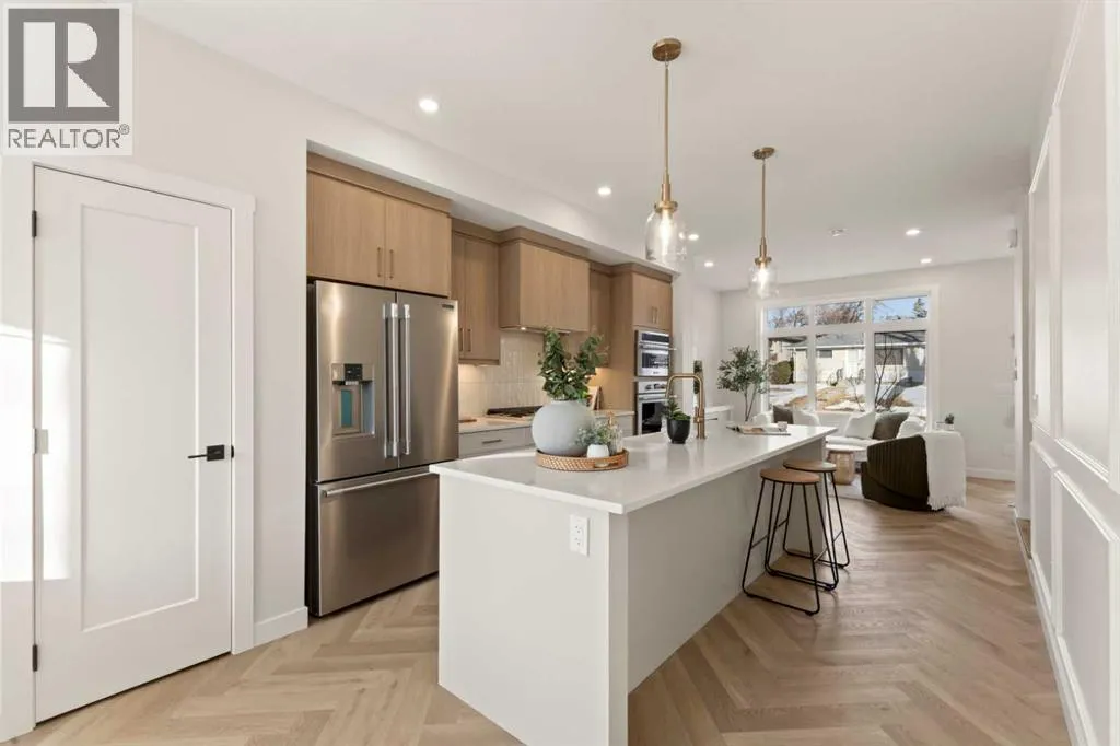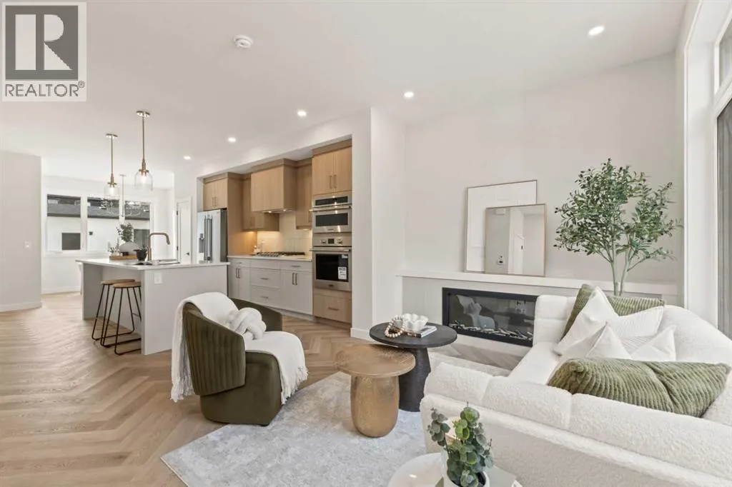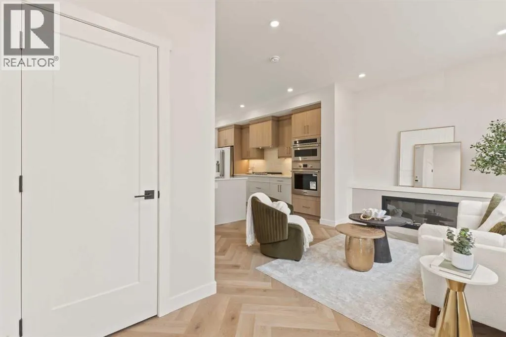 Welcome to THE SEVEN, an exclusive collection of seven luxury three-storey townhomes nestled in the heart of Glenbrook, one of Calgaryâs most sought-after inner-city communities. With 4 bedroom/4.5 bath (3 ensuites) and Designed for elevated urban living, these homes blend modern architecture, refined finishes, and thoughtful design just minutes from downtown.Step inside to a spacious main floor where a generous living room welcomes you with striking herringbone flooring flowing throughout and a beautifully tiled fireplace that creates a warm, inviting focal point. The designer kitchen is built for both everyday living and entertaining, featuring a large statement island, built-in oven and microwave, gas cooktop, and a pantry for seamless storage. The adjacent dining area offers the perfect setting for hosting dinners or relaxed family meals, while the stylish powder room delivers a boutique-hotel inspired feel for guests. A functional mudroom is tucked away at the rear, offering a separate entrance to the backyard and detached garage.The second level features two expansive bedrooms, each with its own private ensuite and walk-in closet, providing comfort and privacy for family or guests. A dedicated laundry room with additional cabinetry adds convenience and smart storage.Occupying the entire third floor, the grand primary retreat is a true sanctuary. Enjoy vaulted ceilings, elegant wall sconces, and a statement hanging chandelier above the bed, along with direct access to a private balcony perfect for morning coffee or evening relaxation. The spa-inspired ensuite features a dual vanity, stunning tile work, and a glass-enclosed shower, while the walk-in closet is finished with custom shelving and built-in cabinetry.The fully developed basement expands the living space with a large recreation room, stylish wet bar with under-cabinet lighting to set the mood, an additional bedroom, and a full bathroomâideal for guests, entertaining, or movie nights.Outside, residents enjoy a shared landscaped green space leading to a detached garage, while the homeâs exterior showcases a modern stucco façade accented with warm orange Hardie board details for striking curb appeal.Located in the vibrant community of Glenbrook, youâre just a short drive to downtown Calgary while enjoying the charm of established inner-city living, with nearby parks, schools, restaurants, and everyday amenities all within easy reach.Experience sophisticated design, modern comfort, and urban convenience at THE SEVEN. (id:27476)
