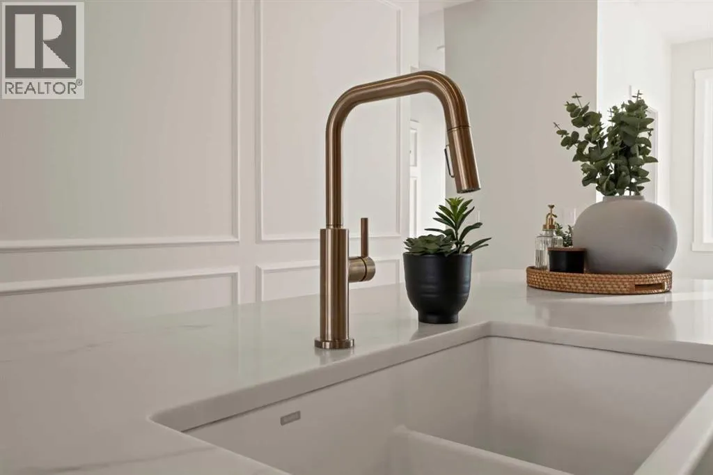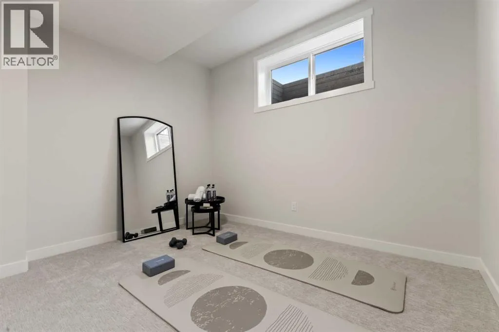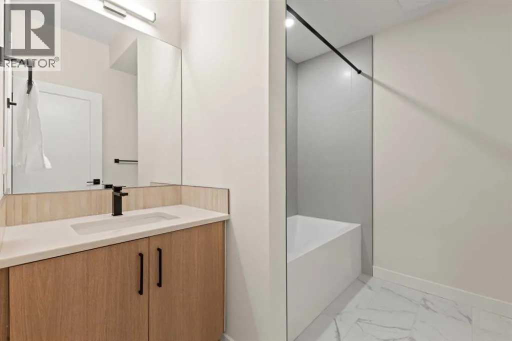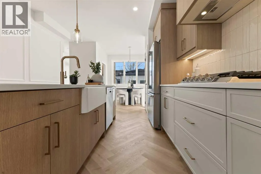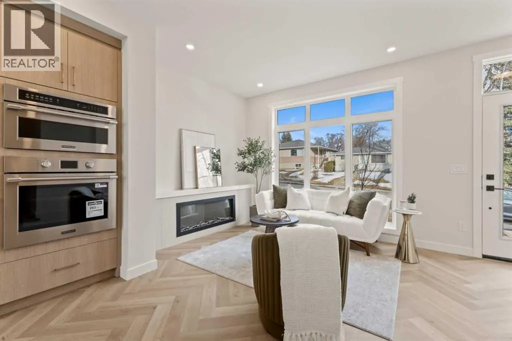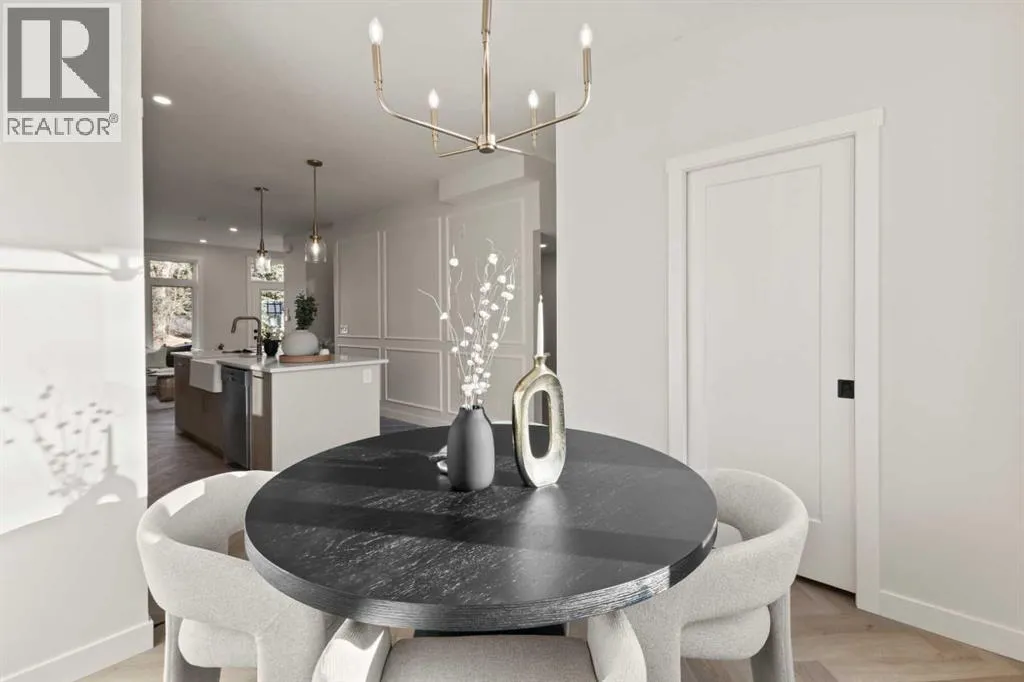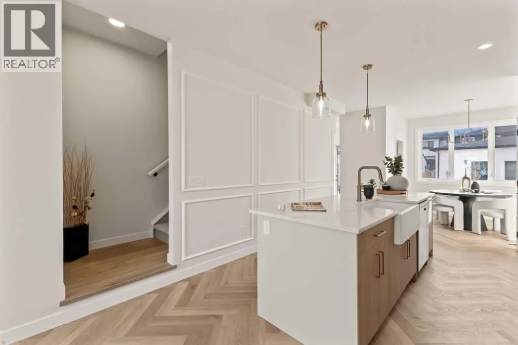 Welcome to THE SEVEN, an exclusive collection of seven luxury three-storey townhomes nestled in the heart of Glenbrook, one of Calgaryâs most sought-after inner-city communities. With 4 bedroom/4.5 bath (3 ensuites) and Designed for elevated urban living, these homes blend modern architecture, refined finishes, and thoughtful design just minutes from downtown.Step inside to a spacious main floor where a generous living room welcomes you with striking herringbone flooring flowing throughout and a beautifully tiled fireplace that creates a warm, inviting focal point. The designer kitchen is built for both everyday living and entertaining, featuring a large statement island, built-in oven and microwave, gas cooktop, and a pantry for seamless storage. The adjacent dining area offers the perfect setting for hosting dinners or relaxed family meals, while the stylish powder room delivers a boutique-hotel inspired feel for guests. A functional mudroom is tucked away at the rear, offering a separate entrance to the backyard and detached garage.The second level features two expansive bedrooms, each with its own private ensuite and walk-in closet, providing comfort and privacy for family or guests. A dedicated laundry room with additional cabinetry adds convenience and smart storage.Occupying the entire third floor, the grand primary retreat is a true sanctuary. Enjoy vaulted ceilings, elegant wall sconces, and a statement hanging chandelier above the bed, along with direct access to a private balcony perfect for morning coffee or evening relaxation. The spa-inspired ensuite features a dual vanity, stunning tile work, and a glass-enclosed shower, while the walk-in closet is finished with custom shelving and built-in cabinetry.The fully developed basement expands the living space with a large recreation room, stylish wet bar with under-cabinet lighting to set the mood, an additional bedroom, and a full bathroomâideal for guests, entertaining, or movie nights.Outside, residents enjoy a shared landscaped green space leading to a detached garage, while the homeâs exterior showcases a modern stucco façade accented with warm orange Hardie board details for striking curb appeal.Located in the vibrant community of Glenbrook, youâre just a short drive to downtown Calgary while enjoying the charm of established inner-city living, with nearby parks, schools, restaurants, and everyday amenities all within easy reach.Experience sophisticated design, modern comfort, and urban convenience at THE SEVEN. (id:27476)