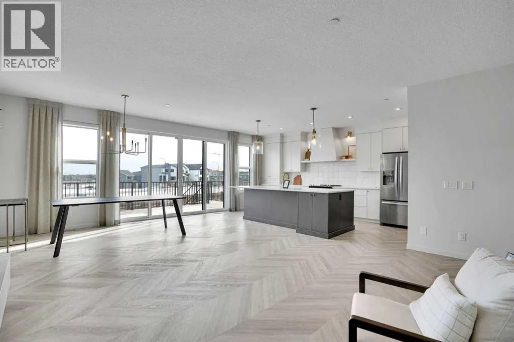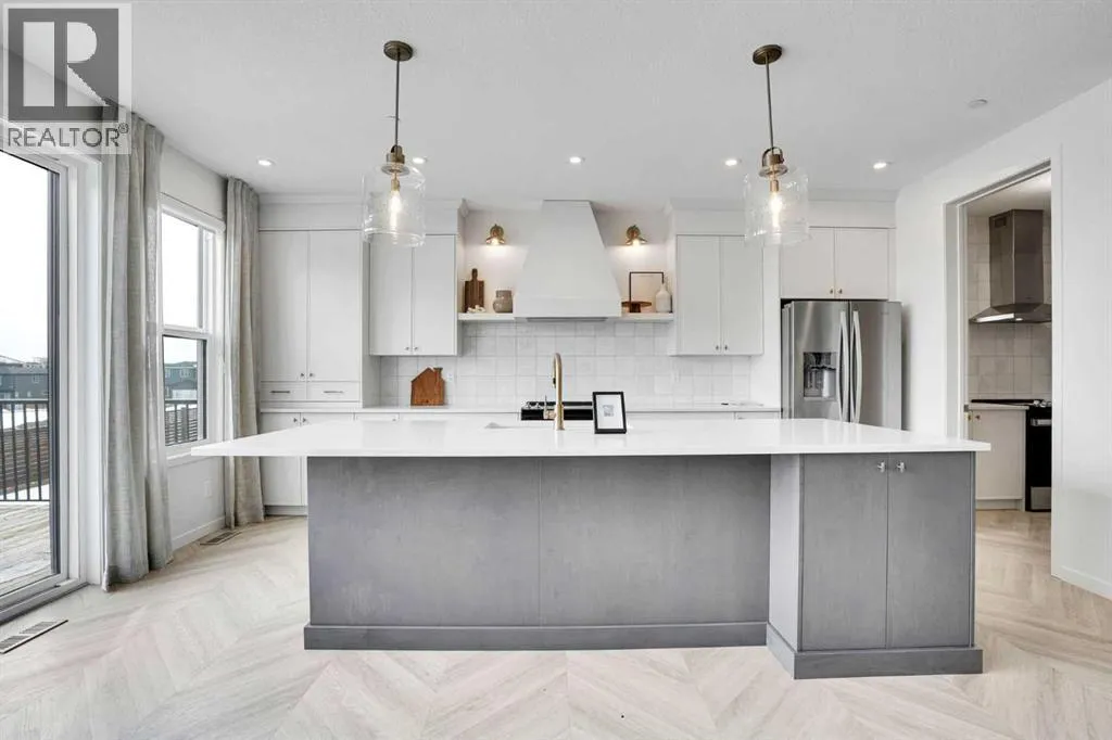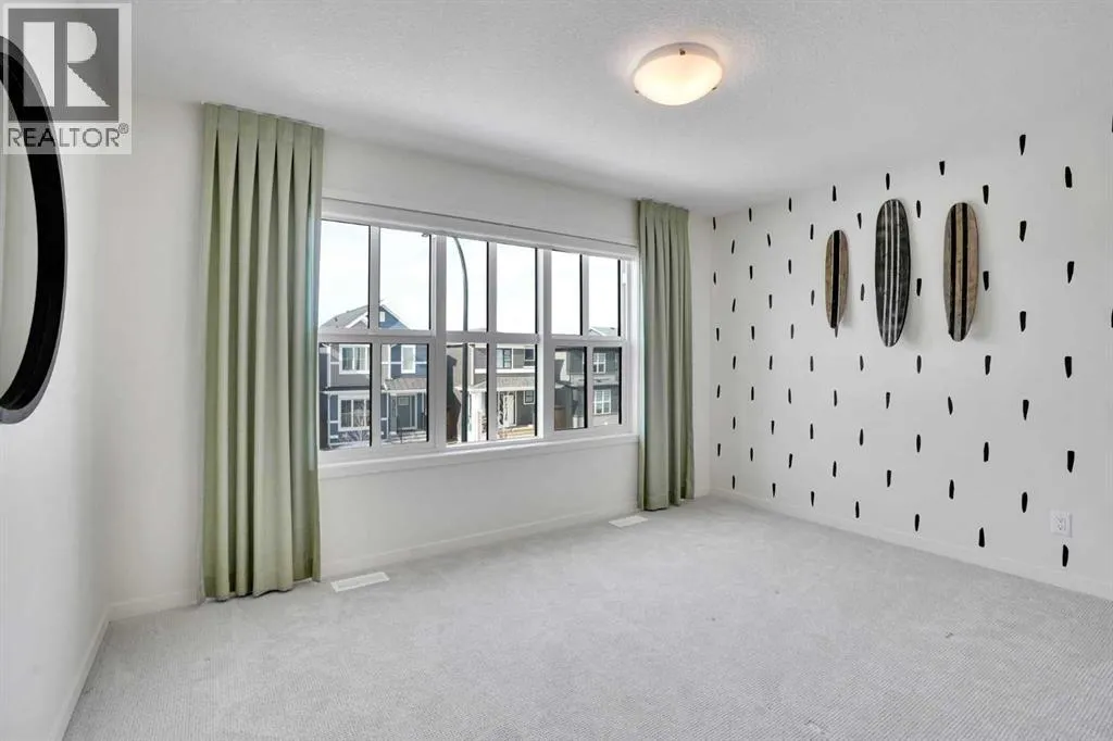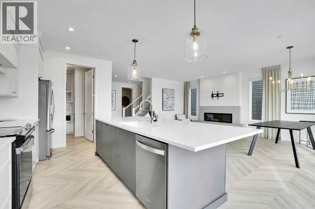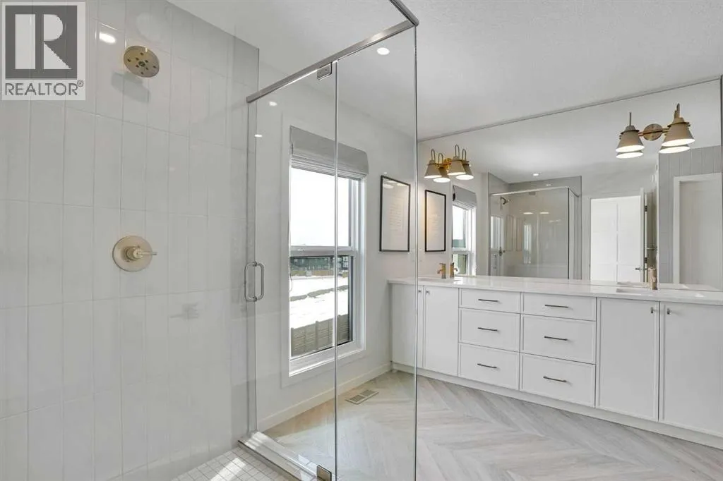 Nestled in the vibrant and family-friendly community of Livingston, this stunning former show home built by Cedarglen Homes has never been lived in and showcases exceptional craftsmanship, high-end upgrades, and thoughtful design throughout. Step inside to discover a bright open-concept main floor featuring soaring 8â interior doors, luxury vinyl plank flooring, and elegant finishes that create a warm yet sophisticated atmosphere. Huge windows throughout the open-concept living space bring in an abundance of natural sunlight, creating a bright and welcoming environment. The inviting living room features a beautiful vertical shiplap feature wall with a tiled electric fireplace, blending modern style with cozy comfort. The chef-inspired kitchen is both functional and impressive with quartz countertops, two-tone cabinetry, a large central island, and in addition to the main kitchen, there is a separate spice kitchen that provides extra prep and cooking space. The dining nook opens onto an oversized deck, perfect for summer BBQs, entertaining guests, or relaxing outdoors. A main floor bedroom and full bathroom provide flexibility for guests, a home office, or multi-generational living. Upstairs, the primary retreat offers a spa-inspired ensuite with a custom tiled shower, soaker tub with tile ledges, dual sinks, quartz countertops, and a spacious walk-in closet, while three additional generously sized bedrooms provide plenty of space for family or guests. The upper level also includes a convenient laundry room and a beautiful, cozy bonus room ideal for relaxing or spending time with family. Every detail of this home reflects quality and thoughtful upgrades, including upgraded lighting, designer hardware, and an installed security system. Outside, enjoy the completed oversized deck while taking in the peaceful surroundings of Livingston. Residents also enjoy access to the impressive Livingston Hub, a state-of-the-art facility featuring a skating rink, splash park, gymnas ium, tennis courts, and event spaces, along with numerous parks, playgrounds, and pathways throughout the neighbourhood, with convenient access to Stoney Trail and Deerfoot Trail for easy commuting. Move-in ready and never lived in, this exceptional show home offers the perfect combination of designer elegance, everyday functionality, and outstanding value. (id:27476)