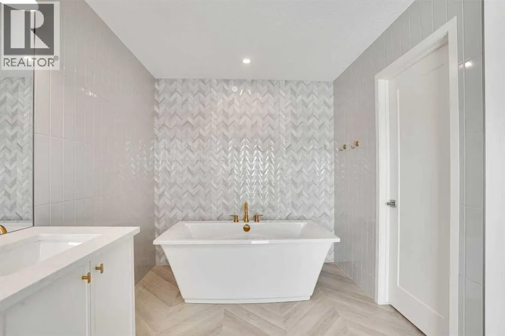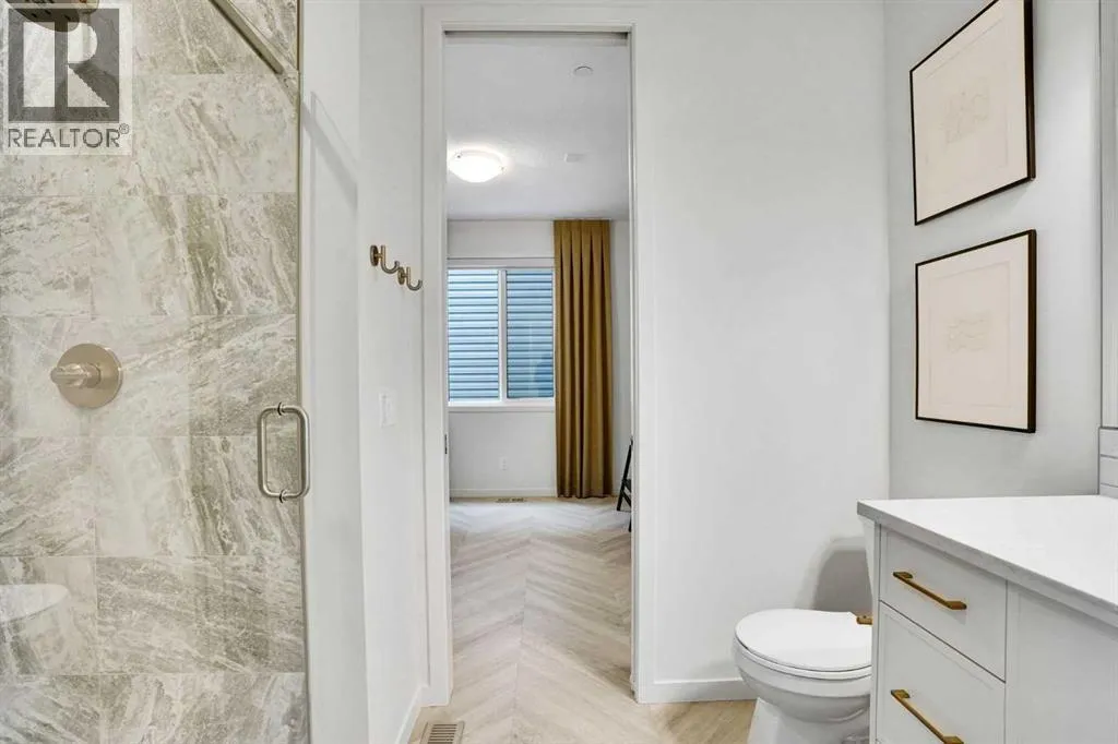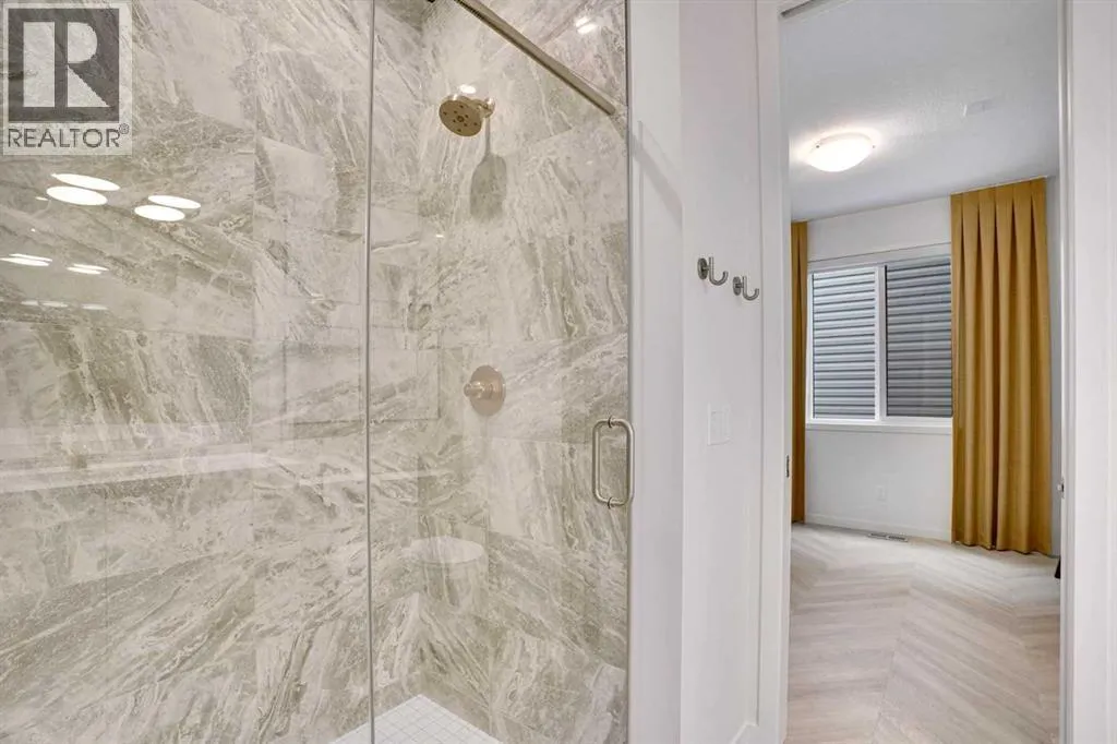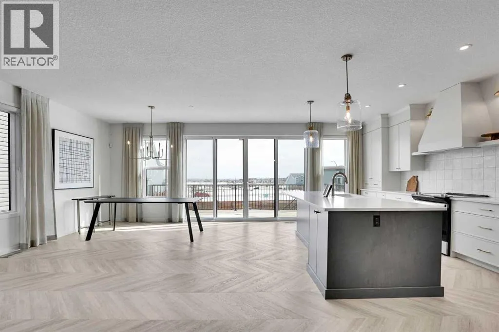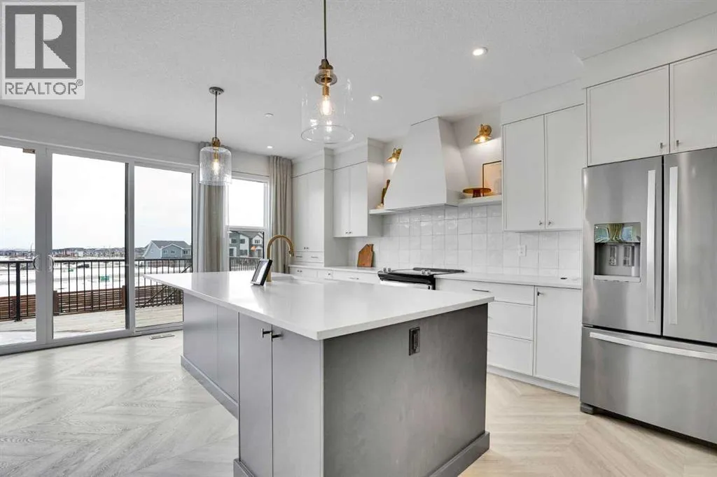 Nestled in the vibrant and family-friendly community of Livingston, this stunning former show home built by Cedarglen Homes has never been lived in and showcases exceptional craftsmanship, high-end upgrades, and thoughtful design throughout. Step inside to discover a bright open-concept main floor featuring soaring 8â interior doors, luxury vinyl plank flooring, and elegant finishes that create a warm yet sophisticated atmosphere. Huge windows throughout the open-concept living space bring in an abundance of natural sunlight, creating a bright and welcoming environment. The inviting living room features a beautiful vertical shiplap feature wall with a tiled electric fireplace, blending modern style with cozy comfort. The chef-inspired kitchen is both functional and impressive with quartz countertops, two-tone cabinetry, a large central island, and in addition to the main kitchen, there is a separate spice kitchen that provides extra prep and cooking space. The dining nook opens onto an oversized deck, perfect for summer BBQs, entertaining guests, or relaxing outdoors. A main floor bedroom and full bathroom provide flexibility for guests, a home office, or multi-generational living. Upstairs, the primary retreat offers a spa-inspired ensuite with a custom tiled shower, soaker tub with tile ledges, dual sinks, quartz countertops, and a spacious walk-in closet, while three additional generously sized bedrooms provide plenty of space for family or guests. The upper level also includes a convenient laundry room and a beautiful, cozy bonus room ideal for relaxing or spending time with family. Every detail of this home reflects quality and thoughtful upgrades, including upgraded lighting, designer hardware, and an installed security system. Outside, enjoy the completed oversized deck while taking in the peaceful surroundings of Livingston. Residents also enjoy access to the impressive Livingston Hub, a state-of-the-art facility featuring a skating rink, splash park, gymnas ium, tennis courts, and event spaces, along with numerous parks, playgrounds, and pathways throughout the neighbourhood, with convenient access to Stoney Trail and Deerfoot Trail for easy commuting. Move-in ready and never lived in, this exceptional show home offers the perfect combination of designer elegance, everyday functionality, and outstanding value. (id:27476)