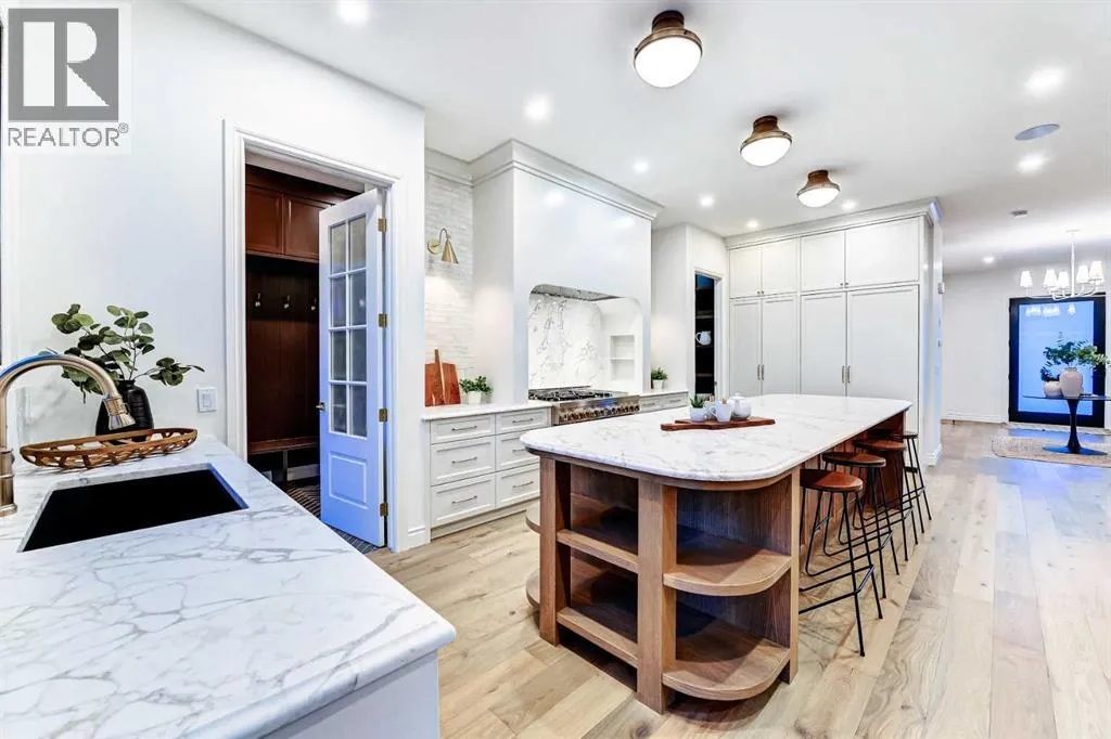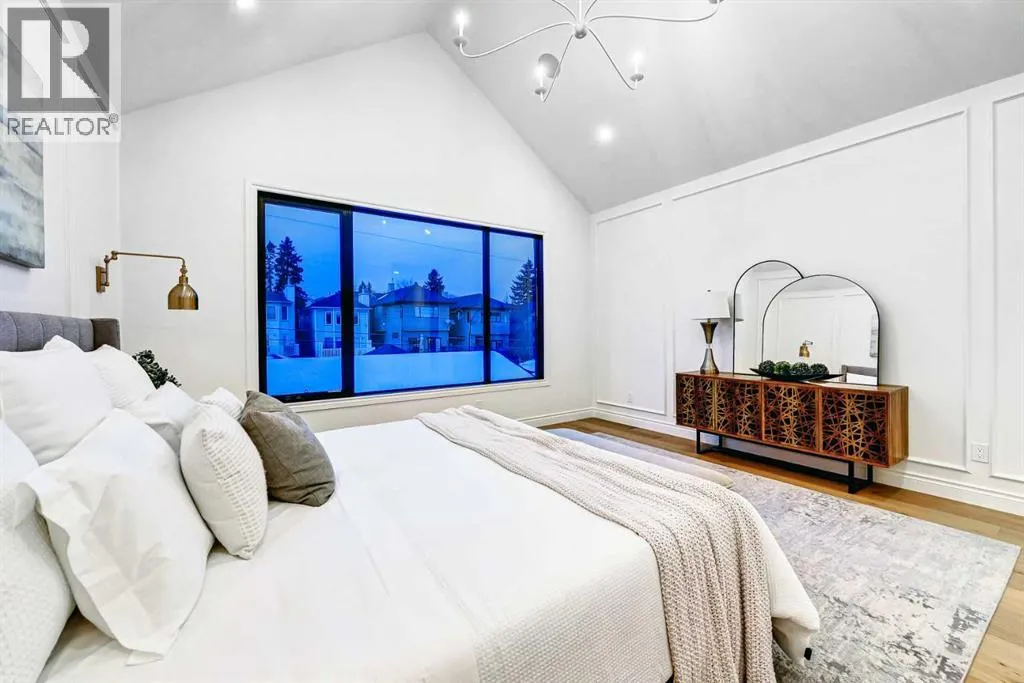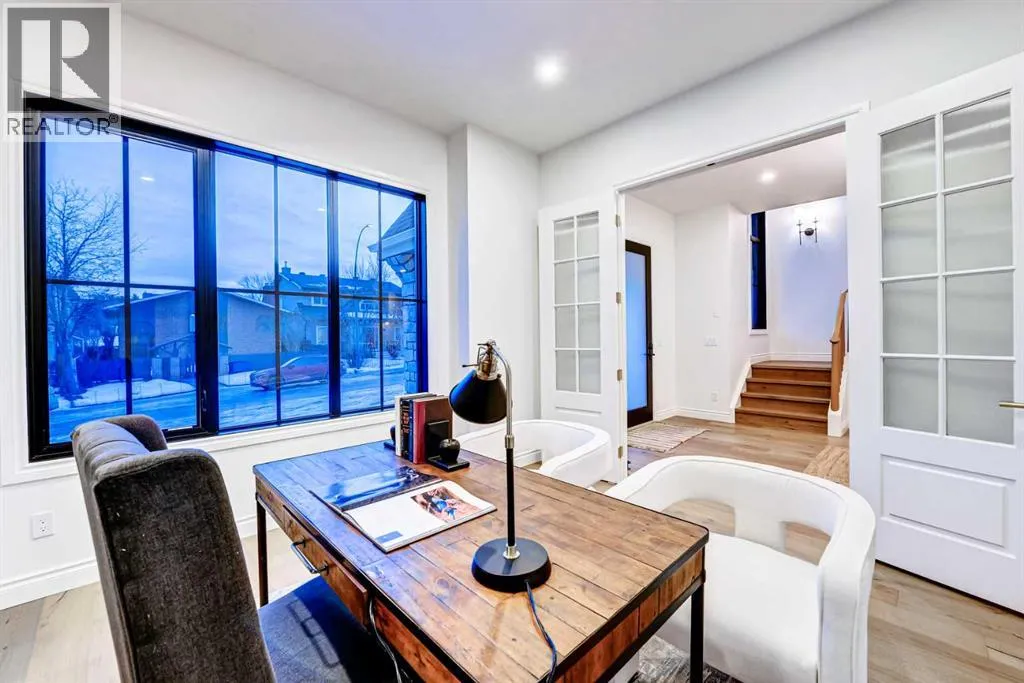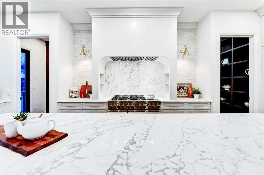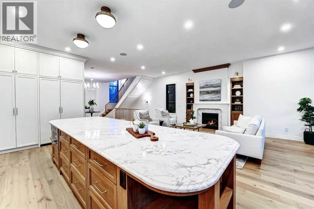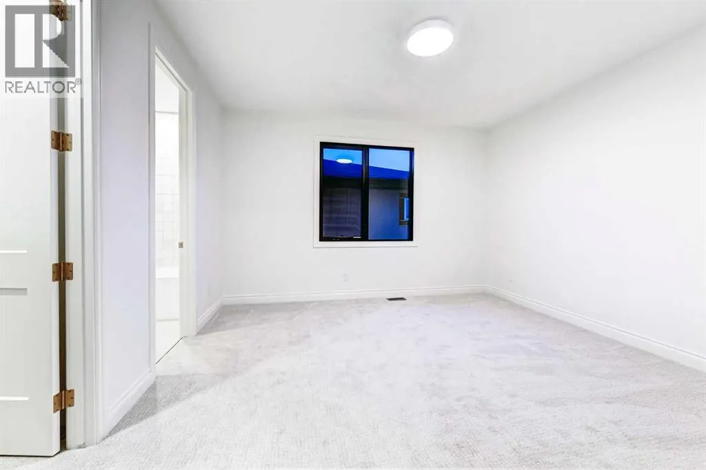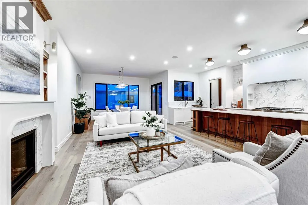 Set on a quiet street in the heart of Marda Loop, The Bardot is an exceptional custom residence that blends refined French-Country character with contemporary luxury. Thoughtfully designed and built by Cedar Rock Homes with interiors curated by Aly Velji Designs, this home offers four bedrooms, 4.5 bathrooms, and a rare triple-car garage. The striking exterior showcases a sophisticated mix of stone, stucco, and Hardie panel, accented by an aluminum cedar soffit entry, statement front door, and custom aluminum Lux windows with black interior cladding. The fully landscaped and fenced backyard is designed for low-maintenance enjoyment and features a generous composite patio with aluminum and glass railing, creating a private outdoor retreat. Inside, wide plank white oak engineered hardwood flooring flows throughout all levels, complemented by solid core doors and custom site-built cabinetry with wood dovetail drawers. Soaring 10-foot ceilings on the main floor and 9-foot ceilings on both the upper and lower levels enhance the homeâs bright and open feel. The main living area is anchored by a cozy gas fireplace and transitions seamlessly into the chef-inspired kitchen featuring a premium JennAir appliance package, including a 48-inch gas range, 48-inch panelled refrigerator, panelled dishwasher, and a microwave drawer integrated into the island with additional storage on both sides. A curved quartz slab island, custom cabinetry, and a bespoke hood fan create a stunning focal point, while the adjacent butlerâs pantry adds extended storage and elevated lighting. The dining space is highlighted by a custom oak sideboard, and a spacious mudroom with tailored millwork ensures everyday functionality. A private front office is thoughtfully designed with French doors, floor plugs, and custom glass-front cabinetry. Upstairs, three generously sized bedrooms each feature walk-in closets and private ensuites with heated tile flooring. The primary retreat is highlighted by vaulted c eilings and a spa-inspired ensuite complete with an oversized steam shower with dual rain heads, a freestanding tub, solid slab stone backsplash, and custom hanging mirrors. A beautifully finished upper-level laundry room with sink, hanging rod, and custom cabinetry completes the floor. The fully finished basement expands the living space with a gym, TV and games area, wet bar with beverage fridge, full bathroom, and ample storage. Mechanically, the home is equipped with dual-zone high-efficiency furnaces with humidifiers, along with rough-ins for in-floor basement heating, air conditioning, central vacuum, speakers, security system, and exterior cameras. Every detail of The Bardot reflects intentional design, superior craftsmanship, and timeless appeal, all just steps from Marda Loopâs vibrant shops, restaurants, parks, schools, and only minutes from downtown Calgary. (id:27476)