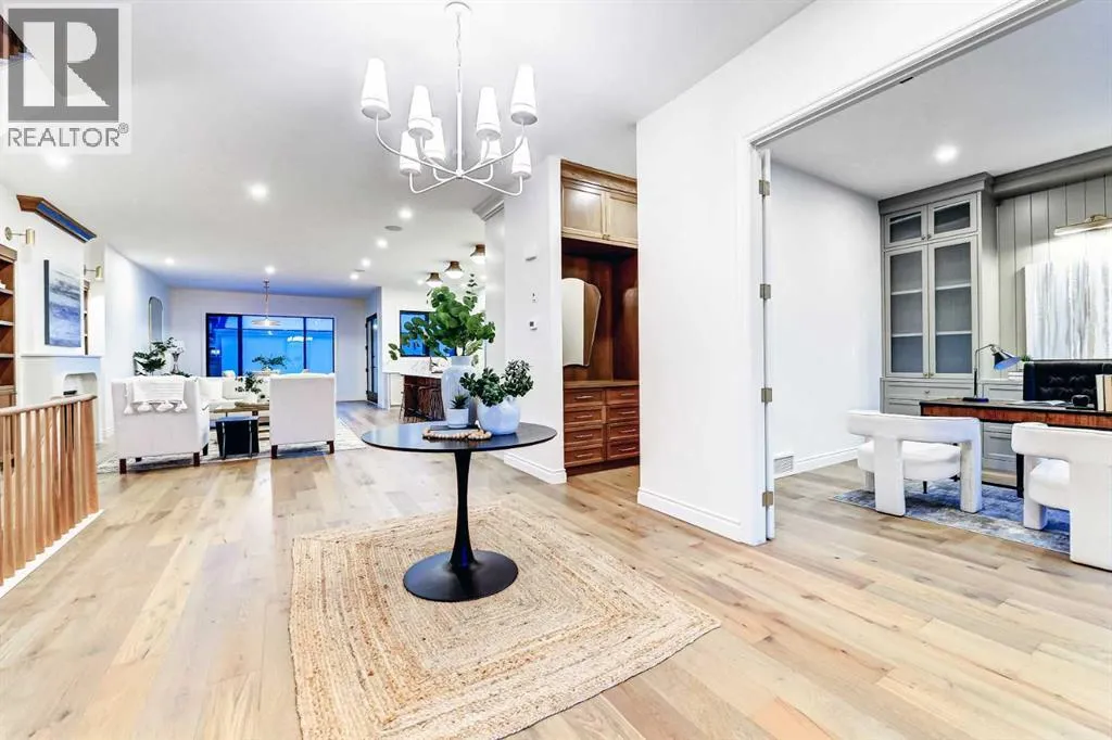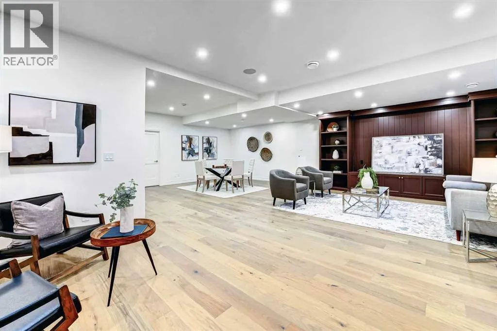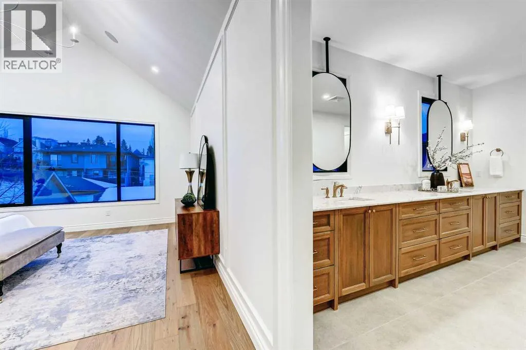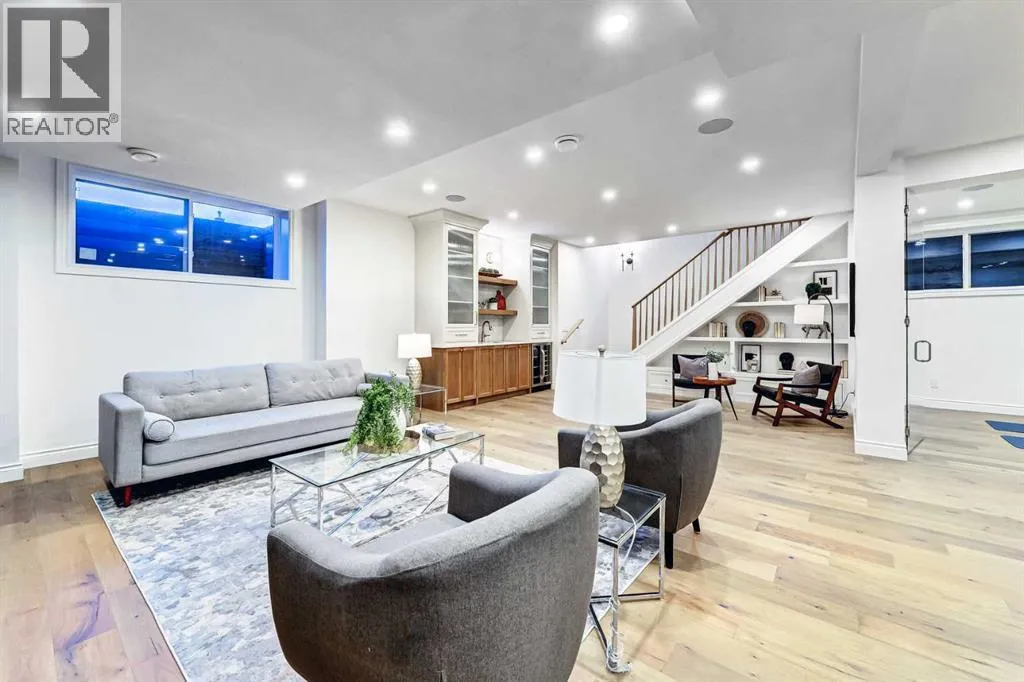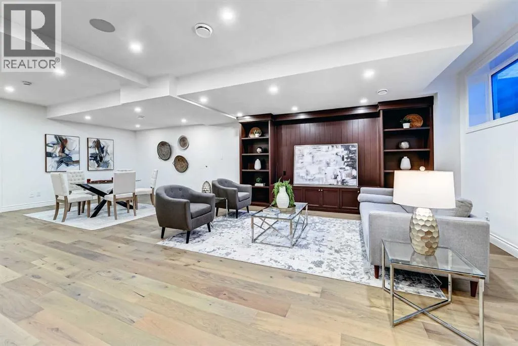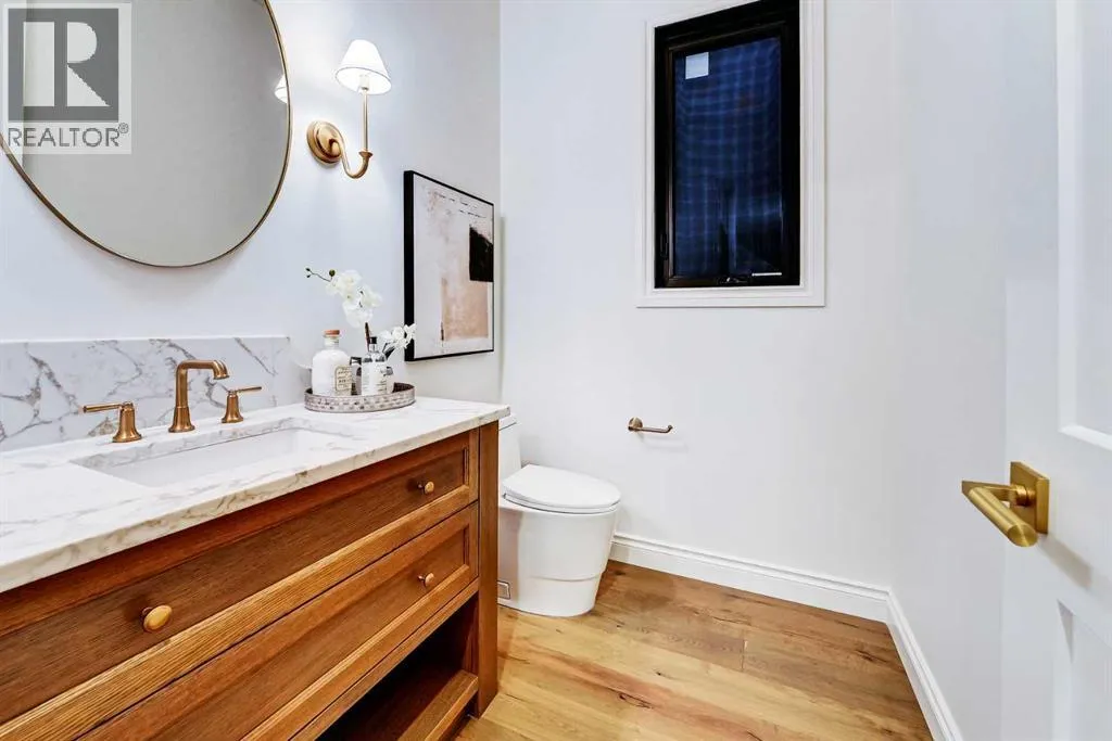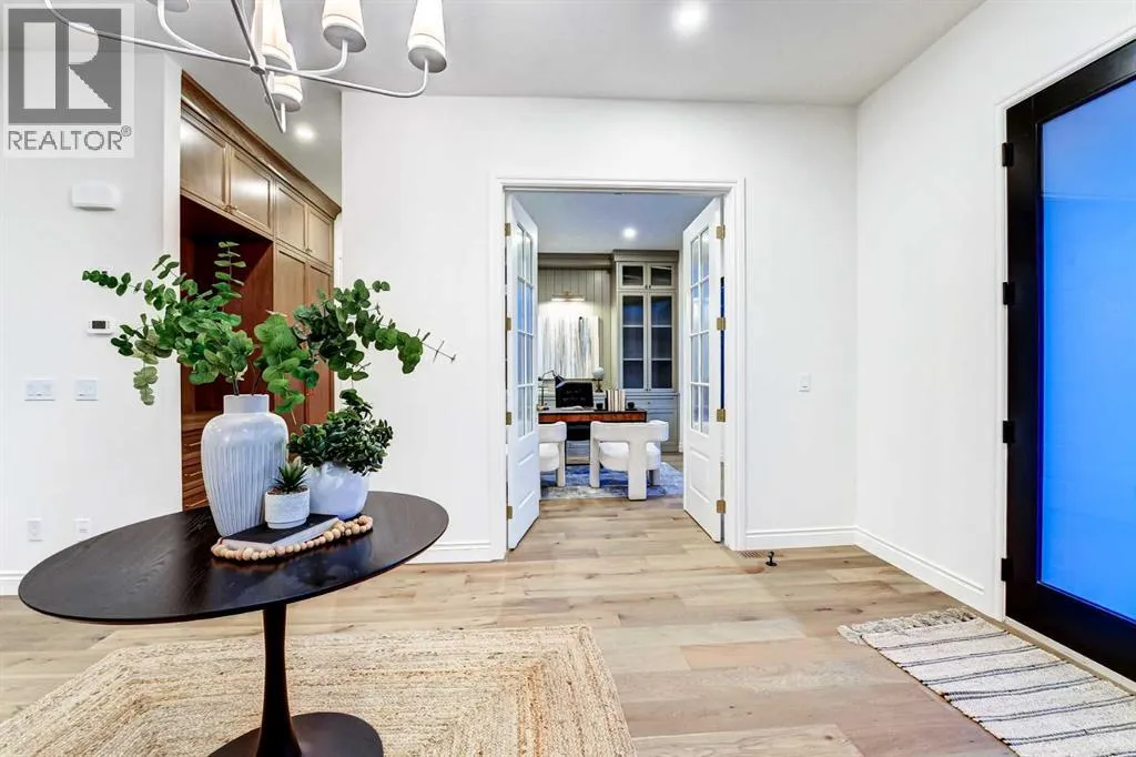 Set on a quiet street in the heart of Marda Loop, The Bardot is an exceptional custom residence that blends refined French-Country character with contemporary luxury. Thoughtfully designed and built by Cedar Rock Homes with interiors curated by Aly Velji Designs, this home offers four bedrooms, 4.5 bathrooms, and a rare triple-car garage. The striking exterior showcases a sophisticated mix of stone, stucco, and Hardie panel, accented by an aluminum cedar soffit entry, statement front door, and custom aluminum Lux windows with black interior cladding. The fully landscaped and fenced backyard is designed for low-maintenance enjoyment and features a generous composite patio with aluminum and glass railing, creating a private outdoor retreat. Inside, wide plank white oak engineered hardwood flooring flows throughout all levels, complemented by solid core doors and custom site-built cabinetry with wood dovetail drawers. Soaring 10-foot ceilings on the main floor and 9-foot ceilings on both the upper and lower levels enhance the homeâs bright and open feel. The main living area is anchored by a cozy gas fireplace and transitions seamlessly into the chef-inspired kitchen featuring a premium JennAir appliance package, including a 48-inch gas range, 48-inch panelled refrigerator, panelled dishwasher, and a microwave drawer integrated into the island with additional storage on both sides. A curved quartz slab island, custom cabinetry, and a bespoke hood fan create a stunning focal point, while the adjacent butlerâs pantry adds extended storage and elevated lighting. The dining space is highlighted by a custom oak sideboard, and a spacious mudroom with tailored millwork ensures everyday functionality. A private front office is thoughtfully designed with French doors, floor plugs, and custom glass-front cabinetry. Upstairs, three generously sized bedrooms each feature walk-in closets and private ensuites with heated tile flooring. The primary retreat is highlighted by vaulted c eilings and a spa-inspired ensuite complete with an oversized steam shower with dual rain heads, a freestanding tub, solid slab stone backsplash, and custom hanging mirrors. A beautifully finished upper-level laundry room with sink, hanging rod, and custom cabinetry completes the floor. The fully finished basement expands the living space with a gym, TV and games area, wet bar with beverage fridge, full bathroom, and ample storage. Mechanically, the home is equipped with dual-zone high-efficiency furnaces with humidifiers, along with rough-ins for in-floor basement heating, air conditioning, central vacuum, speakers, security system, and exterior cameras. Every detail of The Bardot reflects intentional design, superior craftsmanship, and timeless appeal, all just steps from Marda Loopâs vibrant shops, restaurants, parks, schools, and only minutes from downtown Calgary. (id:27476)
