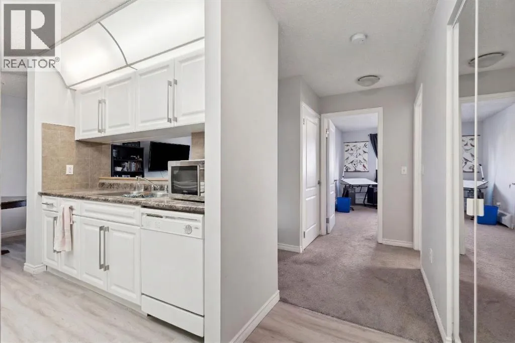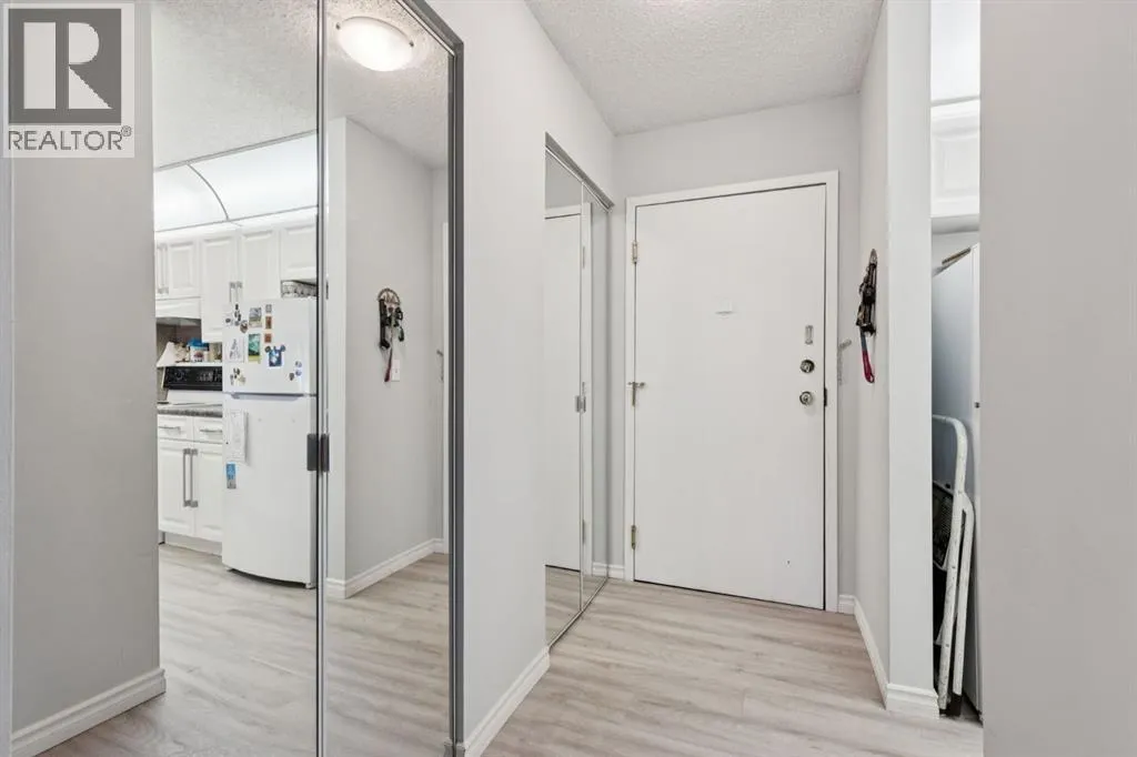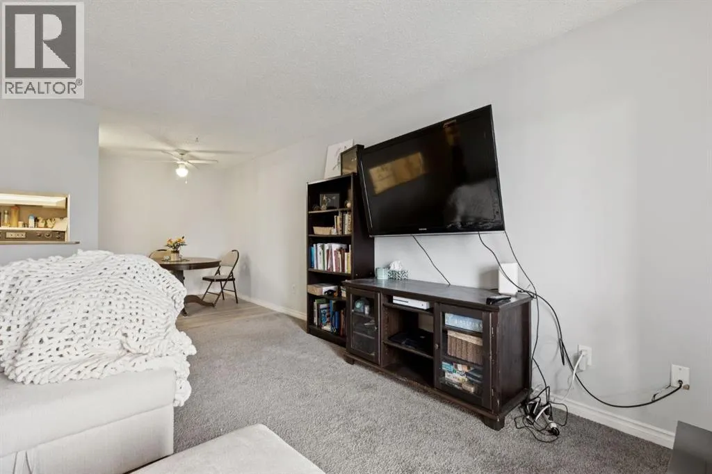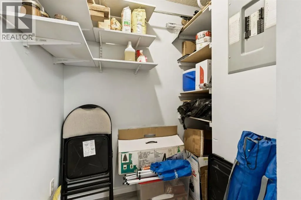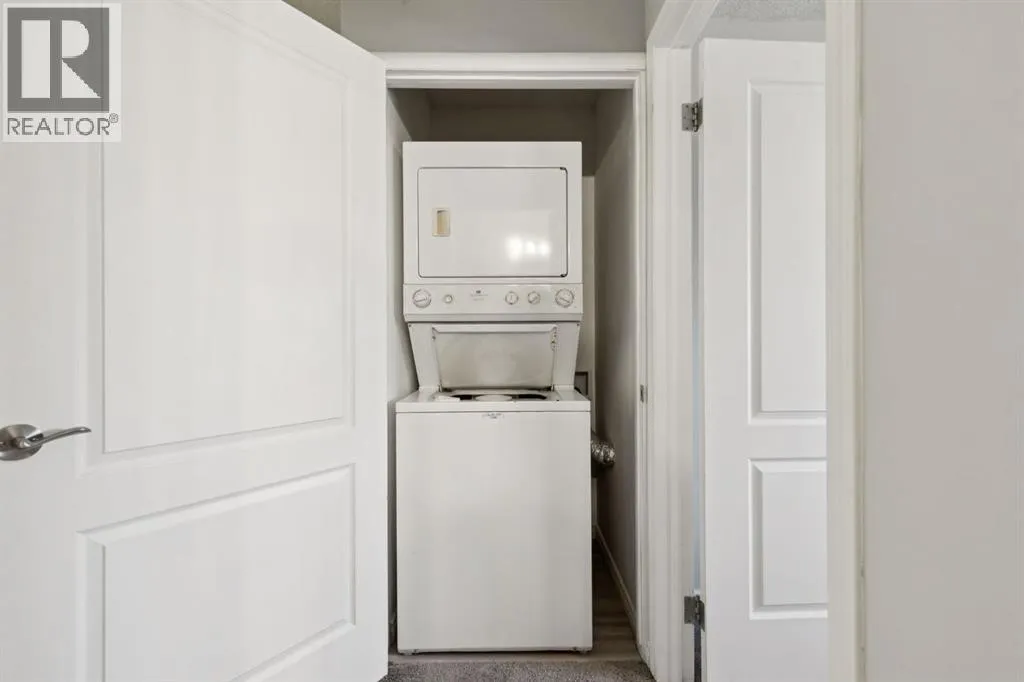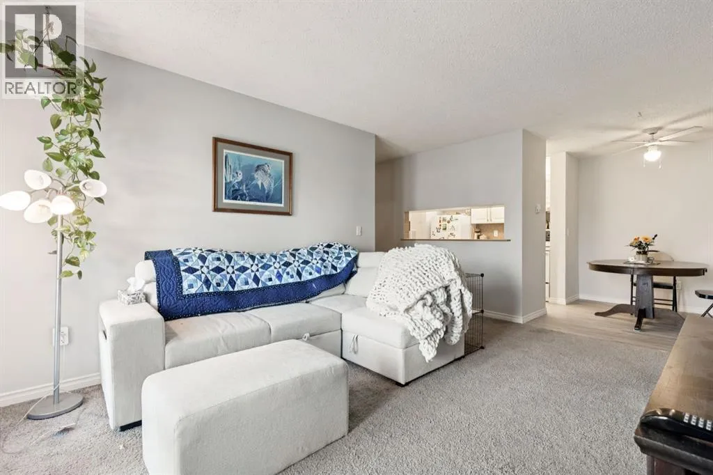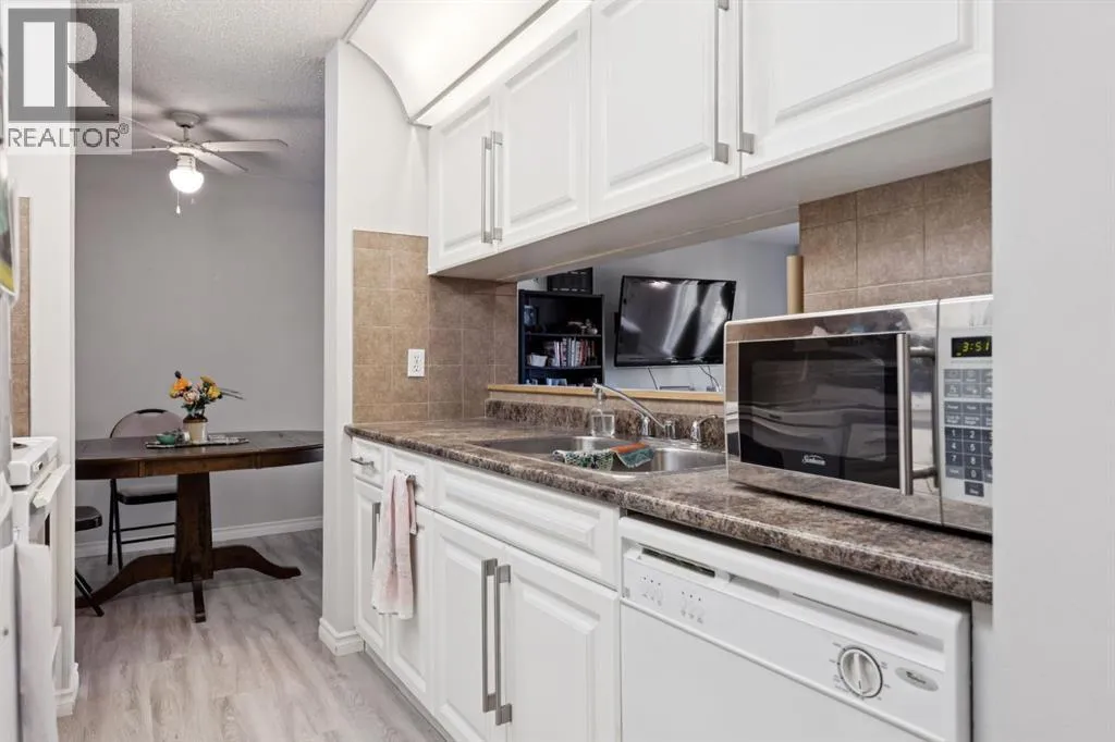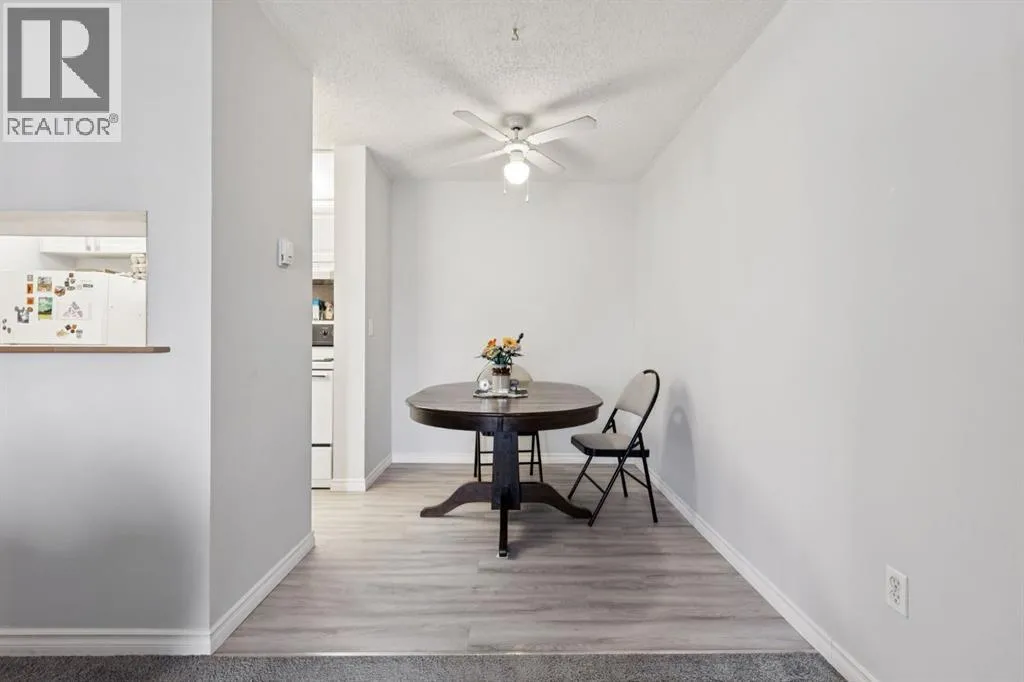 Welcome to this bright and beautifully maintained 1bedroom, 1 bathroom condominium featuring an large, private balcony where you can enjoy sunny mornings and comfortable shade in the afternoon.The thoughtfully designed kitchen features full height cabinetry with elegant over cabinet lighting for a clean European inspired look, along with ample countertop space that provides plenty of room for cooking and entertaining. A convenient pass through to the living room allows for natural light and easy conversation while hosting.The open layout flows effortlessly into a spacious dining and living area that can comfortably accommodate a full dining suite and a variety of furniture arrangements, making it ideal for everyday living or entertaining guests. A ceiling fan with integrated lighting adds comfort to the dining space.The large bedroom easily fits a king size bed and offers a generous double closet. Additional storage is thoughtfully incorporated with a wide entry closet and a separate storage room. The stacked washer and dryer are tucked neatly into their own closet just outside the bedroom for added convenience.This fourth-floor home is filled with natural morning light and features stylish laminate flooring, a private covered balcony, and excellent in suite storage. Low monthly condo fees include heat, water, sewer, insurance, professional management, reserve fund contributions, snow removal, landscaping, parking, and common area maintenance.The location offers exceptional convenience with quick access to Peigan Trail, Deerfoot Trail, and the new Ring Road system, while still being just minutes from downtown Calgary. Shopping, schools, parks, and playgrounds are all within walking distance, and a bus stop is conveniently located directly in front of the building.Additional features include an assigned parking stall and ample visitor parking. Whether you are a first-time buyer, downsizer, or investor, this well-kept home presents a fantastic opportunity in a h ighly accessible location. This suite is excellent value, reach out today to book your private viewing. (id:27476)