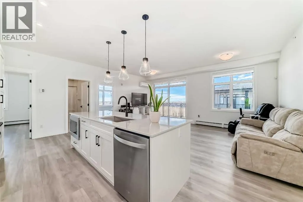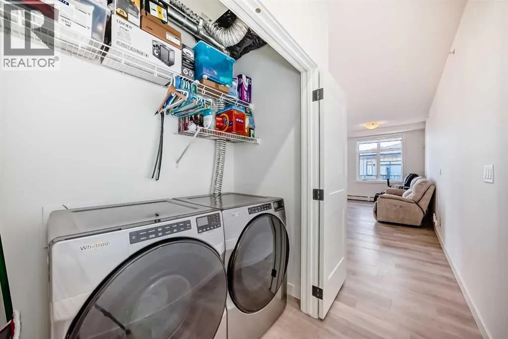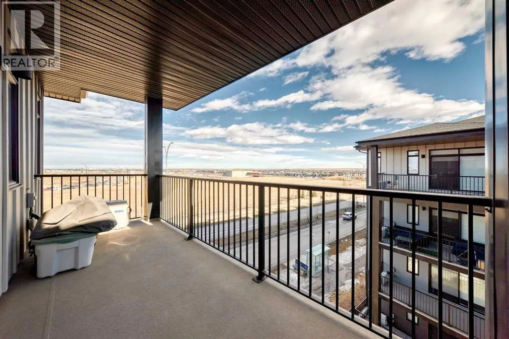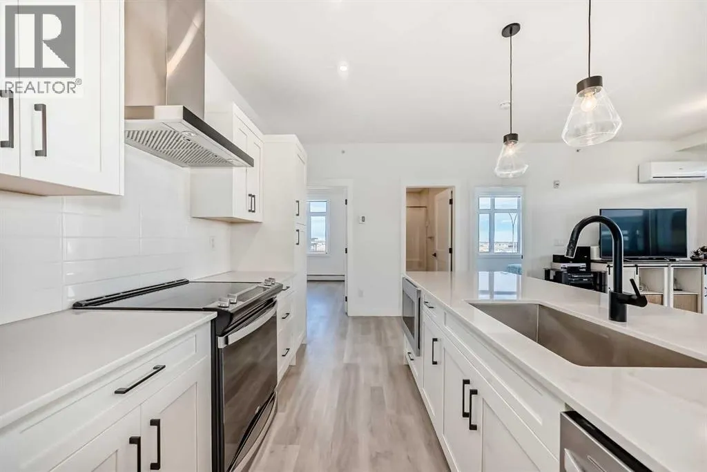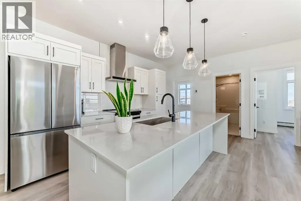 Welcome to this beautiful upgraded apartment condo unit with 2 bedrooms, 2 full baths on the top floor corner unit in the vibrant community of Seton SE area. The open concept floor plan features 9-foot ceilings, insuite laundry room with upgraded laundry doors and full side stainless steel washer & dryer, luxury vinyl plank floorings all over for easy mainternance & style, large windows offering plenty natural lights throughout. Modern white finished kitchen with high end kitchen shaker cabinetry package and soft-close doors and drawers, good size pot drawers. Upgraded stainless steel appliances and chimney style range-hood, stunning Pendant lighting and huge extended central island with Quartz countertops is perfect for preparing meals or hosting family gatherings overlooking to a spacious living room/dining room combine offering a wall-mounted air conditioner unit to keep you comfortable during hot summer days, you also have patio door step out on to your private big balcony with a gas-line for BBQ and a glimpse of the surrounding community. The bedrooms are separate by a spacious bathroom for additional privacy. The primary bedroom is a spacious retreat with a good size walkthrough closet made by Calgary California Closets company offers abundant storage for all clothing & accessories and you also have a good size 4-pc stand shower ensuite with full height tiles, ceramic tile floorings & backsplash, Quartz countertop on dual sinks and a elegant barn door to separate the primary bedroom and walkthrough closet. This unit is measured at 971 sqft by the Builder floor plan. It also comes with a fresh air in-take system, one titled underground heated parking stall and one good size assigned storage cage, both of these are located close to the elevator and stairs. This condo complex is conveniently located within walking distance to transit, HOA, the Real Candian Superstore, Save on Foods, Cinemas, Tim Hortons, various restaurants and Pubs, the South Health Campus, the largest YMCA, Library, Schools, playground, dog park and future LRT Green line. Easy access to Deerfoot Trail, Stoney Trail and to the rest of the city. This home shows better than new and priced to sell. Quick possession negotiable. Don't miss out on this chance to make this property your own! (id:27476)