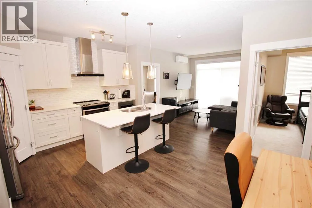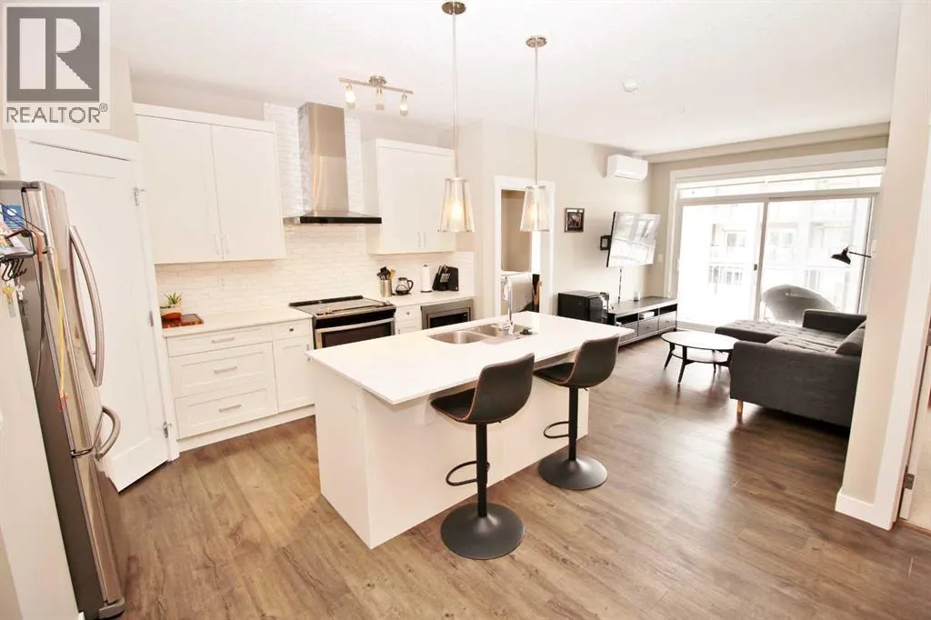 Welcome to this beautifully maintained 2 bed, 2 bath condo located in the highly sought after lake community of Auburn Bay. This bright and airy open concept home shows like new and offers a functional layout perfect for everyday living. The timeless white kitchen features stainless steel appliances, Quartz counter-tops, tiled backsplashes plus a corner pantry and large center island that overlooks the separate dining area and living room that grants access to a good sized West facing balcony. The primary bedroom easily accommodates a king size bed and offers a walk-through closet with additional built in shelving plus a 4pc ensuite with duel vanities. The second bedroom provides excellent flexibility as a guest room, home office, or fitness space and is conveniently located near the 4pc main bathroom. Additional bonuses include in-suite laundry, air conditioning, a west-facing balcony plus a heated underground titled parking stall with extra storage space. Living in Auburn Bay means exclusive access to the lake and year-round recreation including swimming, paddleboarding, skating, and community events. The neighborhood also offers scenic walking paths, parks, playgrounds, shopping, dining, proximity to South Health Campus, and easy access to major roadways. A perfect blend of comfort, style, and locationâthis exceptional condo is one you wonât want to miss. (id:27476)